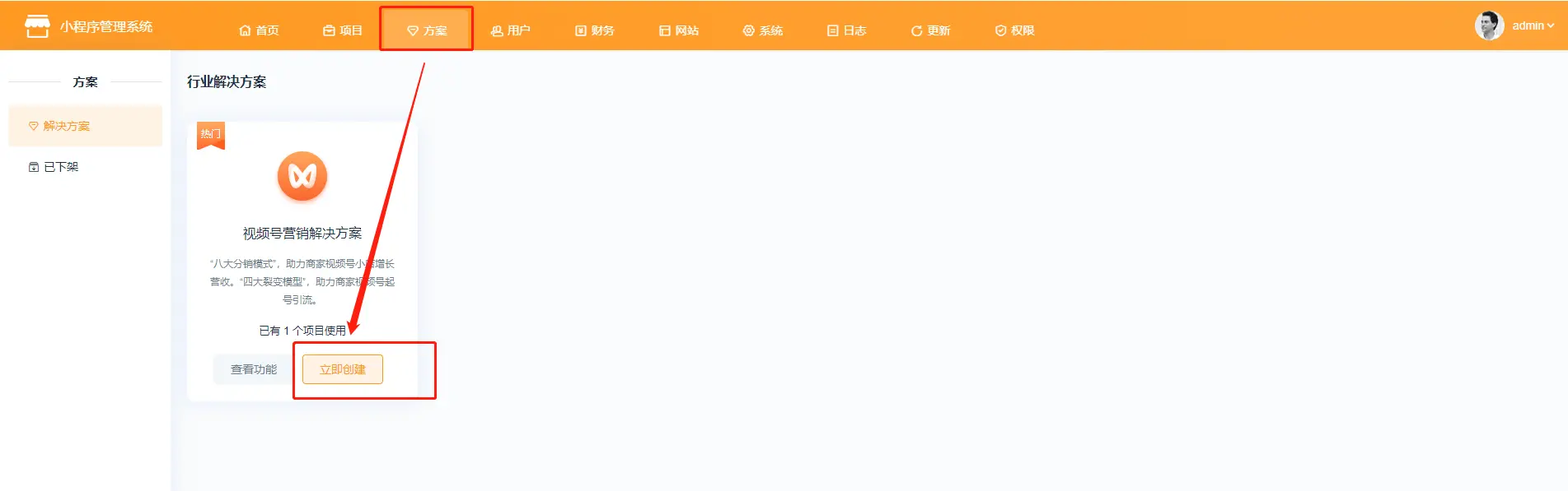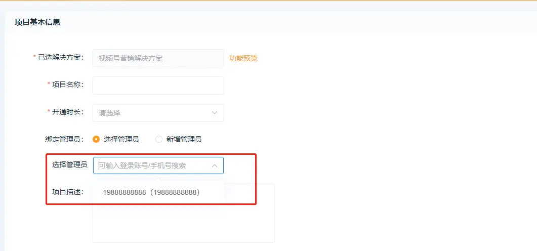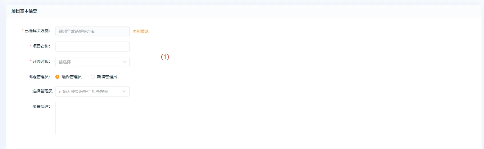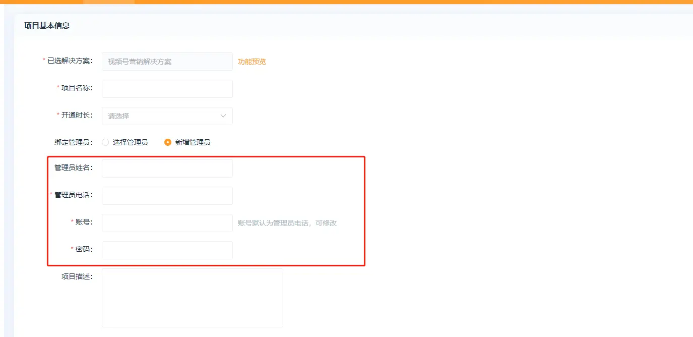 1、点击创建项目  2、跳转方案页面点击下载方案,方案下载好后点击方案,方案下载好后点击立即创建  3、点击立即创建后跳转至项目配置页面 (1)基本设置  已选解决方案:选择的系统方案,系统默认的方案不支持修改方案名称;  项目名称:自定义项目名称,举例:云上小店;  开通时长:项目的使用时长;  项目开通时长可自定义,点击方案设置—价格设置—新增规格值   绑定管理员:选择管理员,选择系统内已存在的用户作为该项目的管理员   绑定管理员:新增管理员,在系统内未添加用户的情况下,可自行新增项目管理员  项目描述:介绍或论述该个项目时综合性地简要介绍项目的基本情况 (2)客户独立配置  独立版权、独立第三方平台、独立远程附件:开启独立设置,可在项目内单独配置  短信配置:项目使用的短信是走平台配置还是项目里单独配置,短信涉及购买短信包  微信支付模式:普通模式:对接普通商户 服务商模式:对接微信支付服务商,服务商开通的特约商户收款,服务商可获得微信支付官方规则下的佣金  (3)增值服务配置  赠送平台存储空间:赠送给项目的存储空间  图片上传大小、视频上传大小:单张图片和单个视频上传的最大上限  (4)注册设置 各端统一强制绑定手机号,以手机号为身份识别标准; 各端分开不强制绑手机,各端身份分开资源统计也分开;  (5)选择平台 注:视频号分销系统目前仅支持“微信小程序”端  (6)行业系统 需勾选视频号分销总管才能使用该功能