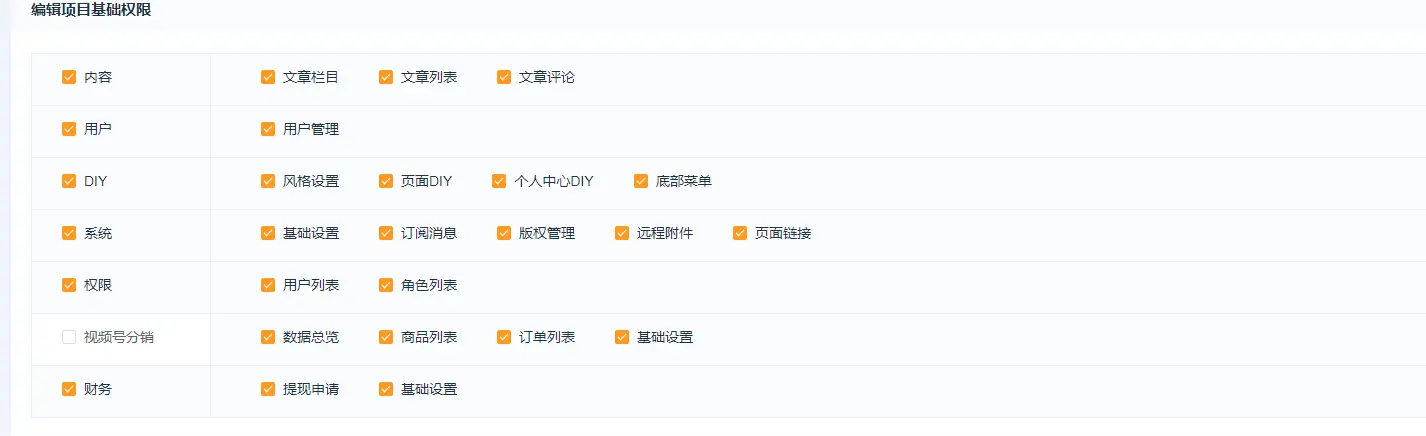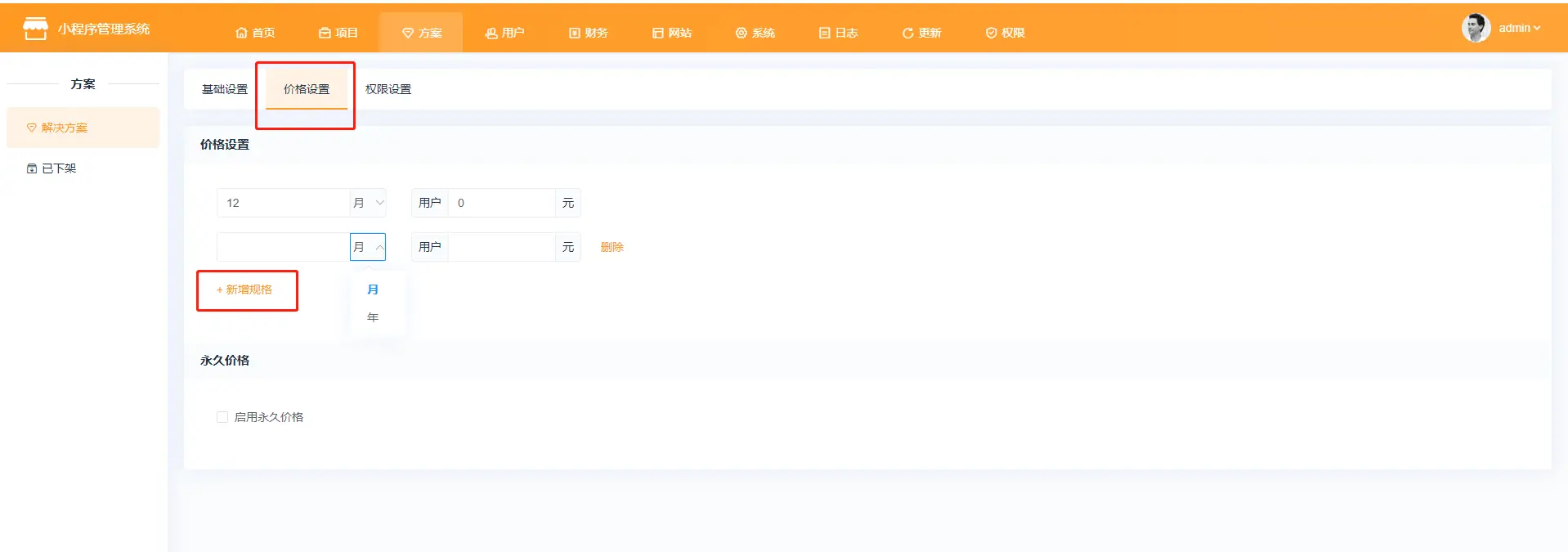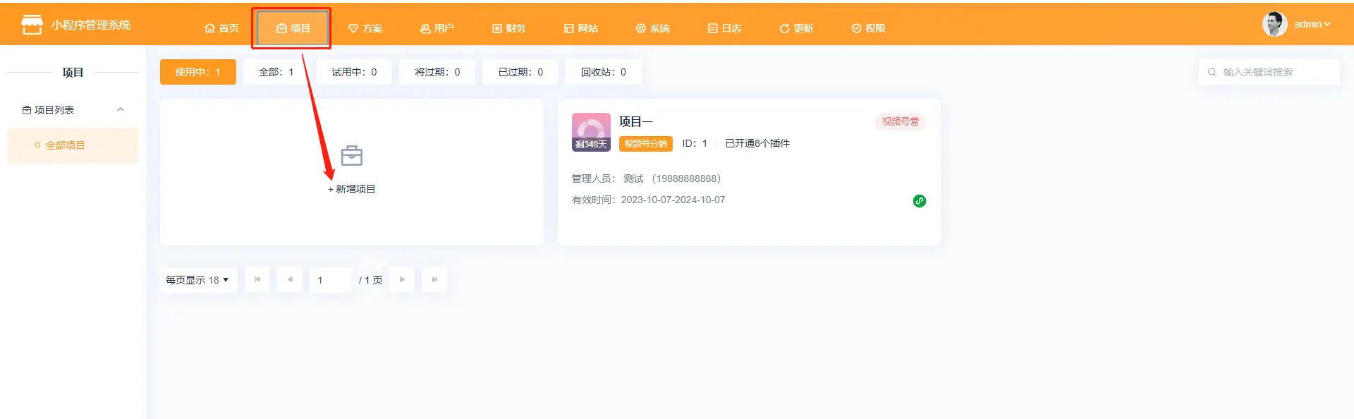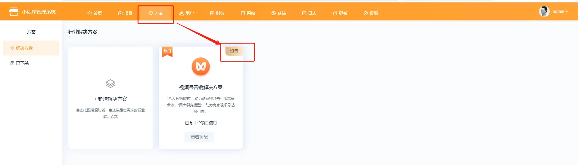 1、点击创建项目  2、跳转方案页面点击下载方案,方案下载好后点击方案,方案下载好后点击立即创建  3、点击立即创建后跳转至项目配置页面 (1)基本设置  已选解决方案:选择的系统方案,系统默认的方案不支持修改方案名称;  项目名称:自定义项目名称,举例:云上小店;  开通时长:项目的使用时长;  项目开通时长可自定义,点击方案设置—价格设置—新增规格值   绑定管理员:选择管理员,选择系统内已存在的用户作为该项目的管理员   绑定管理员:新增管理员,在系统内未添加用户的情况下,可自行新增项目管理员  项目描述:介绍或论述该个项目时综合性地简要介绍项目的基本情况 (2)客户独立配置  独立版权、独立第三方平台、独立远程附件:开启独立设置,可在项目内单独配置  短信配置:项目使用的短信是走平台配置还是项目里单独配置,短信涉及购买短信包  微信支付模式:普通模式:对接普通商户 服务商模式:对接微信支付服务商,服务商开通的特约商户收款,服务商可获得微信支付官方规则下的佣金  (3)增值服务配置  赠送平台存储空间:赠送给项目的存储空间  图片上传大小、视频上传大小:单张图片和单个视频上传的最大上限  (4)注册设置 各端统一强制绑定手机号,以手机号为身份识别标准; 各端分开不强制绑手机,各端身份分开资源统计也分开;  (5)选择平台 注:视频号分销系统目前仅支持“微信小程序”端  (6)行业系统 需勾选视频号分销总管才能使用该功能