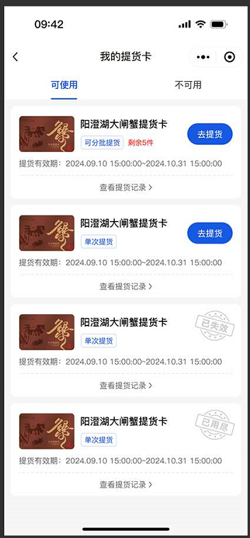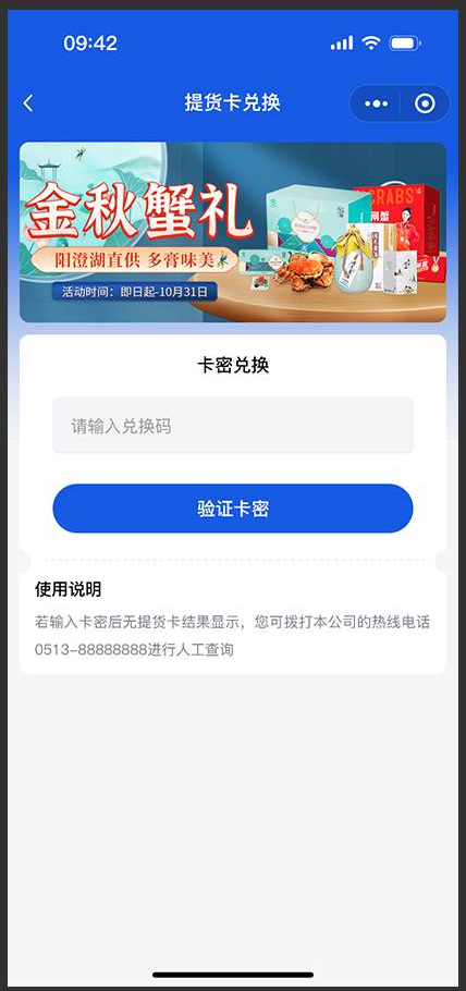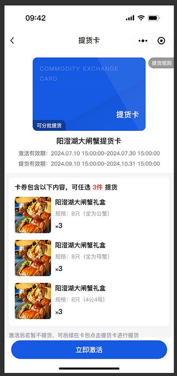 ## 卡密兑换 用户在卡密有效期内于小程序提货卡兑换页面验证卡密,该提货卡进 入用户卡券,在提货有效期内按提货卡规则进行提货 ### ①线上获取卡密/线下获取实体卡卡密  ### ②)前往小程序验证卡密  ### ③激活提货卡  ### ④选取商品进行提货  ### ⑤等待门店发货/前往门店核销