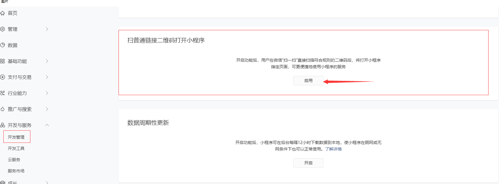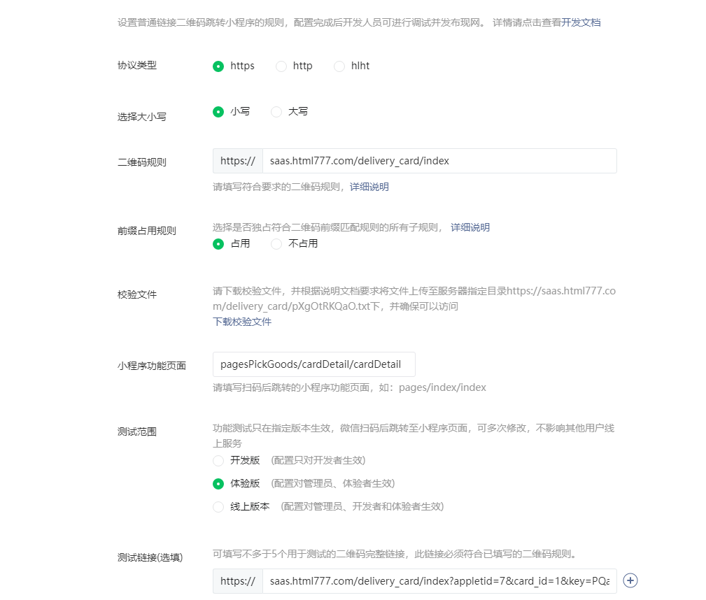 ### 配置扫普通二维码打开小程序 #### 1、进入小程序公众平台管理后台-开发管理-扫普通链接二维码打开小程序  #### 2、添加规则并保存 协议类型:https 大小写:小写 二维码规则:您的域名/delivery card/index 【示例:saas.html777.com/delivery\_card/index】 前缀占用规则:占用 校验文件:下载后上传到服务器指定目录下 小程序功能页面:pagesPickGoods/cardDetail/cardDetail 测试范围:仅影响测试,可根据自己需求选择 测试链接:仅适用于自己测试的场景,非必填,如需测试填入下述内容 您的域名/delivery\_card/index?appletid=项目id&card\_id=提货卡id&key=测试卡密 【示例:saas.html777.com/delivery\_card/index?appletid=7&card\_id=1&key=PQa6JIXYzl】