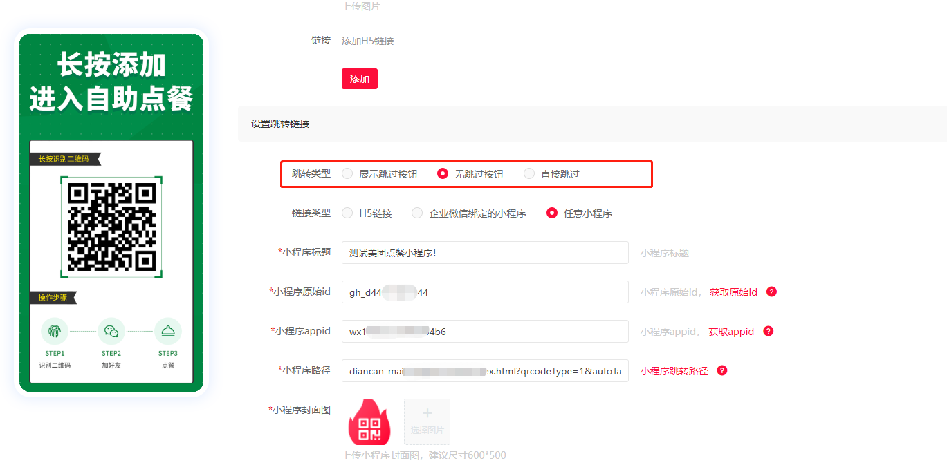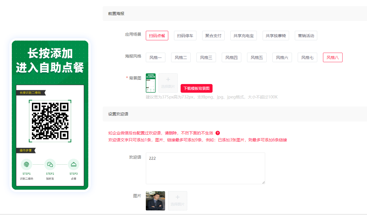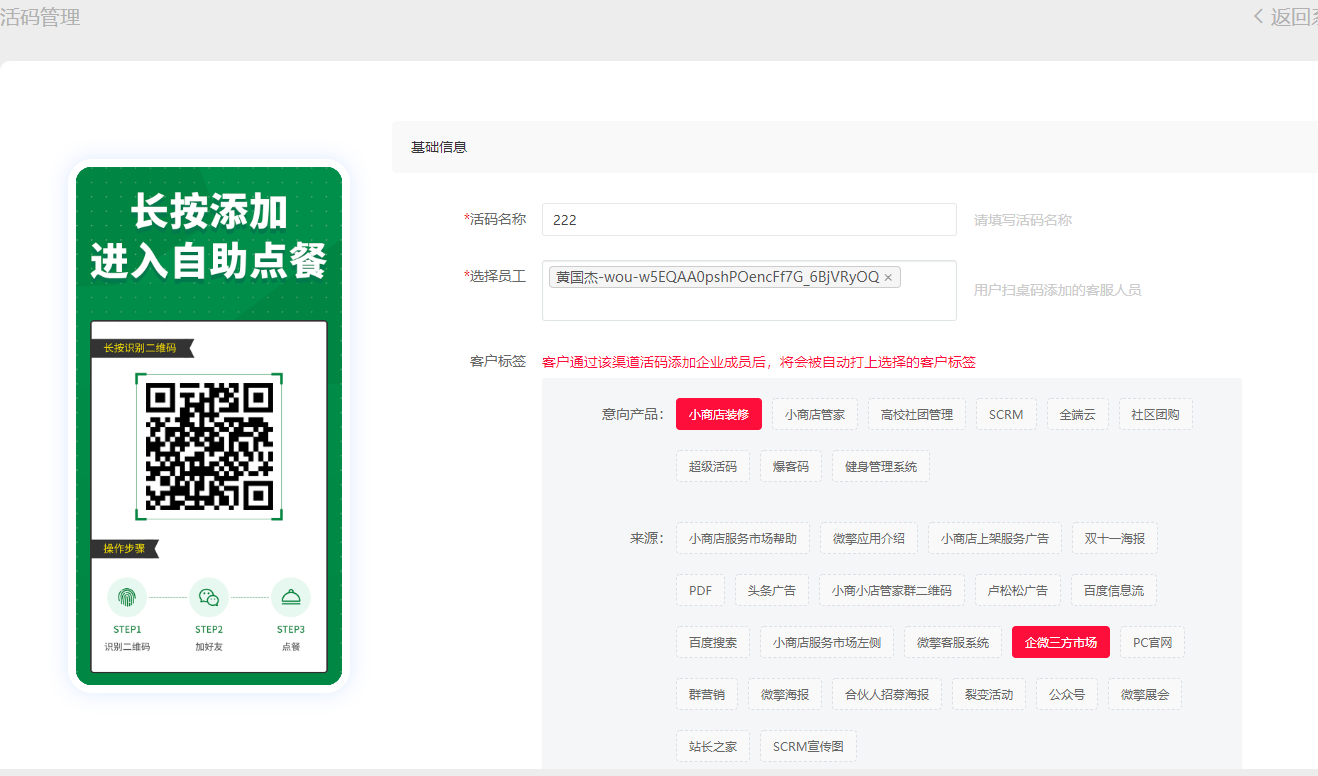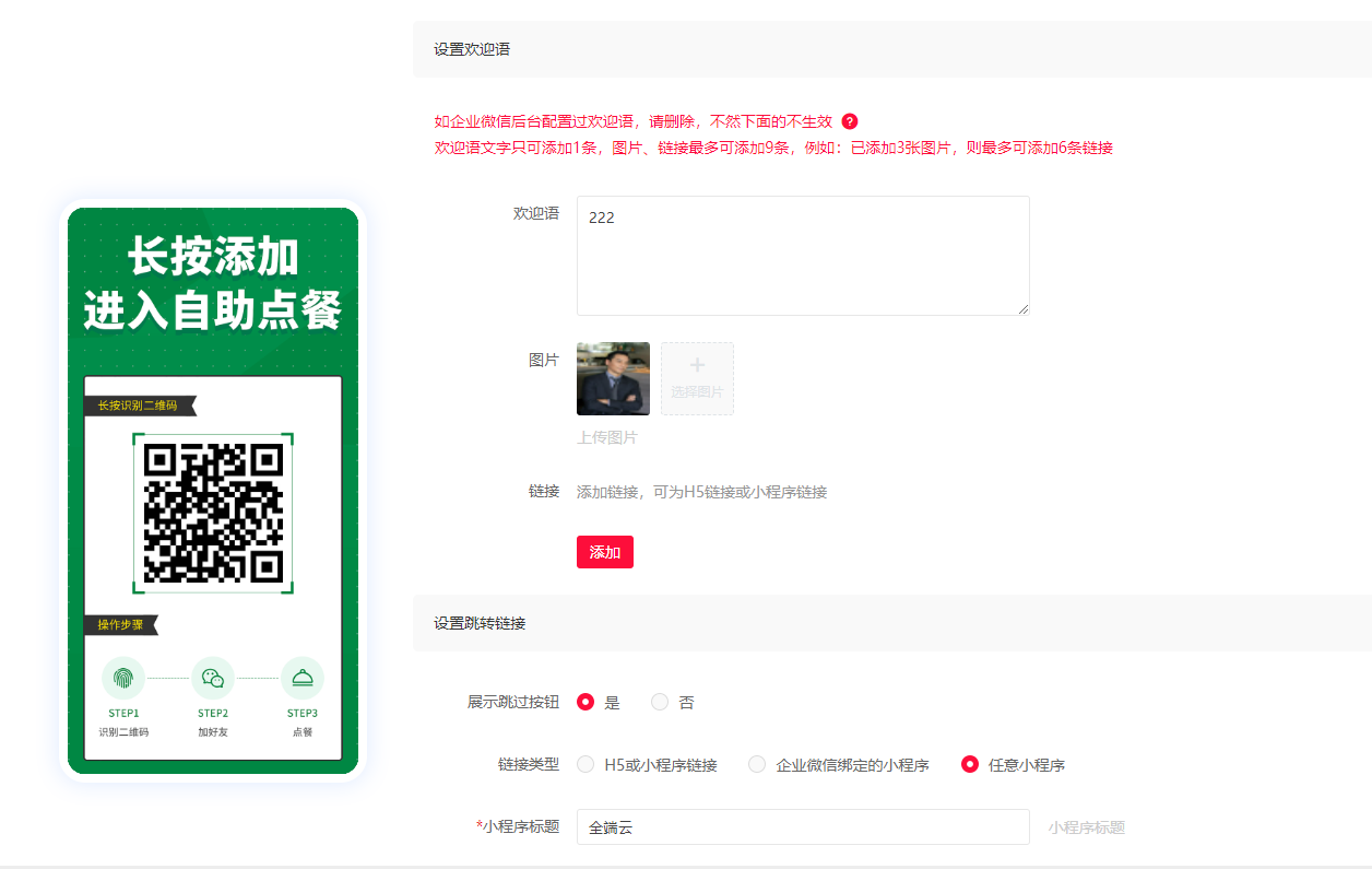 ## 员工管理 #### 添加活码的时候,步骤一定要先同步员工再进行活码创建  ### 1、用户扫桌码添加的客服人员  ### 2、前置海报  ### 3.设置欢迎语  ### 4.设置跳转链接  ### 关于跳转类型说明:设置了直接跳转,新客扫码将直接打开跳转链接,不会显示添加企业微信页面。