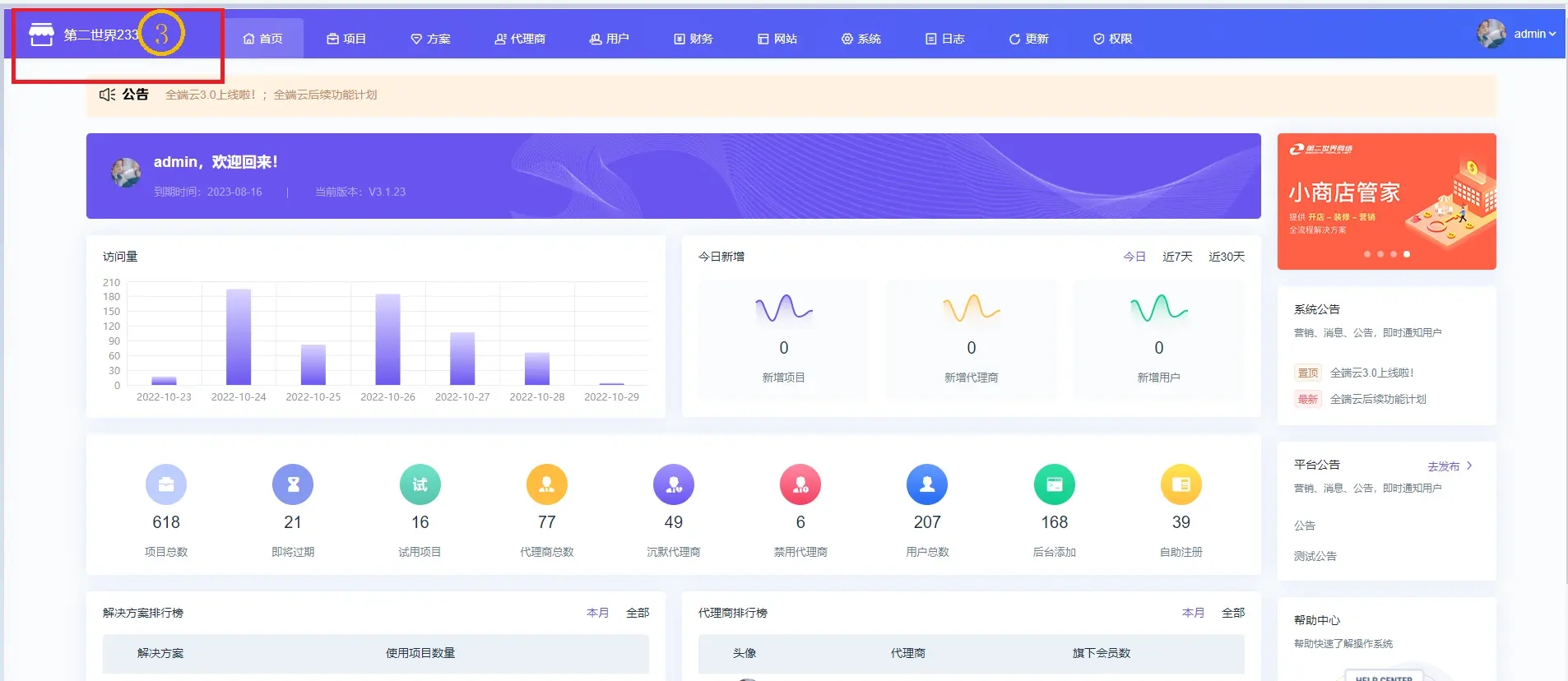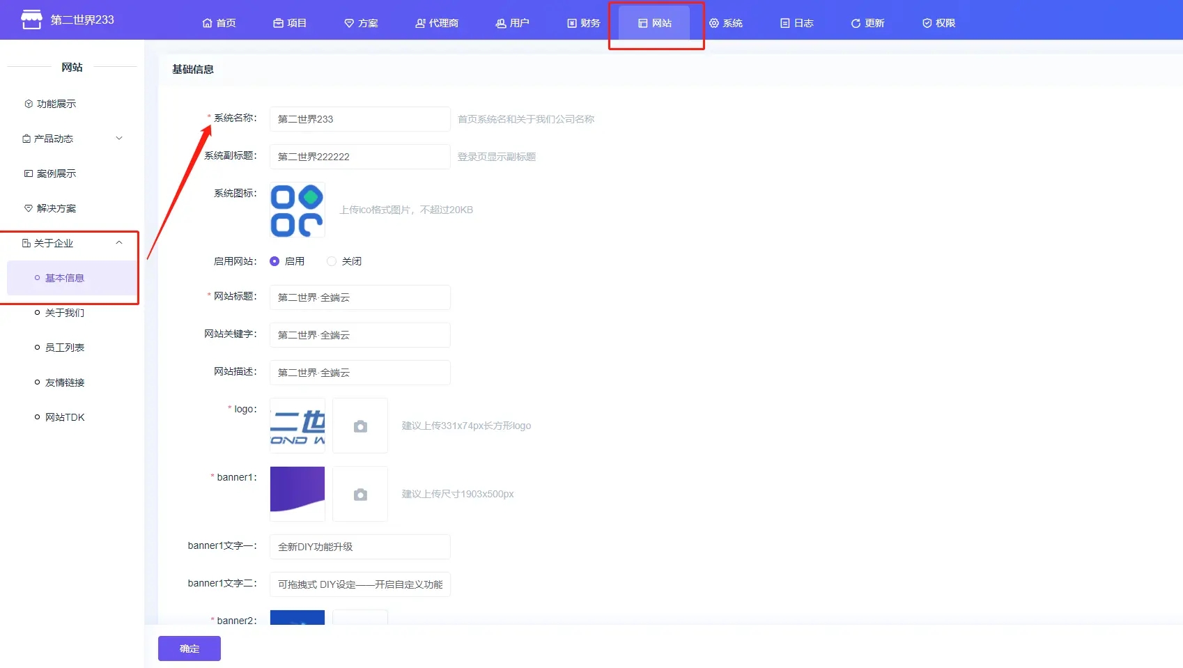 ## 全端云首页  ### 注: #### ①为官方发布内容无法自行修改; #### ②为官方发布内容无法自行修改。   #### ③系统名称修改方式:网站——关于企业——基本信息