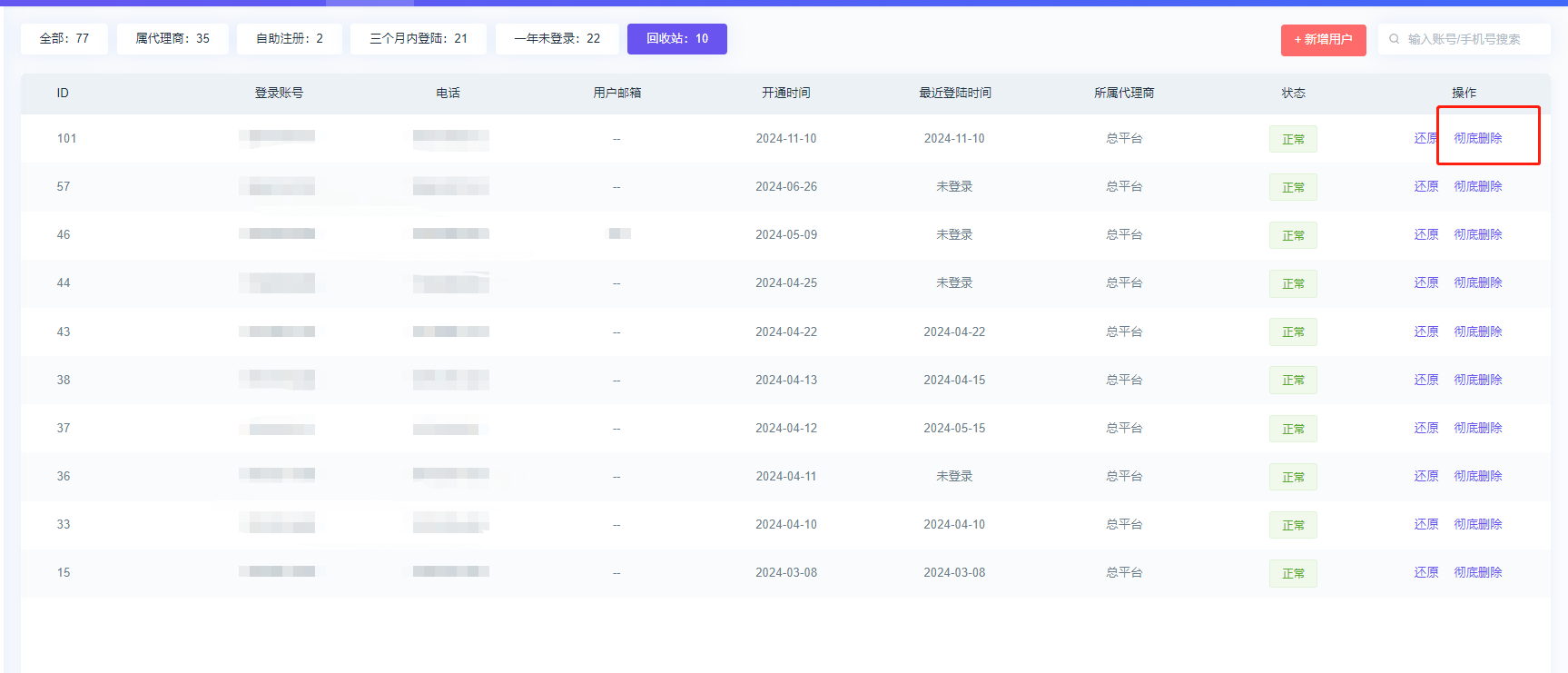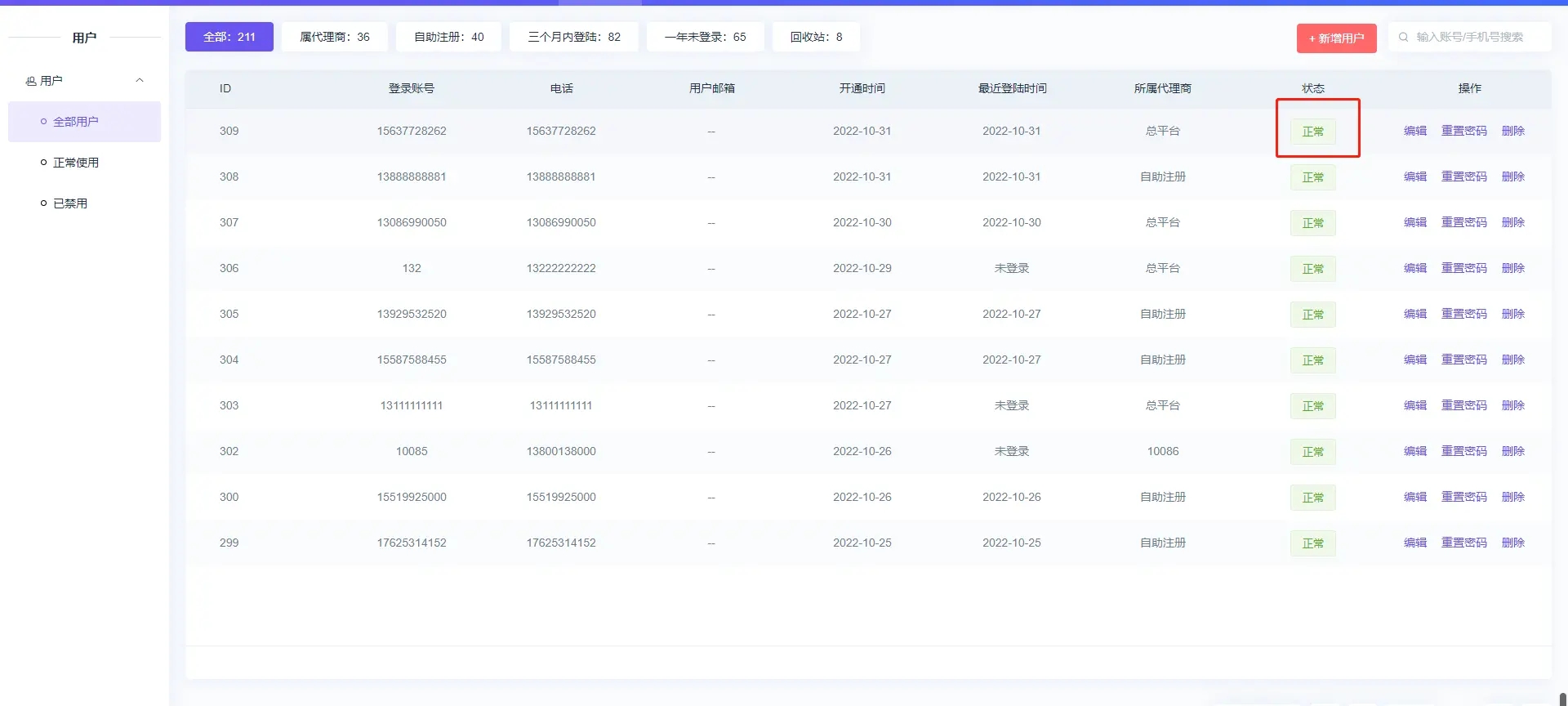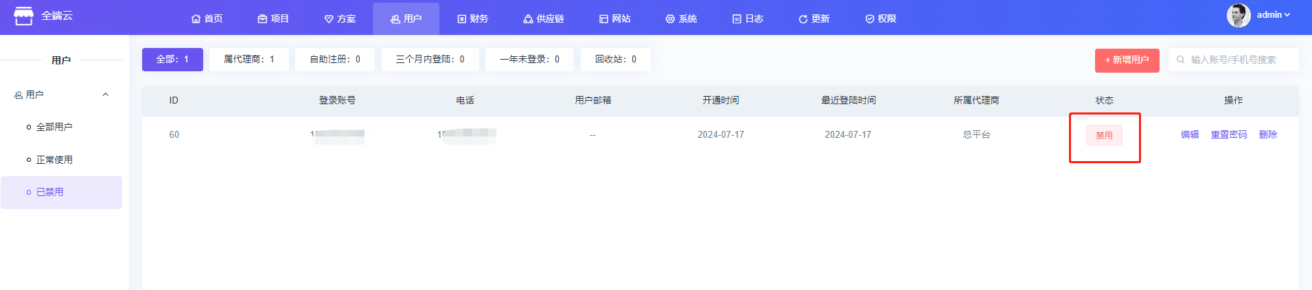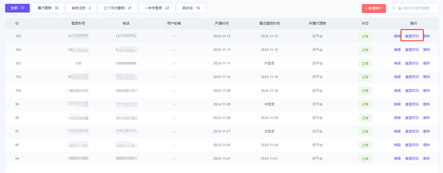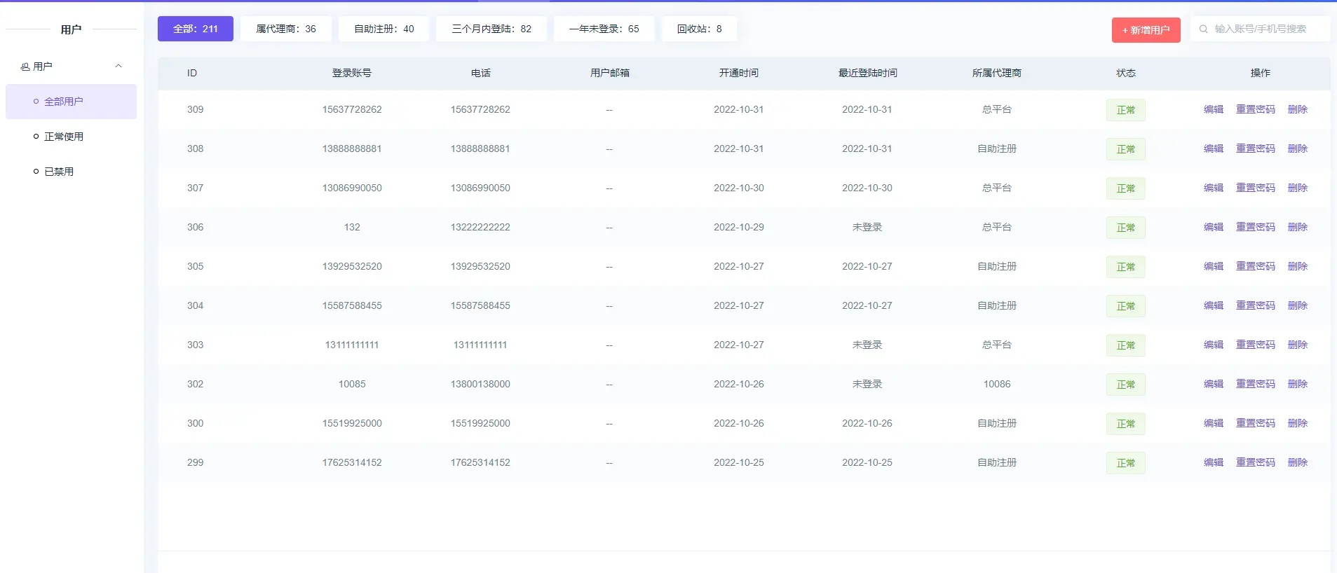 ## 全部用户 ### 【功能意义】 #### 管理所有用户账号,包含:平台创建的账号、代理商创建的账号、自主注册的账号; #### 支持:禁用用户账号、恢复已禁用用户账号、编辑用户信息、充值用户密码、删除用户。  ### 如何禁用用户账号 #### 点击状态为正常的用户即可禁用该用户,禁用账号会进入已禁用列表中  ### 如何启用已被"禁用"的用户账号 #### 在已禁用列表中点击状态为禁用的用户即可解除禁用,解除禁用的用户不再在已禁用列表中显示  ### 如何重置用户账号密码 #### 点击重置密码即可重置   ### 回收站是什么 #### 此处是所有删除的用户账号;回收站里的用户账号可以恢复,也可以彻底删除 <span style="color: red">(彻底删除无法恢复)。