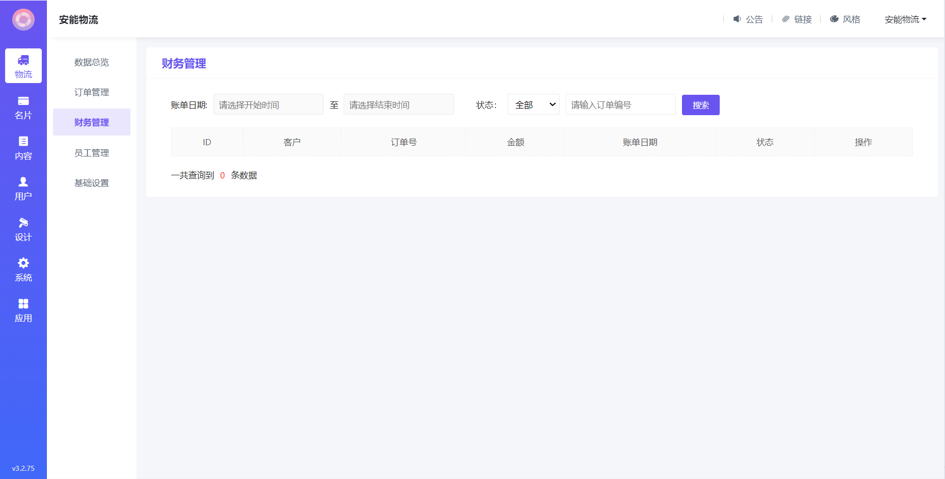 财务管理可以显示订单的id,客户,订单号,账单日期,状态,并且对账单状态进行操作 财务管理选择时间后,会出现用户选择,选择后可以在列表中进行批量操作