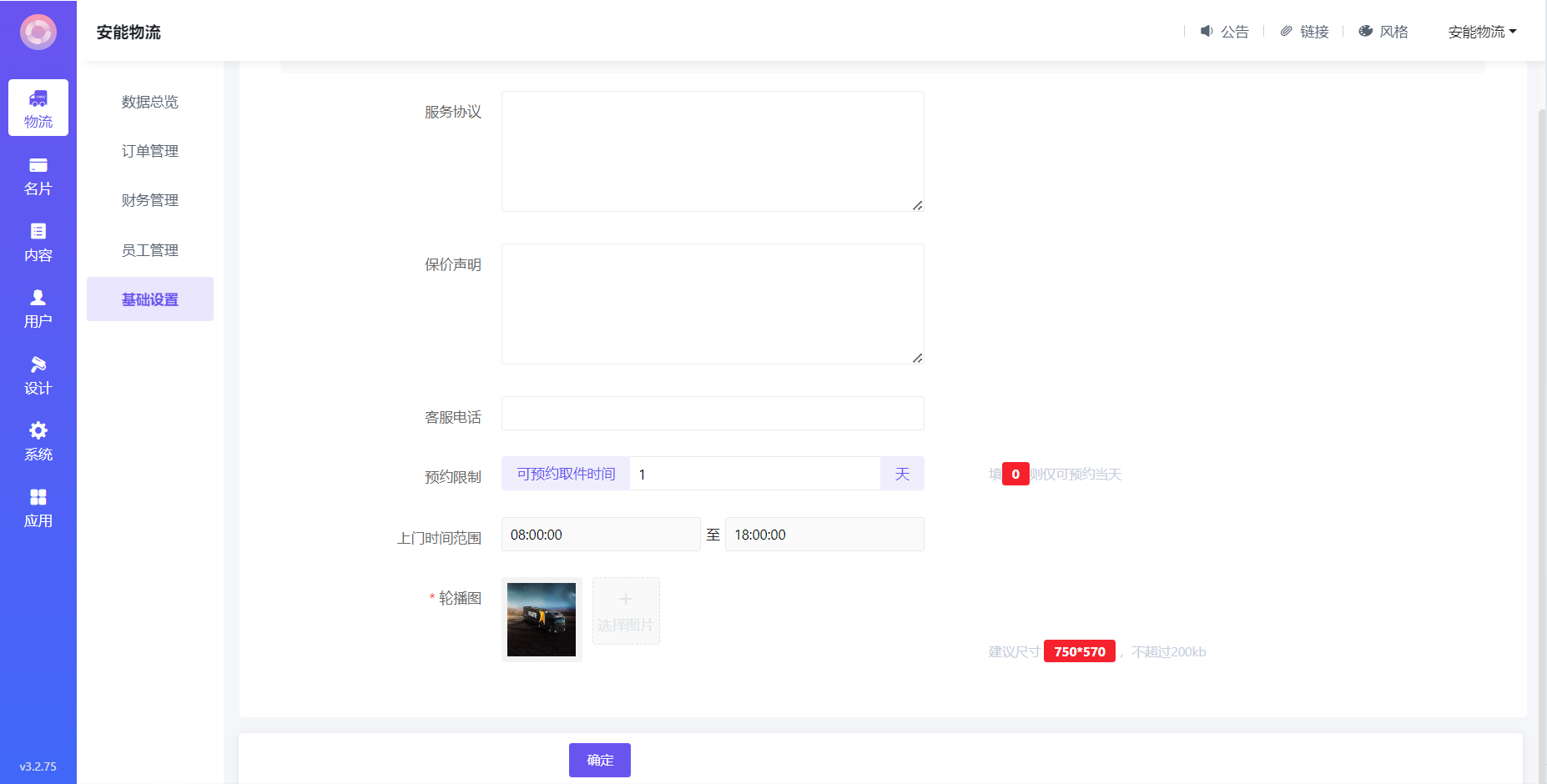 这里修改服务协议,保价声明,预约限制,可以预约取件时间,上门时间范围,首页轮播图