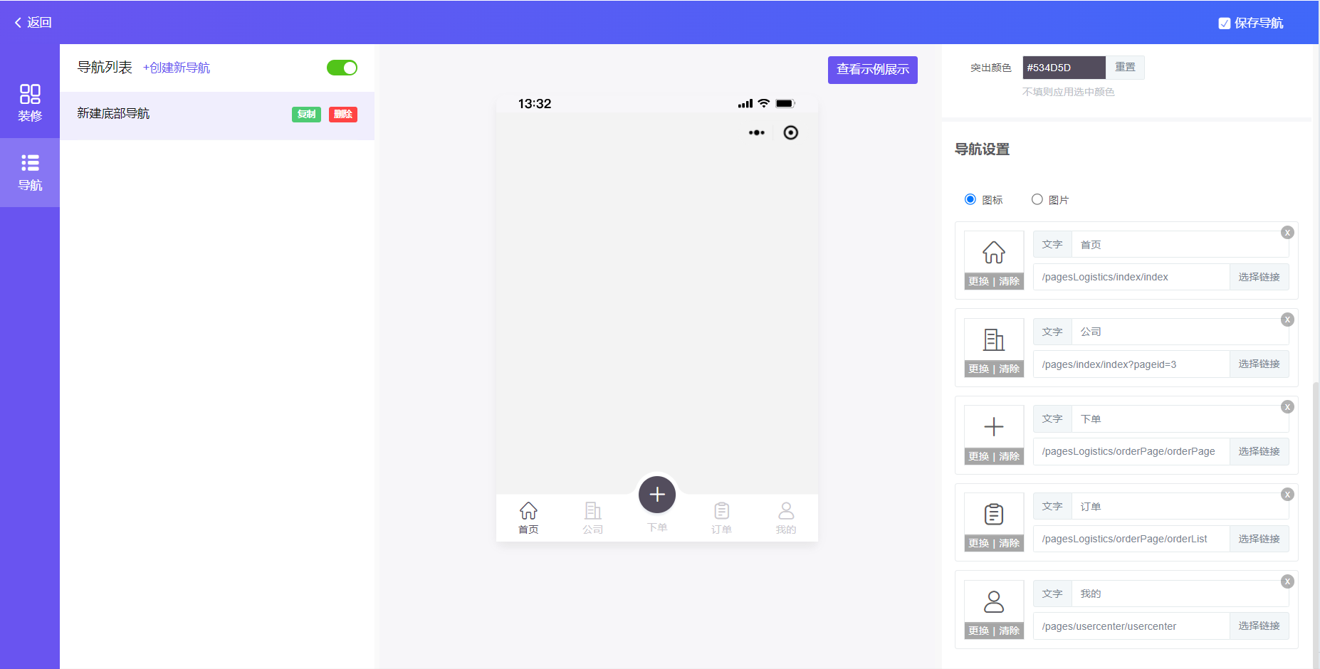 对底部菜单进行diy设置,目前是首页,公司,下单,订单,我的,这五个导航