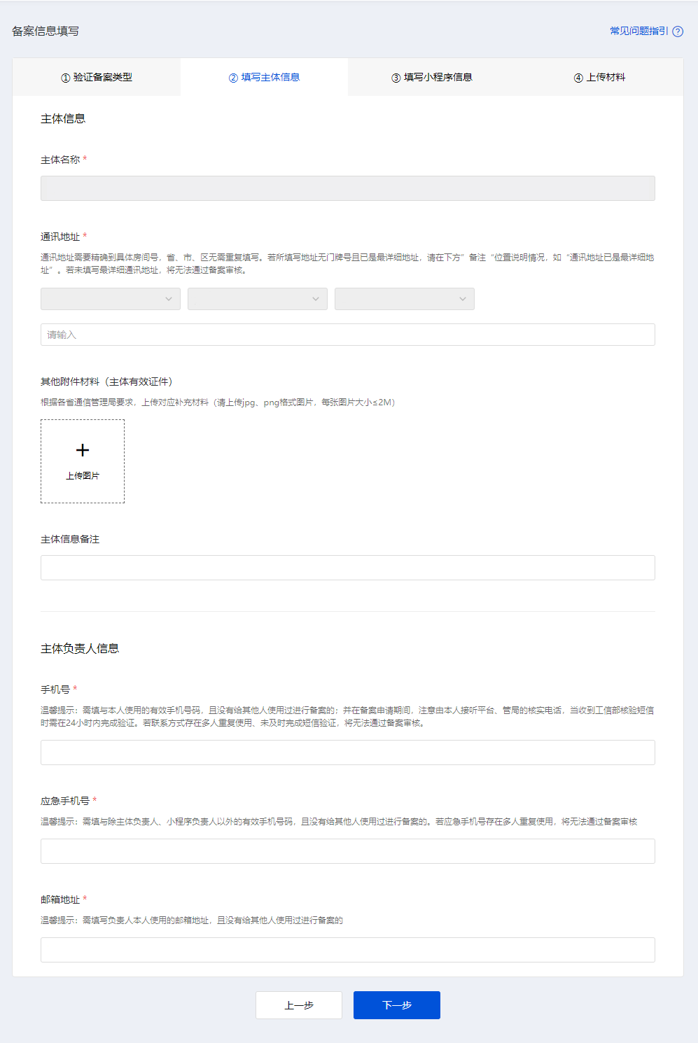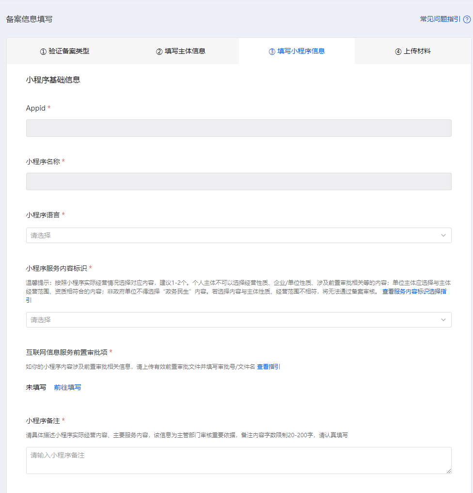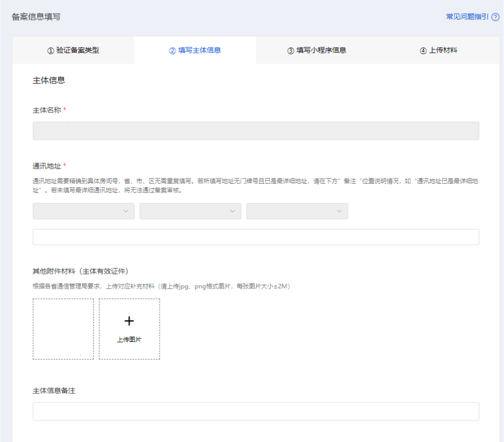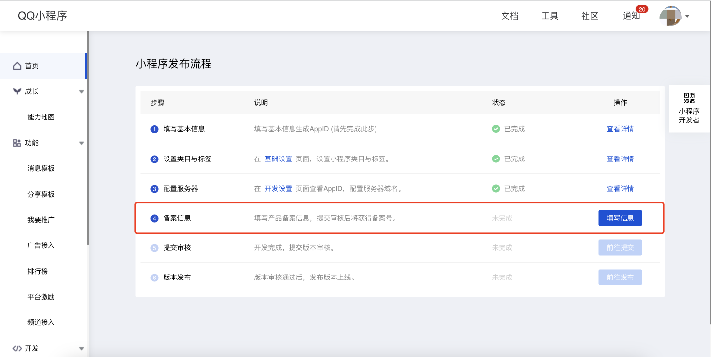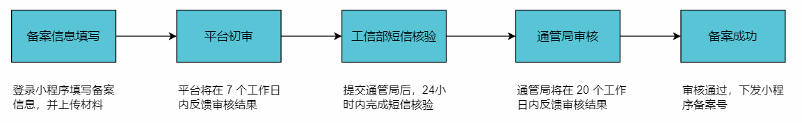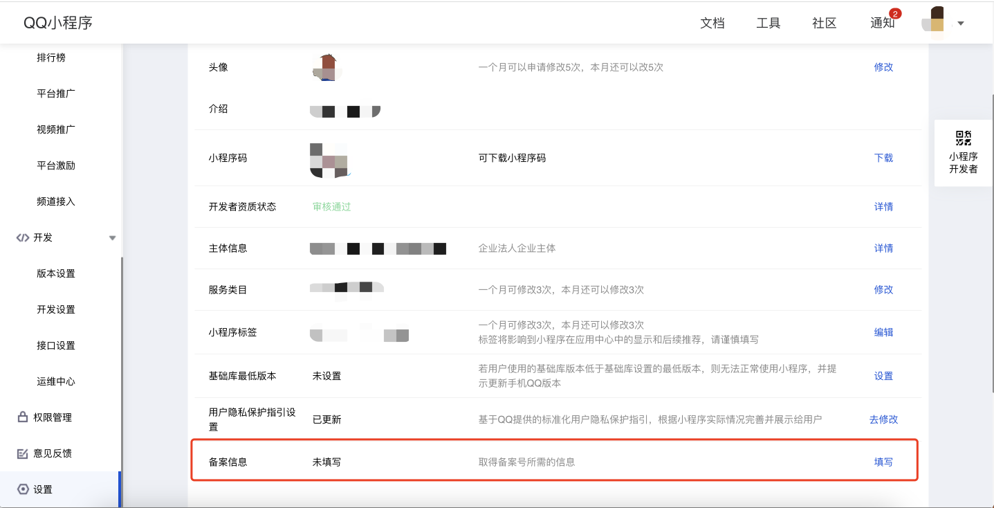 **可参考官方文档:https://docs.qq.com/doc/DZE5MVlJ6aGpWS2xs?_t=1701839448297&u=1a89d837e370451496177a6d87f3e34f** ### 1、备案入口 开发者可在小程序管理后台首页模块点击【填写备案信息】,即可进入备案流程   ### 2、备案流程 备案流程分为5个环节:备案信息填写、平台初审、工信部短信核验、通管局审核和备案成功  #### 2.1 备案信息填写 ##### ① 验证备案类型 非个人主体:  个人主体:  ##### ② 填写主体信息 非个人主体:  提示:选择地区、详细地址,请填写实际通讯地址。 上传有效证件原件的彩色扫描件或拍照件,请保持图片清晰完整,不遮挡关键信息/图像、边角齐全,证件有效期大于1个月。  个人主体:  提示:手机号码请填写主体负责人、应急联系人本人使用的有效手机号码,需保持电话畅通,不同人不能使用同一个号码 ##### ③ 填写小程序信息 非个人主体:  提示:如你的小程序内容涉及前置审批相关信息,请上传有效前置审批文件并填写审批号/文件名  个人主体:  ##### ④ 上传资料 地区(广东省):  地区(非广东省):  ### 3、备案审核 备案审核分为平台初审和管局审核两个步骤。 QQ小程序平台初审将在7个工作日内反馈审核结果,管局审核将在20个工作日内反馈审核结果。