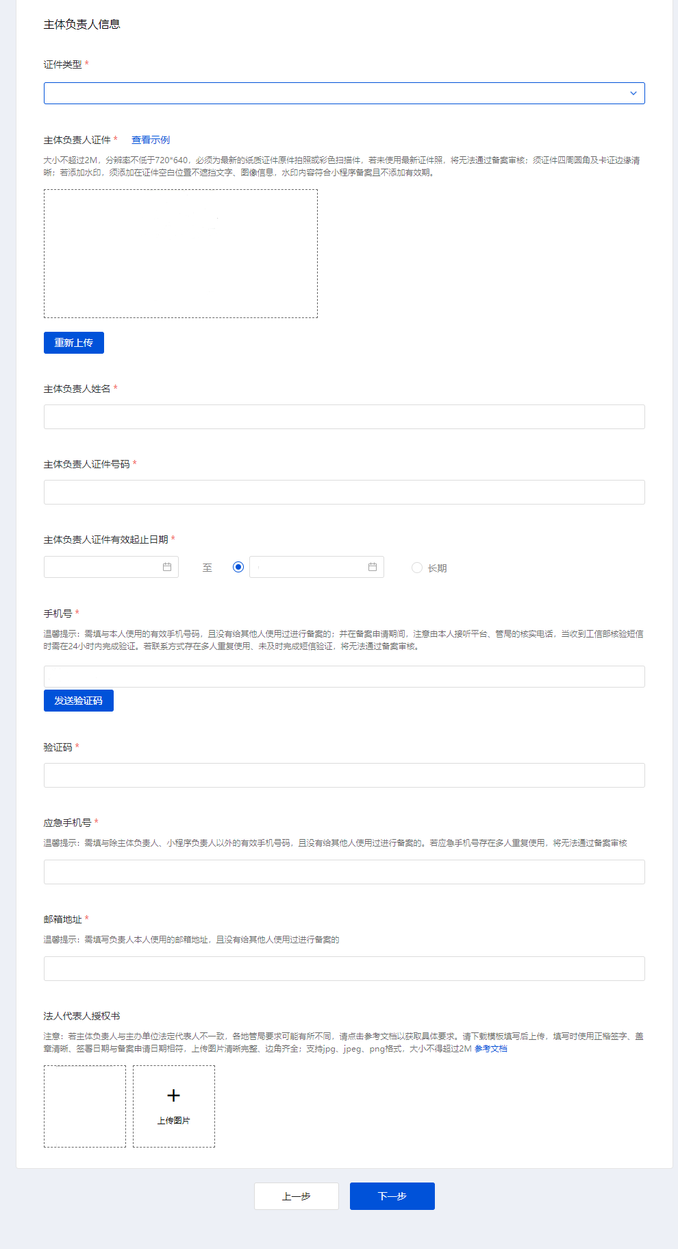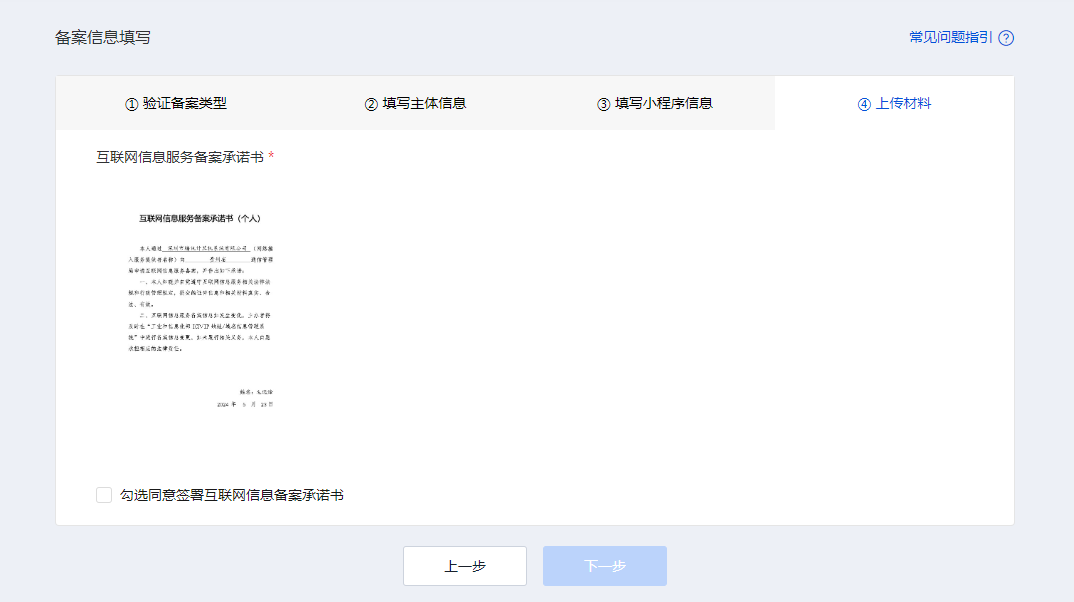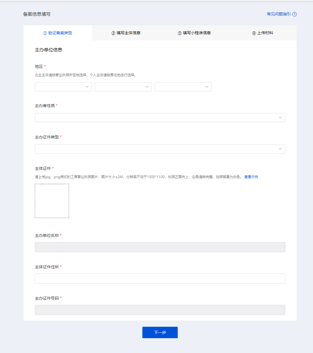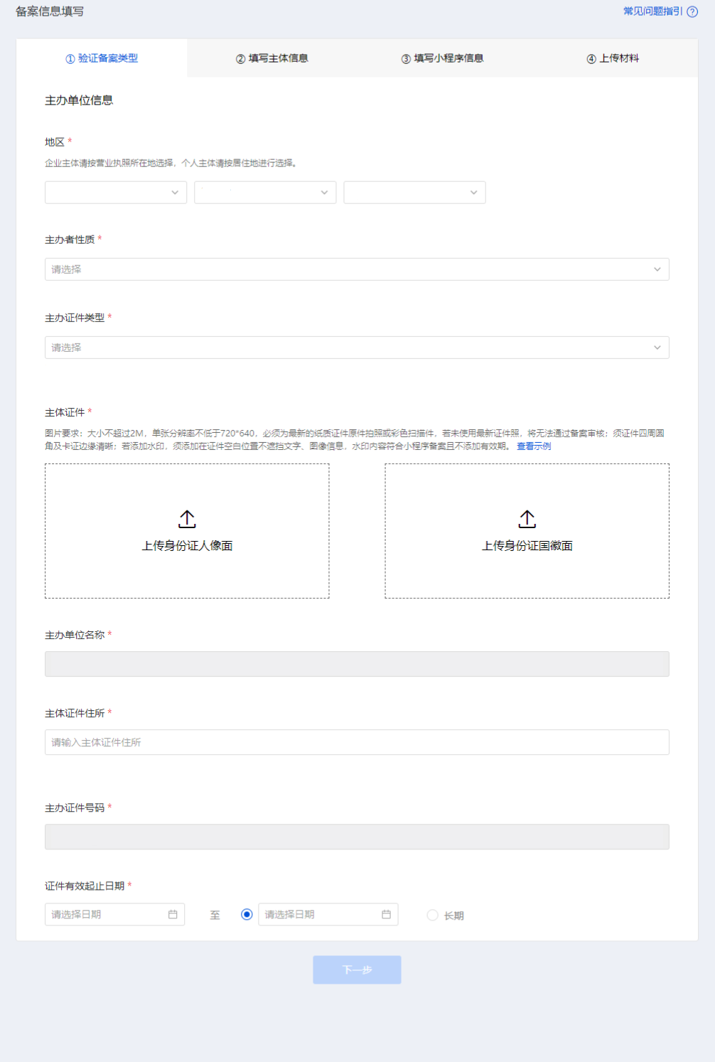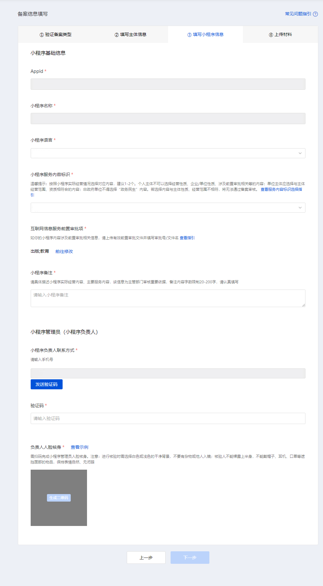 **可参考官方文档:https://docs.qq.com/doc/DZE5MVlJ6aGpWS2xs?_t=1701839448297&u=1a89d837e370451496177a6d87f3e34f** ### 1、备案入口 开发者可在小程序管理后台首页模块点击【填写备案信息】,即可进入备案流程   ### 2、备案流程 备案流程分为5个环节:备案信息填写、平台初审、工信部短信核验、通管局审核和备案成功  #### 2.1 备案信息填写 ##### ① 验证备案类型 非个人主体:  个人主体:  ##### ② 填写主体信息 非个人主体:  提示:选择地区、详细地址,请填写实际通讯地址。 上传有效证件原件的彩色扫描件或拍照件,请保持图片清晰完整,不遮挡关键信息/图像、边角齐全,证件有效期大于1个月。  个人主体:  提示:手机号码请填写主体负责人、应急联系人本人使用的有效手机号码,需保持电话畅通,不同人不能使用同一个号码 ##### ③ 填写小程序信息 非个人主体:  提示:如你的小程序内容涉及前置审批相关信息,请上传有效前置审批文件并填写审批号/文件名  个人主体:  ##### ④ 上传资料 地区(广东省):  地区(非广东省):  ### 3、备案审核 备案审核分为平台初审和管局审核两个步骤。 QQ小程序平台初审将在7个工作日内反馈审核结果,管局审核将在20个工作日内反馈审核结果。