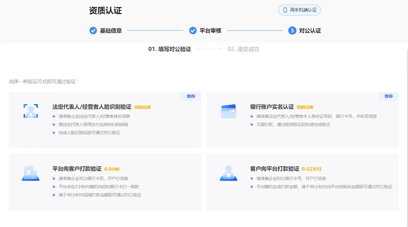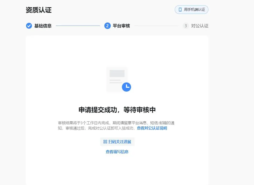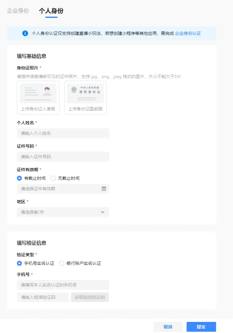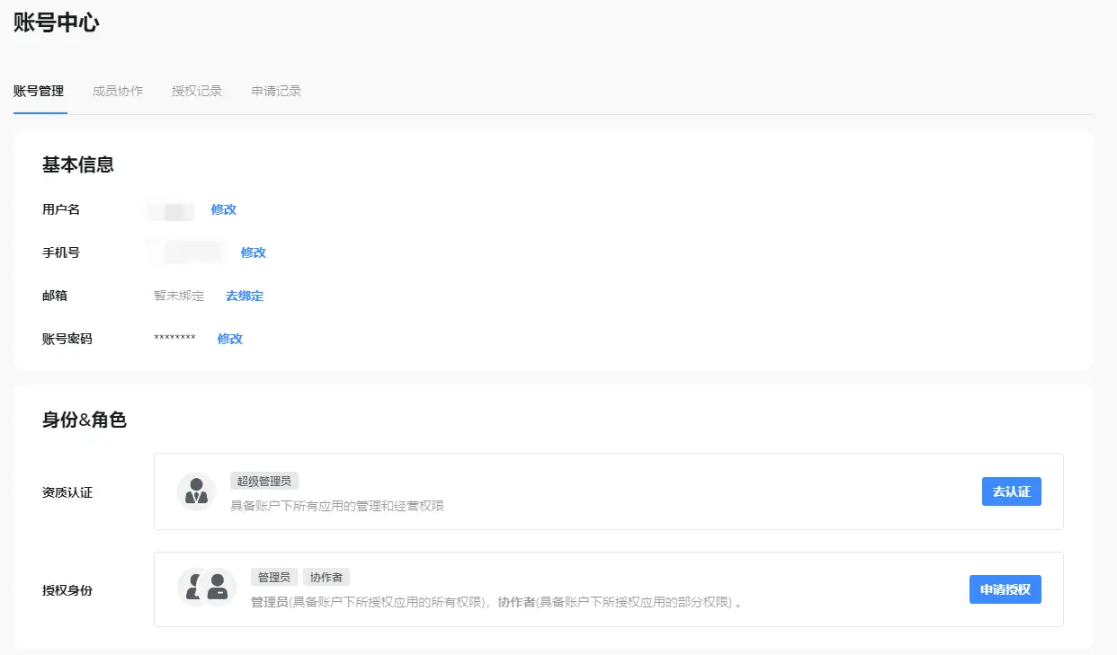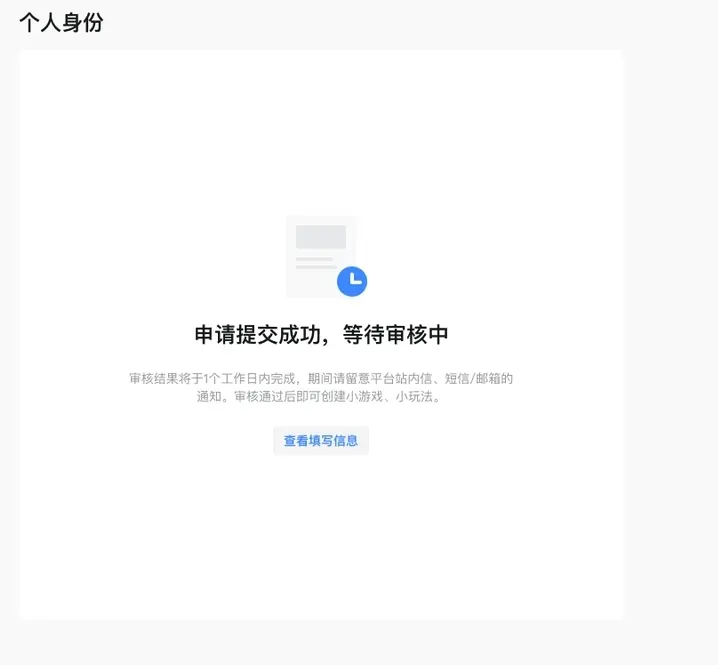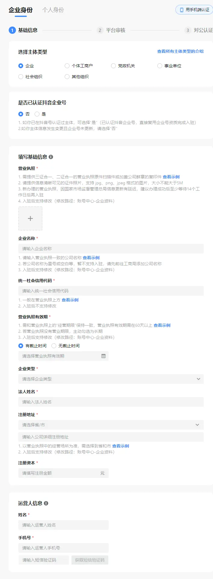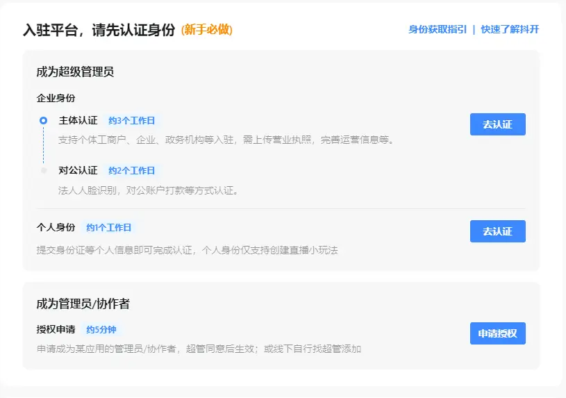 **可参考官方文档:https://developer.open-douyin.com/docs/resource/zh-CN/developer/join/join-into-developer-platform** ### 1、注册抖音开放平台账号后,登录成功在首页或「账号中心」中认证企业身份,进行主体资质信息的填写并通过平台审核。   ### 2、进行对公认证并通过平台审核。  ### 主体认证: #### ① 认证入口: **方式一:登录成功后首页界面**  **方式二:前往右上角「账号」点击「账号中心」在「身份&角色」中资质认证**  #### ② 选择主体类型 根据实际情况选择正确的主体在抖音开放平台从事经营业务。主体资质审核通过后不支持变更统一信用代码,请慎重选择入驻主体。 #### ③ 是否已认证抖音企业号 注意:企业身份仅支持创建小程序/移动应用/网站应用;个人主体仅支持创建小玩法。 #### ④ 填写基础信息 包括营业执照、企业名称、统一社会信用代码、证件有效期、法人姓名、注册地址、注册资本、运营人信息等 #### ⑤ 提交成功 企业主体,审核约3个工作日,通过短信/邮箱/平台信息/扫码四个渠道获取认证进展;个人主体,审核约约 1 个工作日   ### 对公验证: 4种验证方式选择一种即可通过验证 法定代表人/经营者人脸识别验证:实时完成 银行账户实名认证:实时完成(仅限法人/经营者证件为大陆身份证可使用) 平台向客户打款验证:0-2小时(需使用对公账户) 客户向平台打款验证:1-2个工作日(需使用对公账户) ### 3、成功入驻,可进行应用创建。