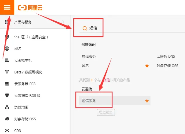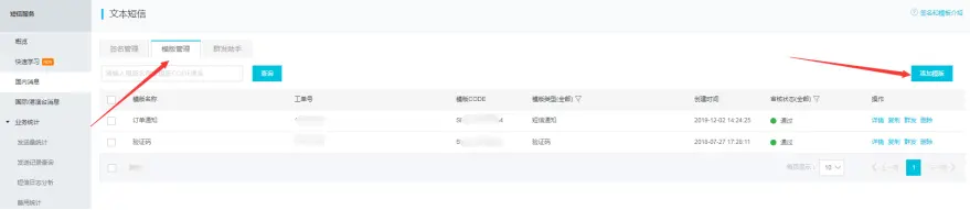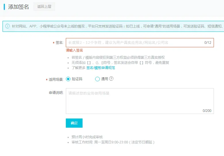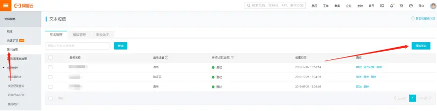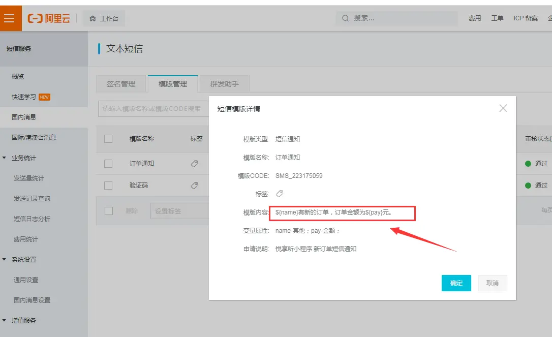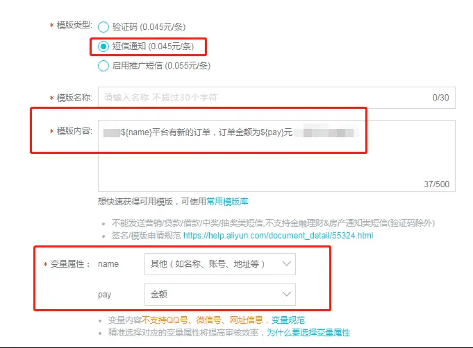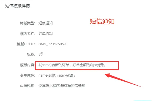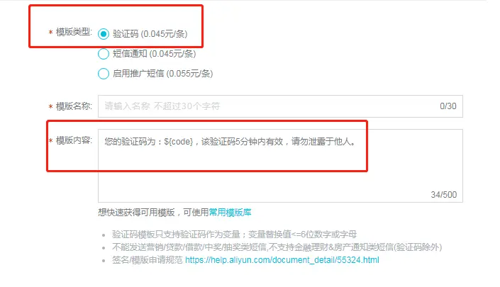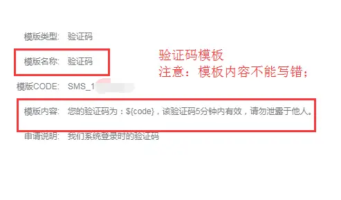 两种模板:绑定手机号码获取验证码、订单通知; 1、手机验证码模板:您的验证码为:${code},该验证码5分钟内有效,请勿泄漏于他人!  2、订单通知模板:${name}有新的订单,订单金额为${pay}元;  阿里云短信配置步骤:  1、添加签名:签名管理 - 添加签名;   2、添加模板:模板管理 - 添加模板;  验证码:   短信通知: