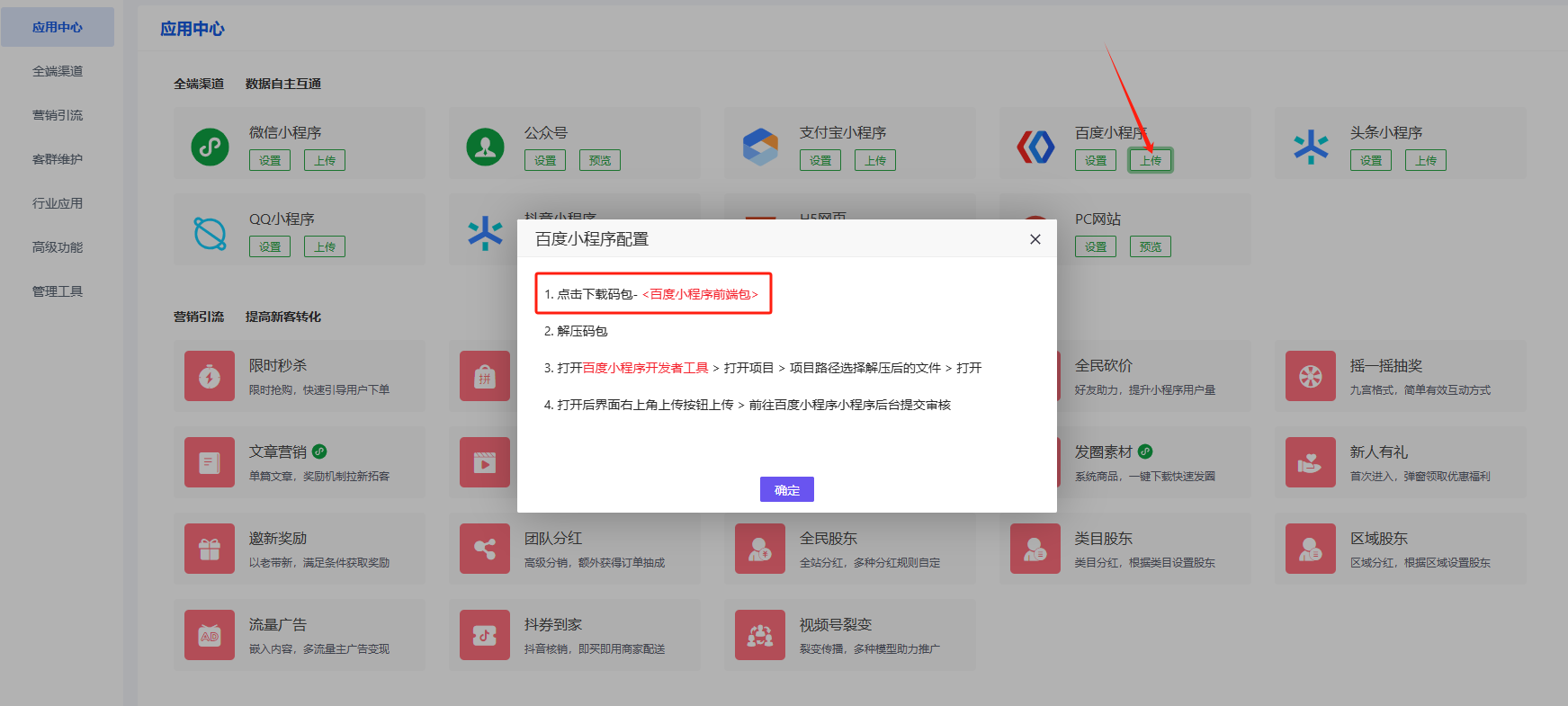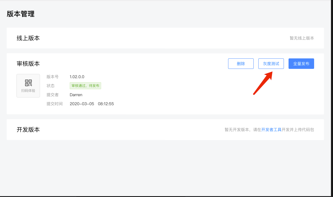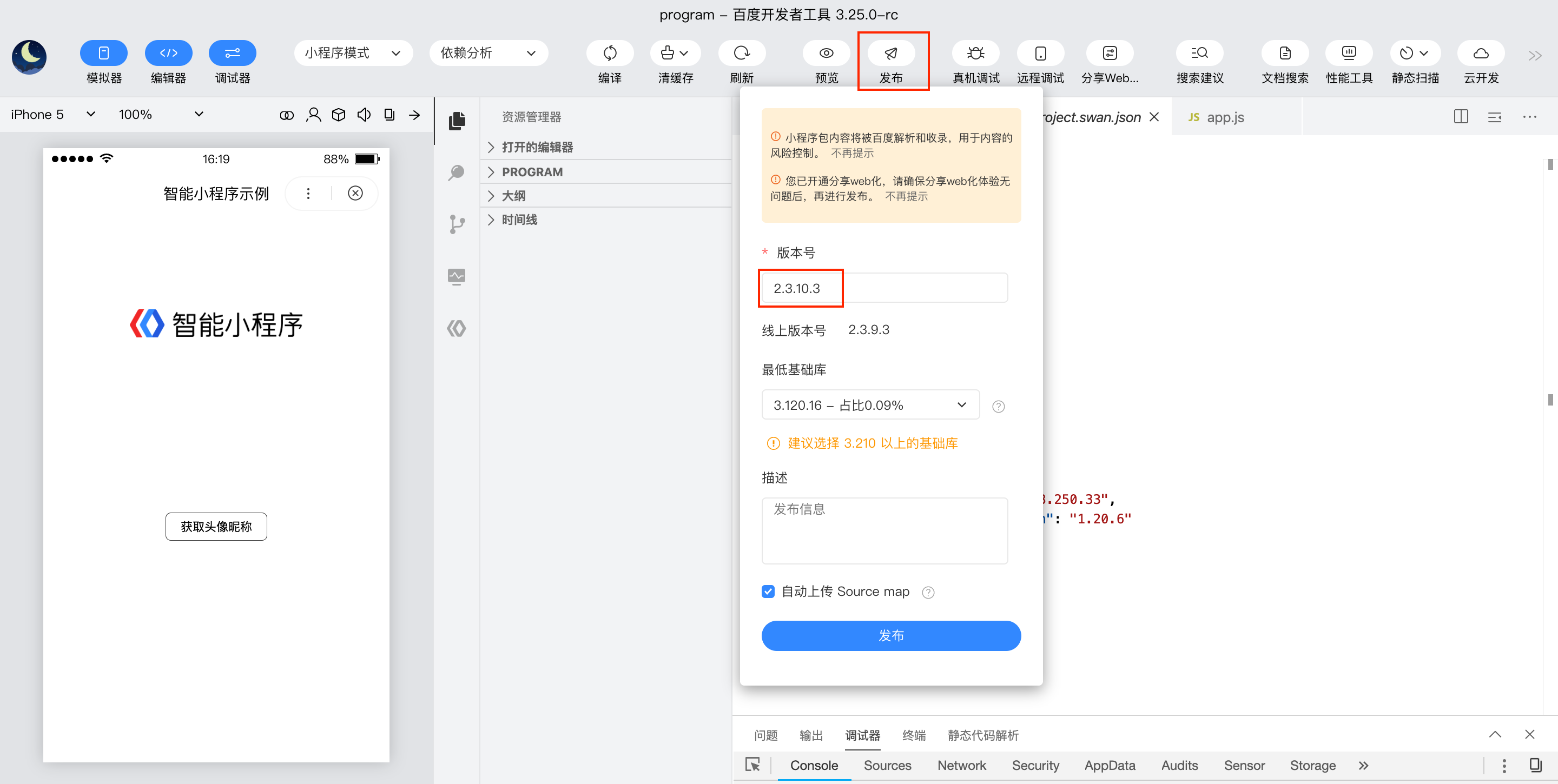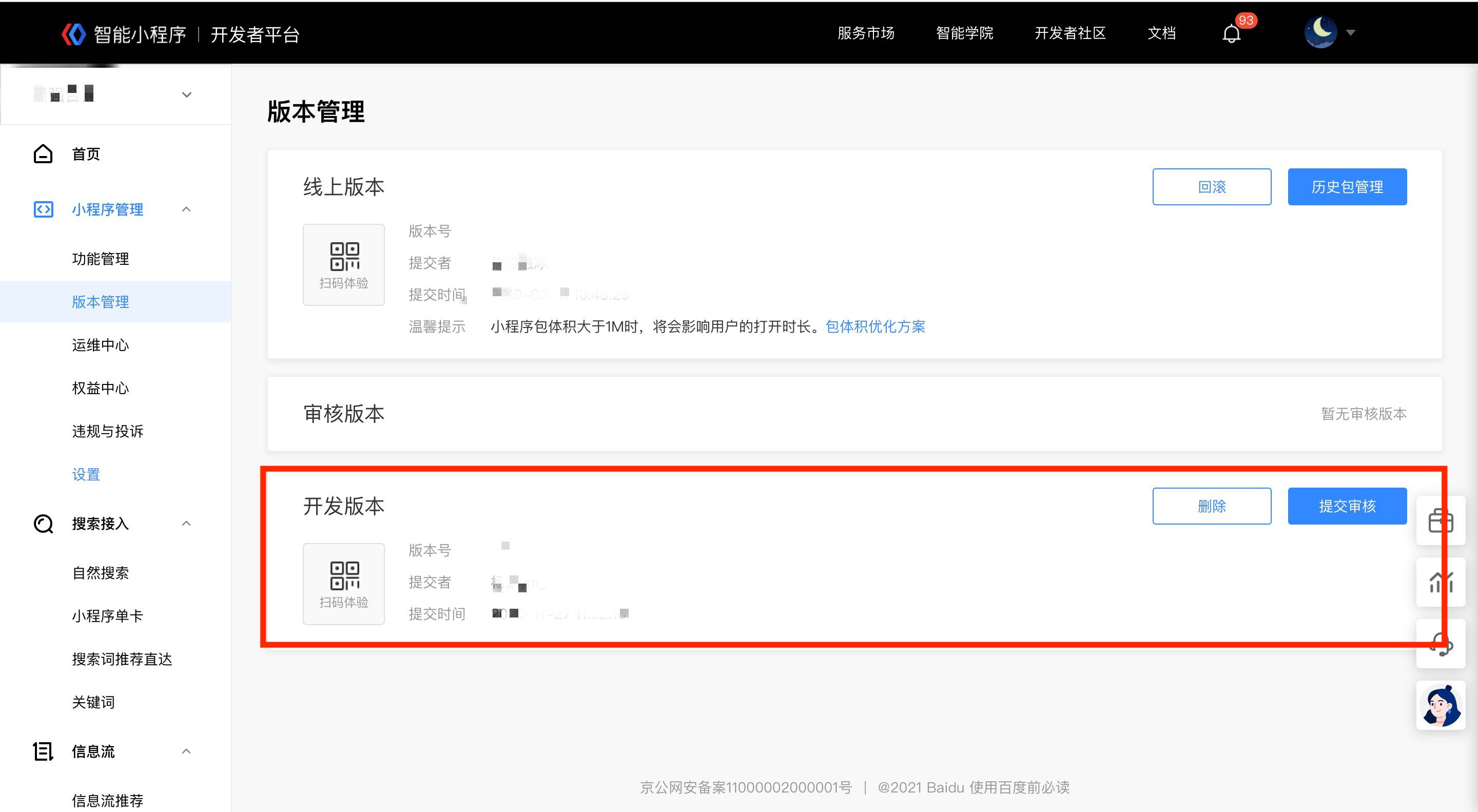 **可参考官方文档:https://smartprogram.baidu.com/docs/introduction/online/** 1、下载小程序前端包  2、在百度开发者工具([ Windows 下载地址](https://smartprogram.baidu.com/mappconsole/api/devDownload?system=windows&type=online " Windows 下载地址") | [Mac 版下载地址](https://smartprogram.baidu.com/mappconsole/api/devDownload?system=mac&type=online "Mac 版下载地址"))中上传代码包   3、点击发布代码  4、从开发者后台“小程序管理 -> 版本管理”模块点击“提交审核”按钮完成代码包的提交。  5、代码审核通过后,开发者进入灰度发布入口:“小程序平台 -> 开发管理 -> 版本管理 -> 审核版本(审核通过版本)”,点击“灰度测试”或“全量发布”