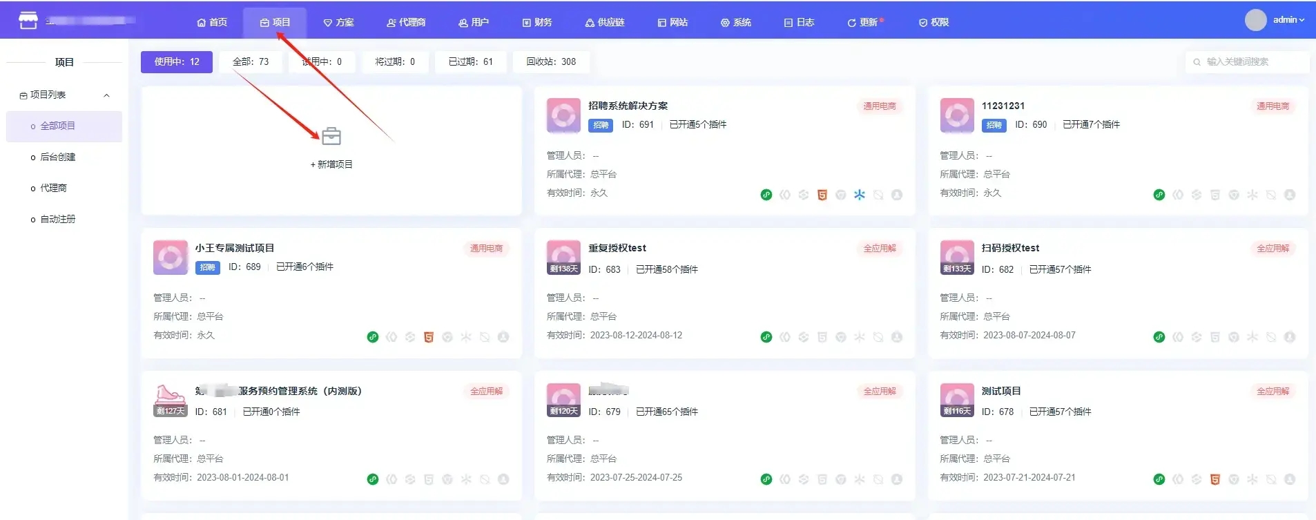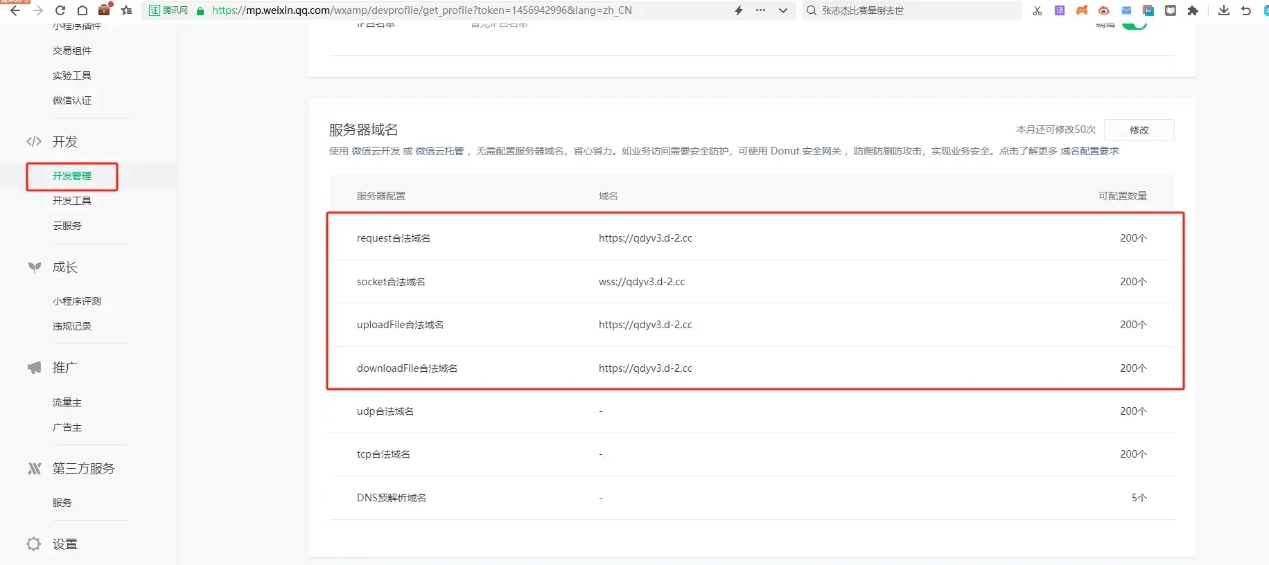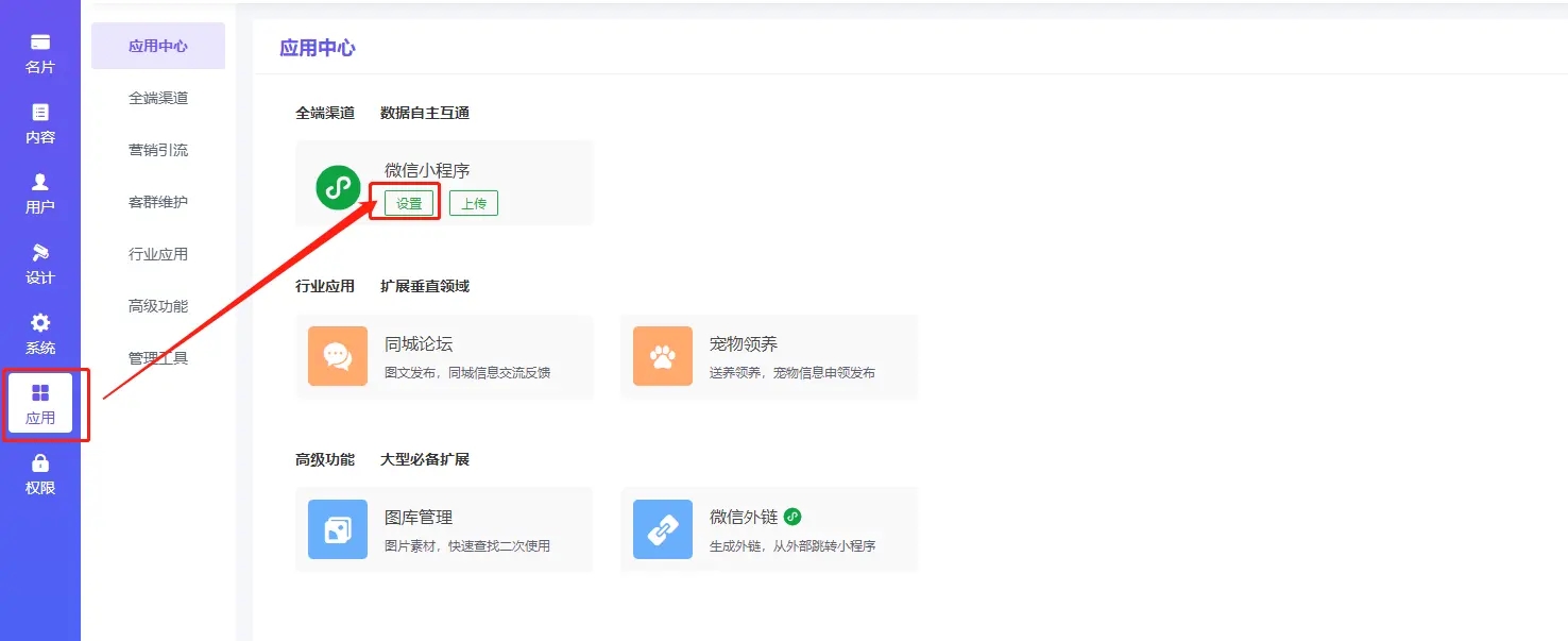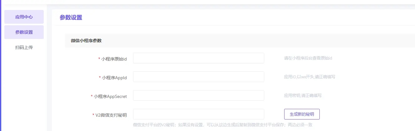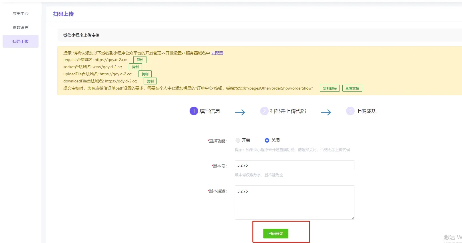 ### 一、登录系统后台,创建项目  ### 二、配置小程序原始id和小程序AppId    小程序原始id、小程序AppId参数需要微信公众号平台,网址:https://mp.weixin.qq.com 输入申请时的账号密码,管理员扫码登录,进入如图界面,左上角我们可以看到是小程序的后台。  小程序原始id、小程序AppId获取位置如图所示  AppSecret:开发→开发设置→AppSecret(注:新申请的小程序这边是生成,扫码生成,这边只有管理员才有权限,自己设置32位字符)  ### 三、添加小程序服务器域名(否则会白屏) 本次以我们演示版为例:开发→开发设置→服务器设置  (1)、开始配置(注:这个配置开发者都可以配置) qdyv3.d-2.cc(注:这个是演示版的域名,请添加自己的授权域名进行替换!!) request合法域名、socket合法域名、uploadFile合法域名、downloadFile合法域名都要添加自己的授权域名(只需配置这四个即可)  (2)、配置完成后,在开发管理中的接口设置内申请二个地理位置接口。  ### 四、第三步全部完成后,扫码上传可查看体验版并提交版本审核,审核通过后点击发布上线。