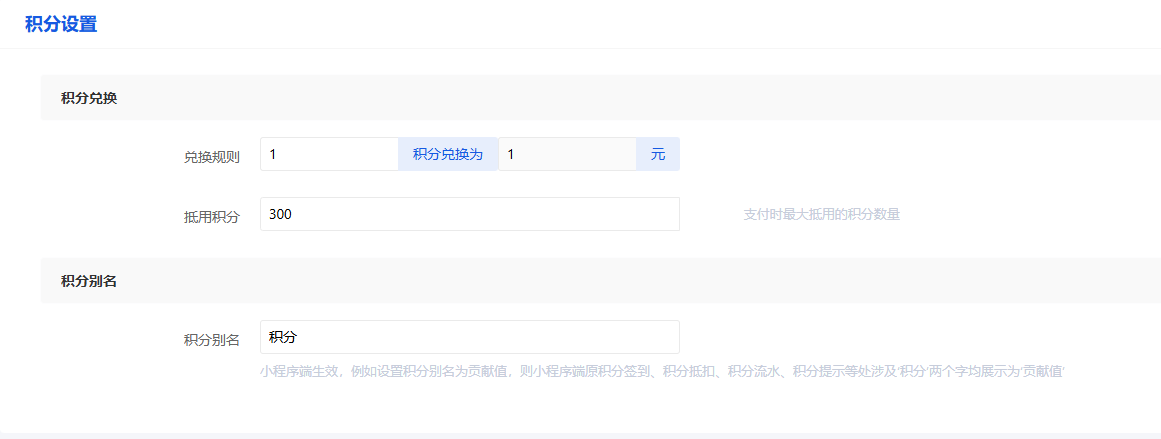 ### 积分规则插件 `插件位置:应用->客群维护->积分规则` ### 1.插件介绍 - 适用于商品下单赠送积分(百分比赠送) - 商品结算时根据积分兑换规则,用获取的积分抵扣相应比例的优惠 - 商品结算时积分抵扣金额不得超过系统设置的抵用积分限制 - 积分别名设置后,小程序端展示“积分”文字处均修改展示为后台设置的别名 ### 2.核心功能 - 积分兑换规则设置 - 最大抵用积分数量设置 - 积分别名设置 ### 3.使用流程 ```mindmap # 模块流程 ### 1.设置积分兑换规则 ### 2.设置积分别名 ``` ### 4.常见问题 无 ### 5.计算逻辑 无 ### 6.界面演示