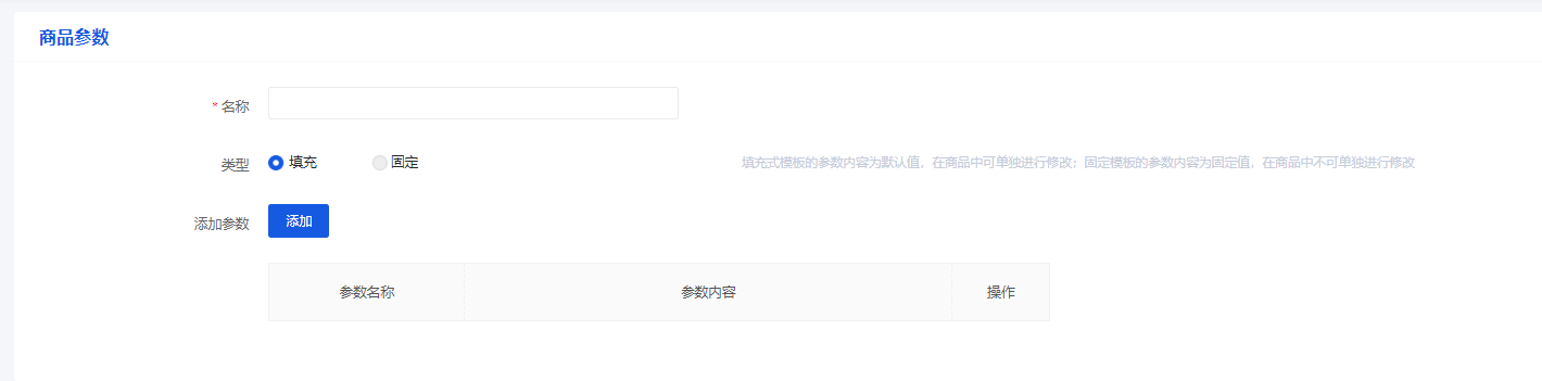 ### 【功能意义】商品自定义参数功能,满足不同行业商品个性化信息展示,商品参数可混合使用预设参数模板和独立添加单条参数,满足更多组合展示需求。 #### 参数模板分为固定模板和填充模板两种类型  1)、商品使用固定模板时模板参数名称和参数内容都不可修改; 2)、商品使用填充模板时模板参数名称不可修改; 3)、参数内容若已设置则作为默认值展示可在商品中单独进行修改; 4)、商品参数模板若进行修改,使用该模板的商品的商品参数将会随其修改变化,变化内容包括固定模板的参数名称和内容,填充模板的参数名称和参数模板中参数的增删