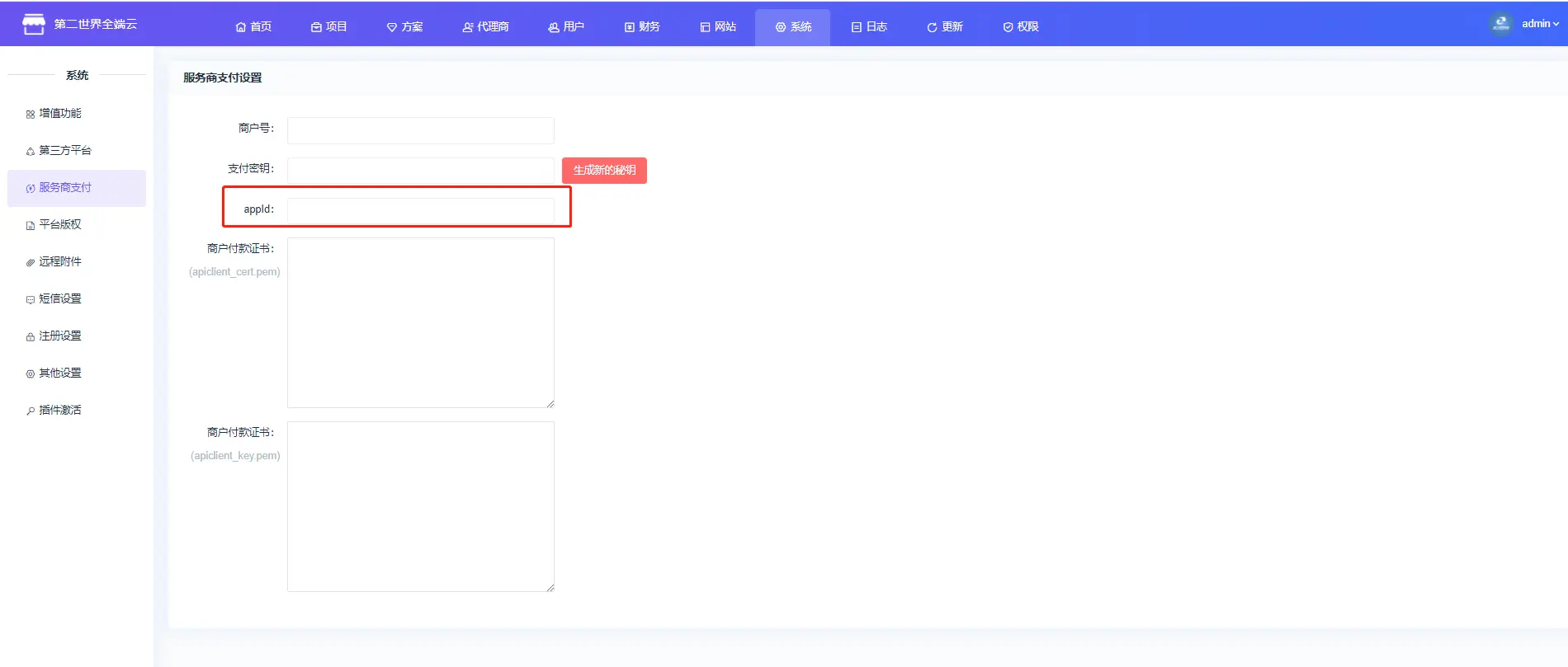 ### 一、登录微信公众号平台,申请微信支付服务商(资料正确无误的话,1-2个工作日可通过)  ### 二、系统后台参数配置 (1)、 登录已经申请成功的服务商后台,网址:https://pay.weixin.qq.com/partner/public/home  (2)、点击账号中心下商户信息页面中即可获取到服务商的商户信息,将微信支付商户号复制填写至系统内商户号处   (3)、进入账号中心下Api安全页面中即可申请获得服务商商户所需的商户秘钥信息,设置API密钥,密钥为32位,可以在系统内直接生成后复制   (4)、下载API证书 ,填写至系统内商户付款证书处    (5)、设置成功后到申请服务商的微信公众号后台中获取公众号appid信息  (6)、将获取的公众号appid填写至系统内的appid处