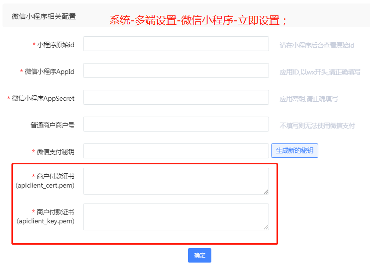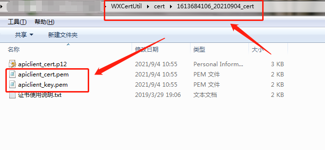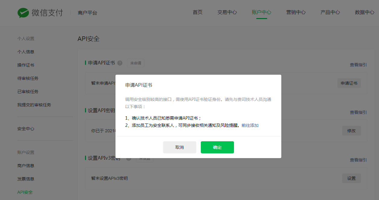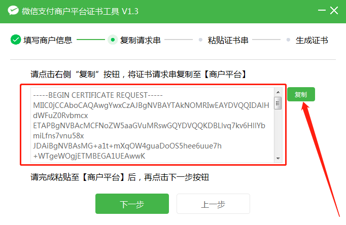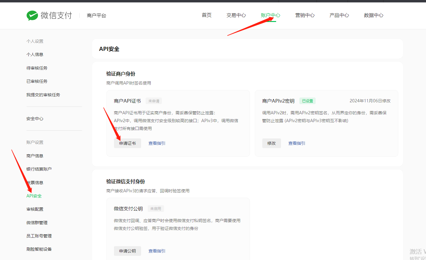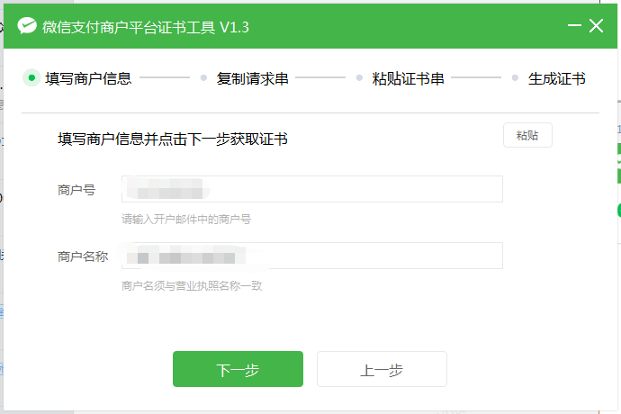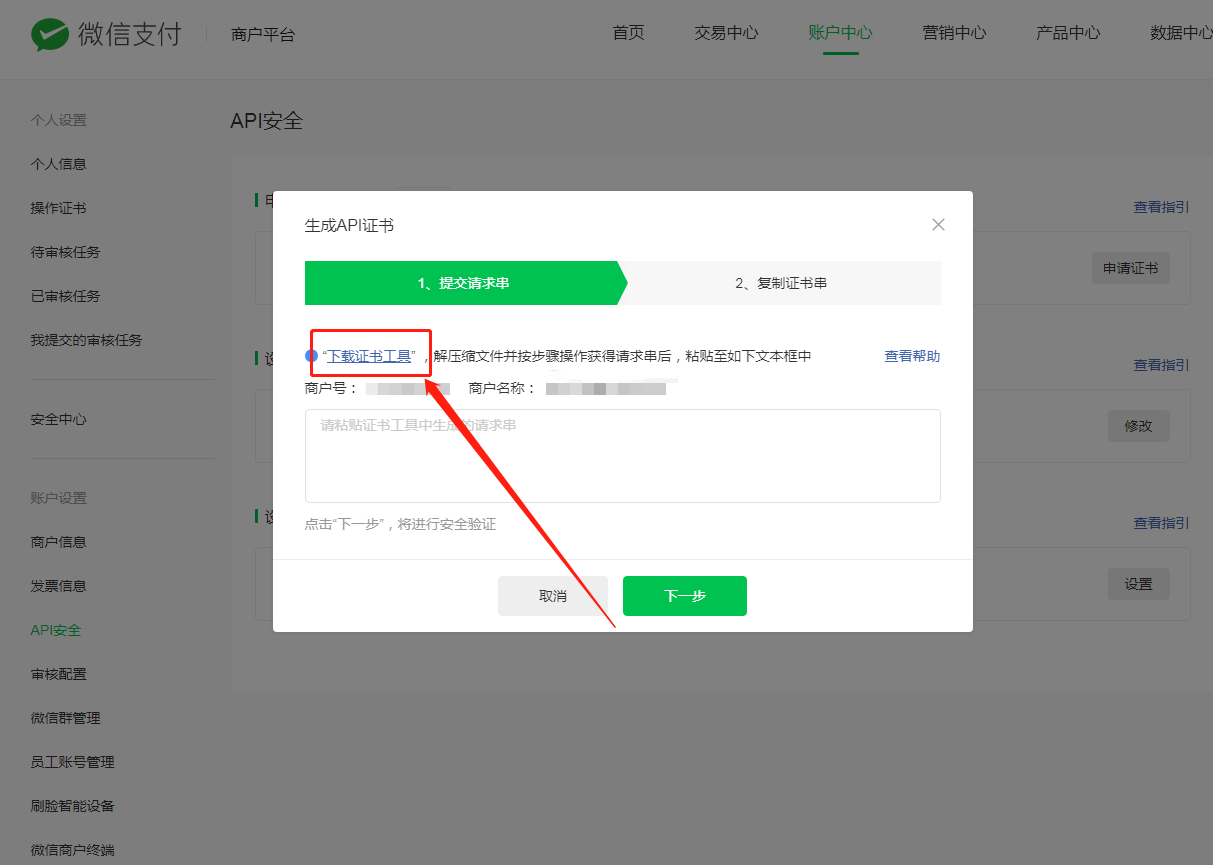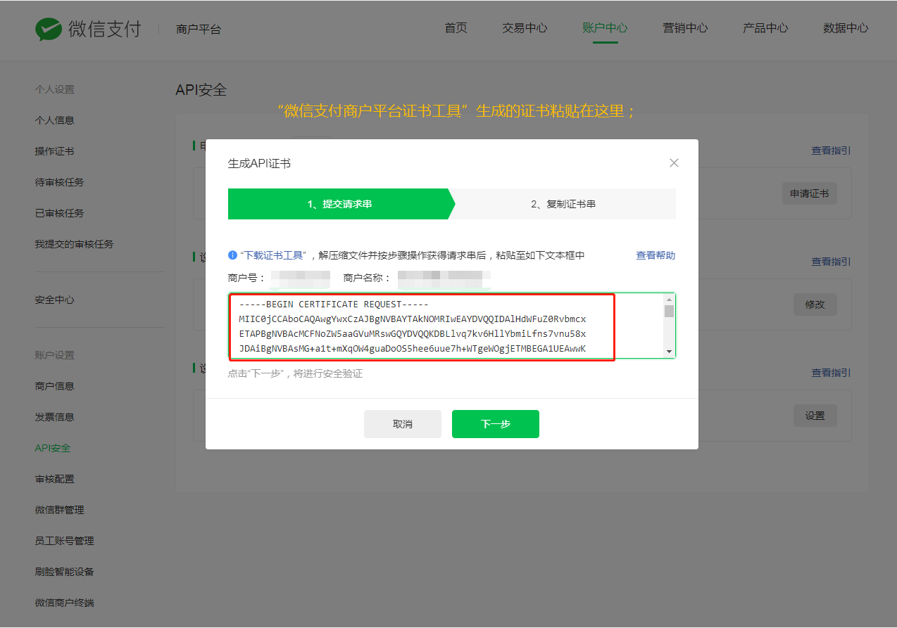 **1、微信支付商户后台:账户中心-API安全-申请API证书(如需绑定安全联系人,可自行前往添加);**   </br>**2、点击"下载证书工具"到本地,点击"申请证书";**   </br>**3、填写"商户号"和"商户名称",点"下一步";**  </br>**4、"微信支付商户平台证书工具"生成的秘钥,复制到商户后台,粘贴请求串,然后点"下一步";**   </br>**5、生成证书串,然后"复制证书串"到"微信支付商户平台证书工具",点"下一步",即"申请证书成功",然后下载证书到本地;**  </br>**6、授权成功的"微信支付API证书"下载到本地;**   </br>**7、证书可用"txt"文本格式打开,复制证书字符串到系统后台;**