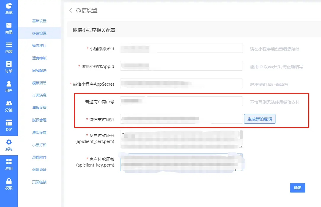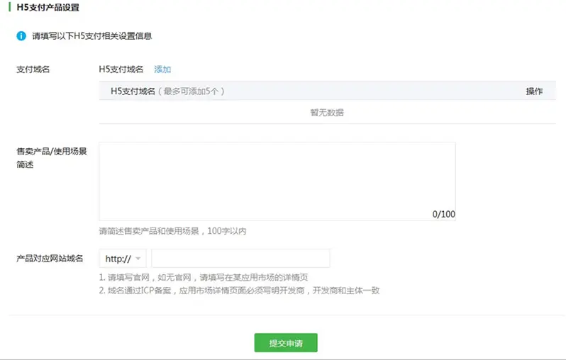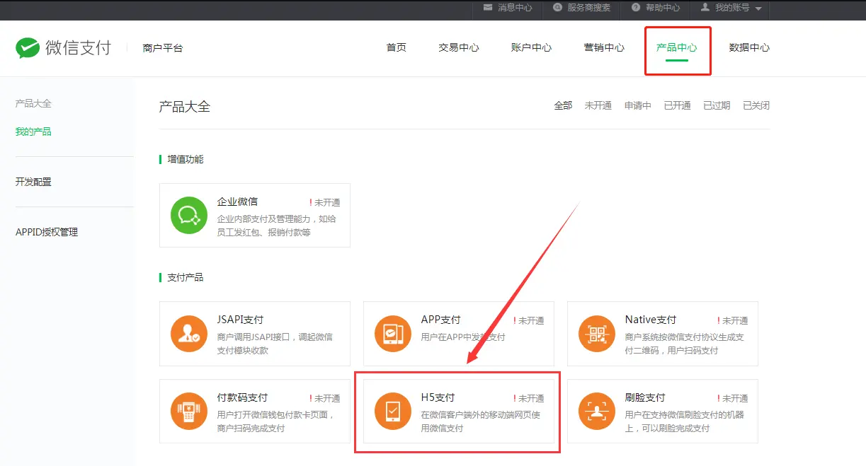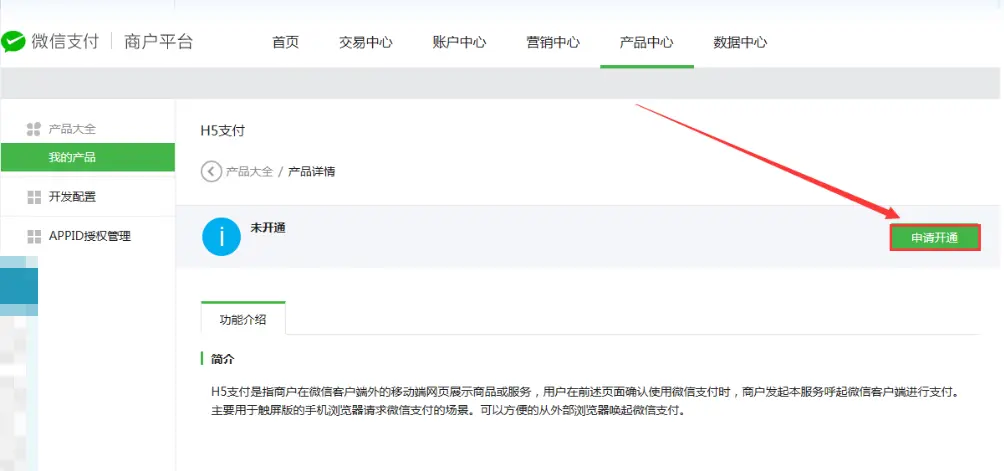 ## 开通微信H5支付 ### H5支付介绍 H5支付是指商户在微信客户端外的移动端网页展示商品或服务,用户在前述页面确认使用微信支付时,商户发起本服务呼起微信客户端进行支付; 主要用于触屏版的手机浏览器请求微信支付的场景,即通过微信H5支付可以实现在非微信浏览器(如QQ浏览器、谷歌浏览器、Safari等)中使用微信支付的场景; 可以方便从外部浏览器唤起微信支付; ### 申请流程 H5支付申请方法:https://kf.qq.com/faq/170816qiI3Aj170816RVzYjM.html 登录【商户平台】,在【产品中心->产品大全->我的产品->H5支付】点击【申请开通】 ;     #### 微信商户号H5支付开通后  ### 系统后台微信支付配置 手机浏览扫码打开H5端二维码,可查看H5端并进行操作;