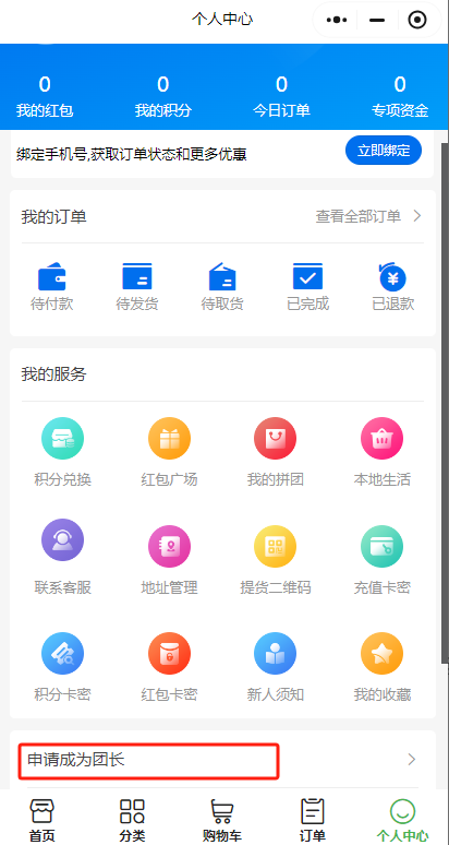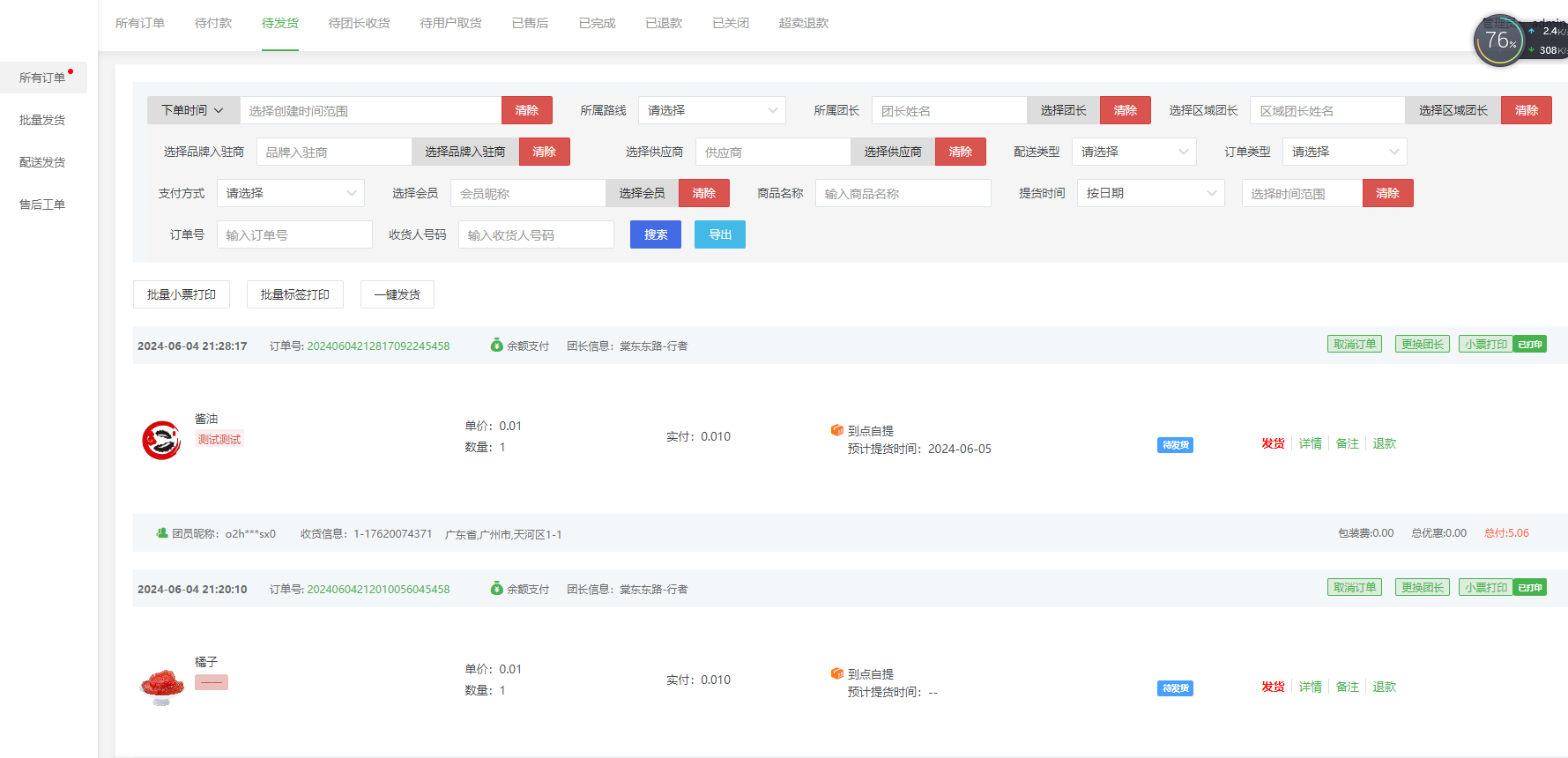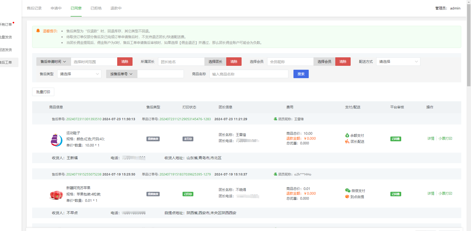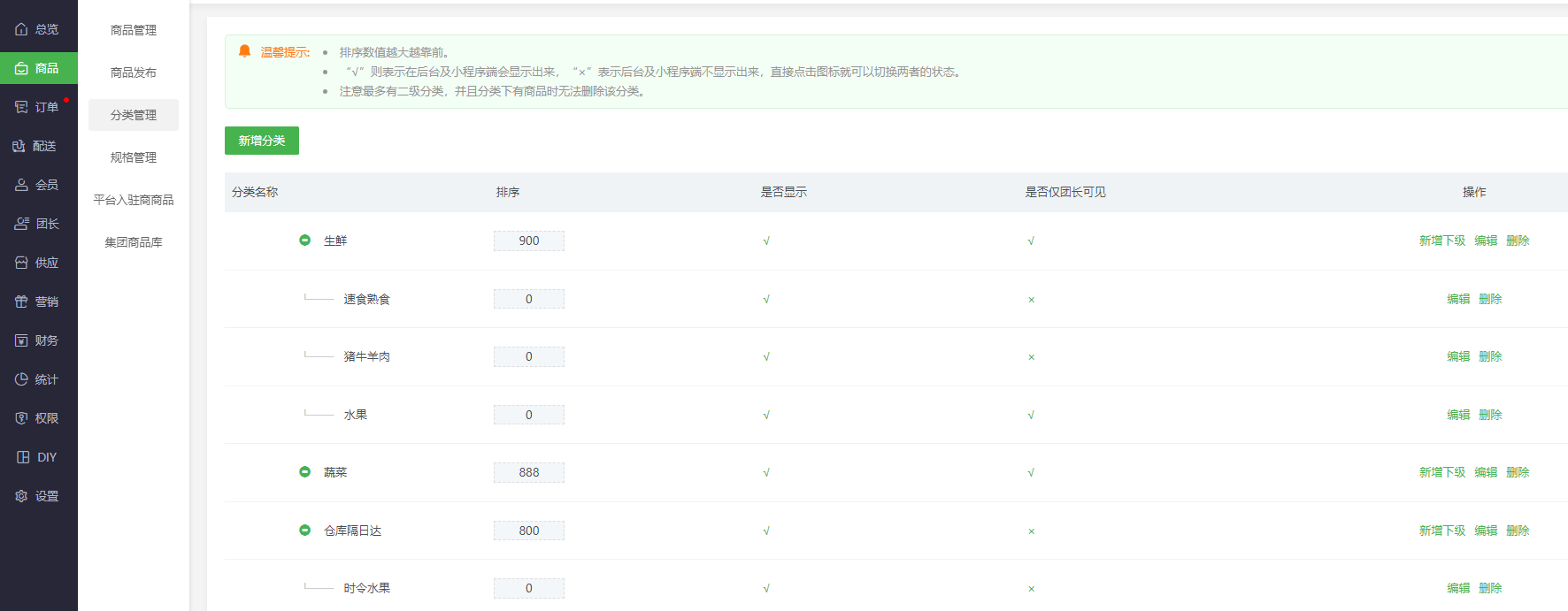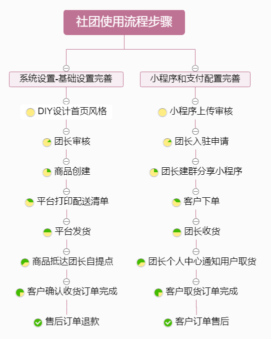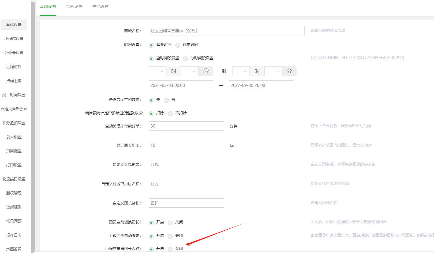 ## 基础设置  ### 1、团长入驻开启  ### 2、商品创建,先编辑分类,一定要创建二级分类。  ## 创建商品  ### 3、小程序上线后,招募团长,团长到小程序的个人中心去申请。   #### 后台团长审核列表-审核  #### 团长申请成功之后,个人中心可以直接进入团长中心,查看数据。 ### 4,发货流程  #### 客户成功下单,点击发货,如果是到点自提,平台会将商品发到对应的团长点部,由客户上门到团长点部自提。 ### 5、配送-清单-新版功能  #### 我们可以采用团长旗下订单,打印出当天团长的旗下客户订单,方便客户到点自提核对商品信息。 ### 6、售后订单  #### 待审核订单,直接点击同意,则金额直接退回客户原账户。