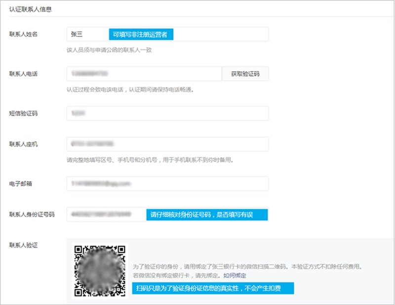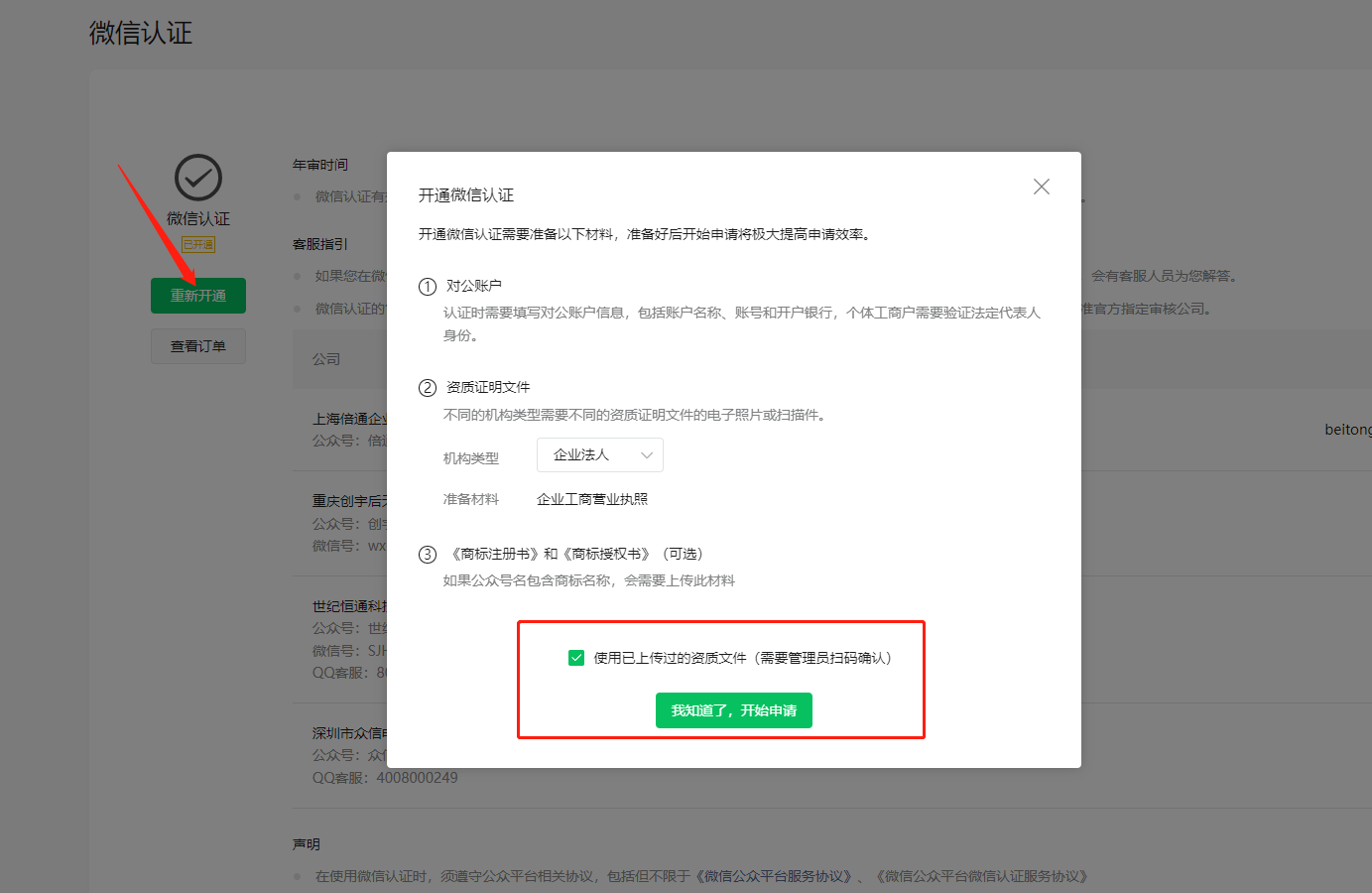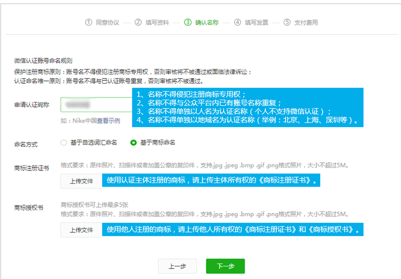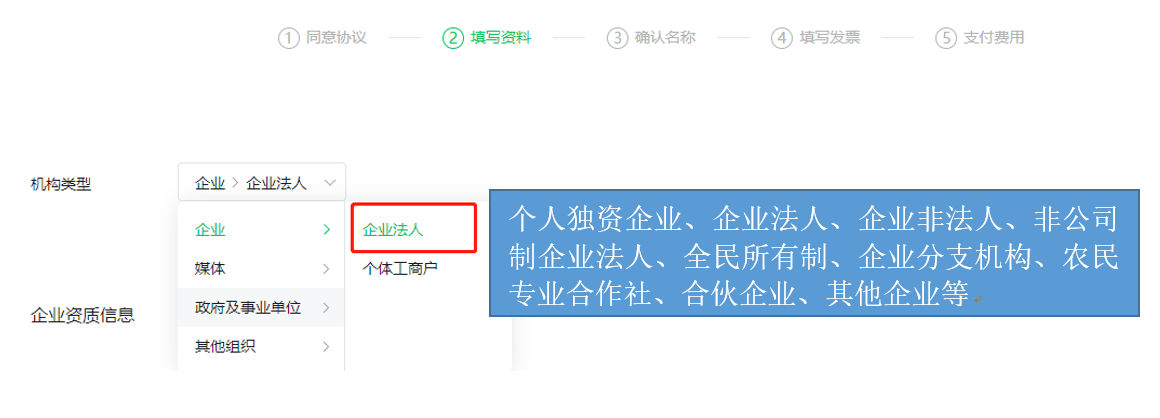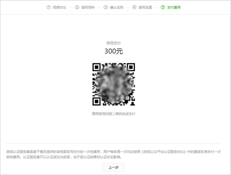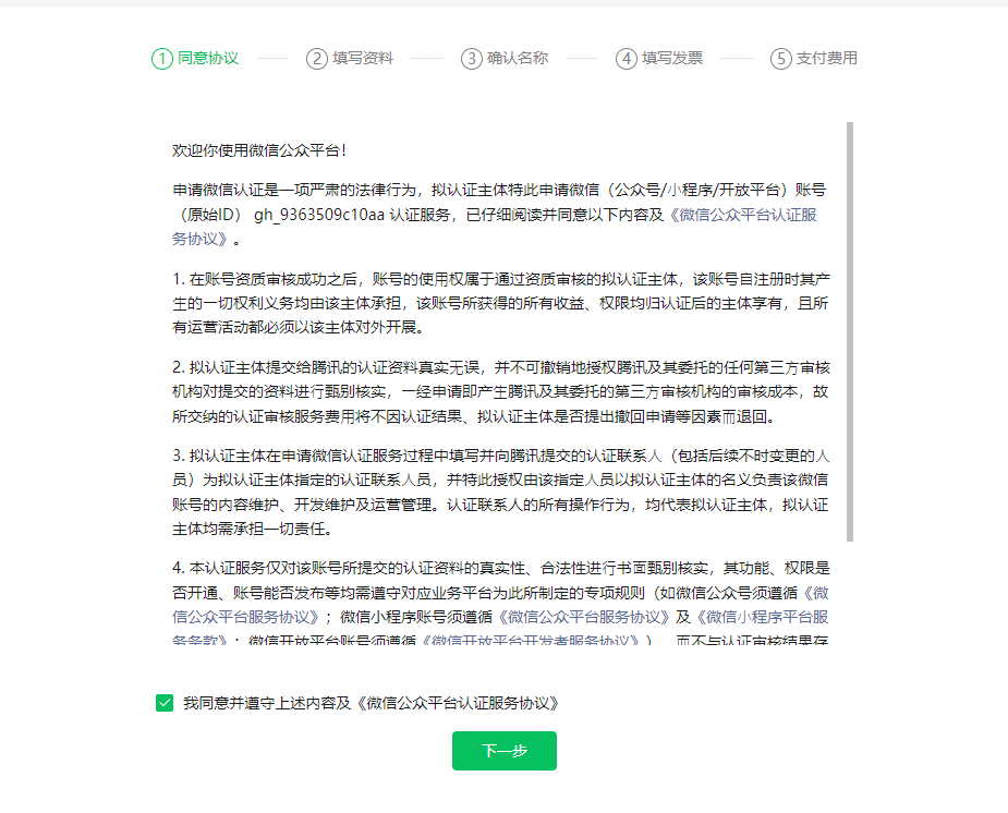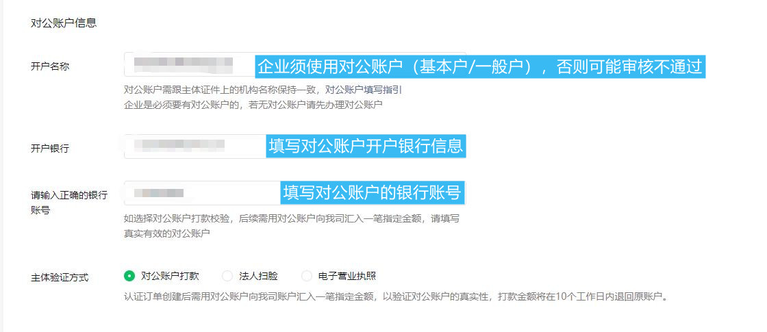 微信认证指注册和认证公众号同时进行,申请后公众号即为认证加“V”的公众账号(若您后续账号需要微信认证,也可选择微信认证方式来注册公众号),微信认证服务审核费300元/次/年。 注: 1)个体工商户申请微信认证时无需填写对公银行账户信息; 2)企业必须要有对公账户,请先办理对公账户再申请公众号或认证; 3)事业单位如无对公账户,可以使用结算中心或财政账户支付验证(如国库集中收付结算中心等); 4)组织机构申请微信认证需要有对公账户,若无请先办理好对公账户; 5)政府机关类型若没有对公账号,可以在“机构开户银行”、“机构银行账号”栏填写“无”; 1、登录注册好的公众号,点击账号-认证详情,开通微信认证   2、同意协议  3、填写资料,选择机构类型、输入企业资质信息、对公账户信息(个体户不需要填写)、联系人信息     4、确认名称  5、填写发票  6、支付费用
