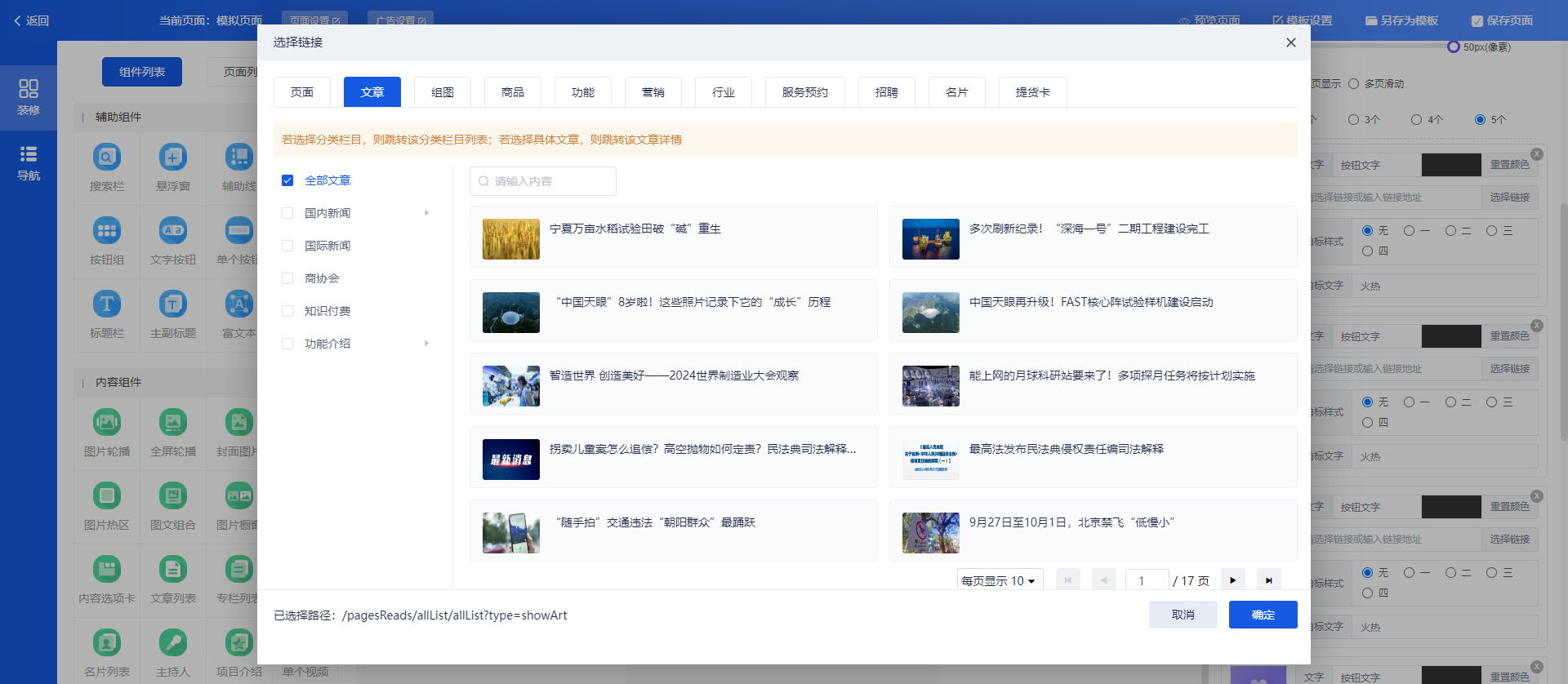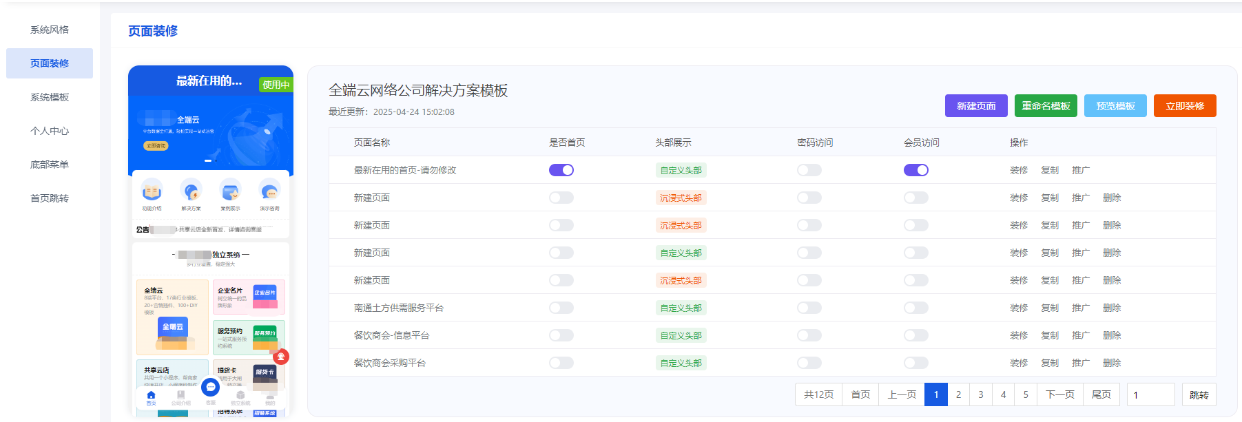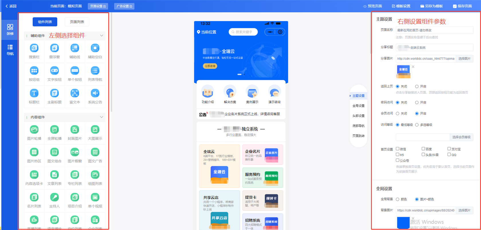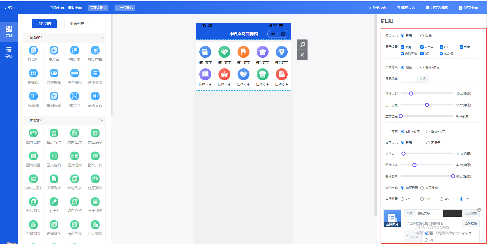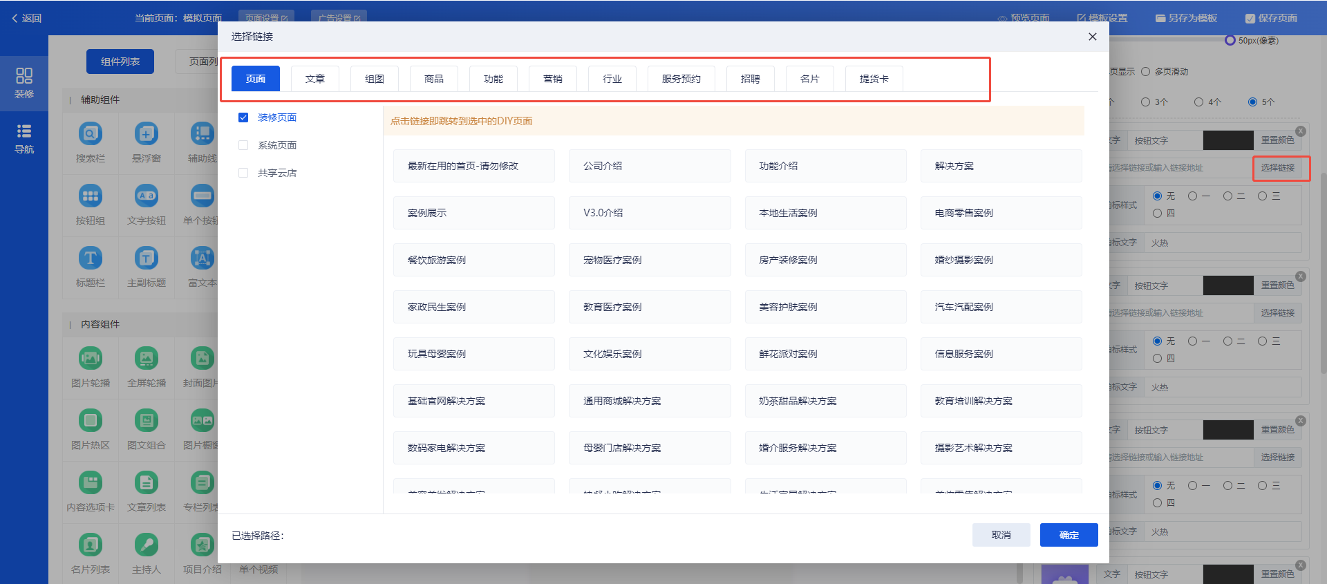 ## DIY布局页面主要用于小程序页面创建,如果自己不会设计,建议套用系统模板 #### 1、页面装修外部可以查看小程序页面展示样式  #### 2、点击立即装修进入DIY详情页,根据自身需求选择对应组件,随心DIY属于自己的专属小程序页面 #### 左侧选择组件,右侧设置组件参数   #### 3、链接跳转:添加组件可链接跳转到系统内新建的任意DIY页面以及系统内部页面