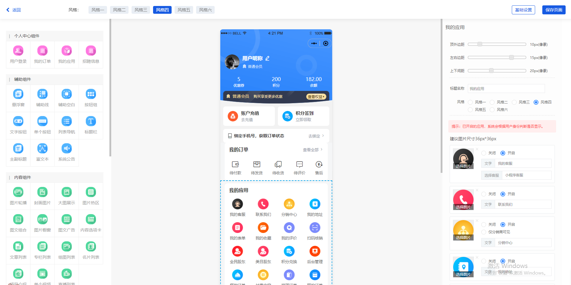 ### 【功能介绍】 #### DIY个人中心可以通过模块添加与拖拽自定义个人中心样式和内容,官方提供6套个人中心风格模板适应不同风格需求
