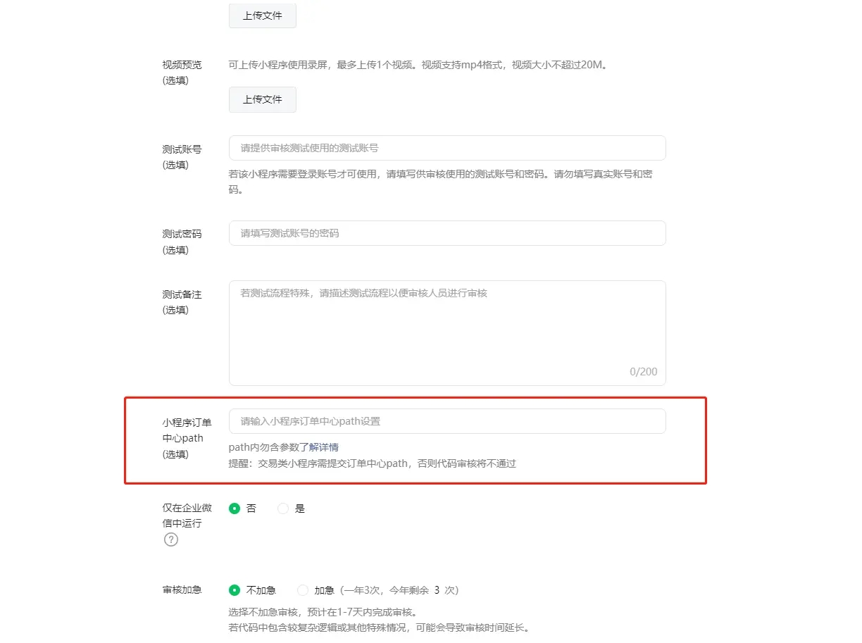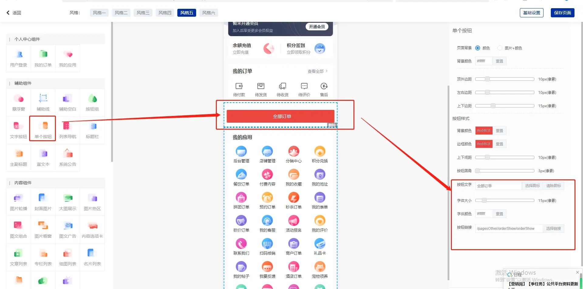 ## 如何配置订单中心path ### 订单中心path路径: /pagesOther/orderShow/orderShow 1、在设计—个人中心这边加个单个按钮,名字写成全部订单,然后把订单中心路径复制到按钮链接里去:/pagesOther/orderShow/orderShow   <br>2、微信公众平台内提交审核时填入下图所圈之处