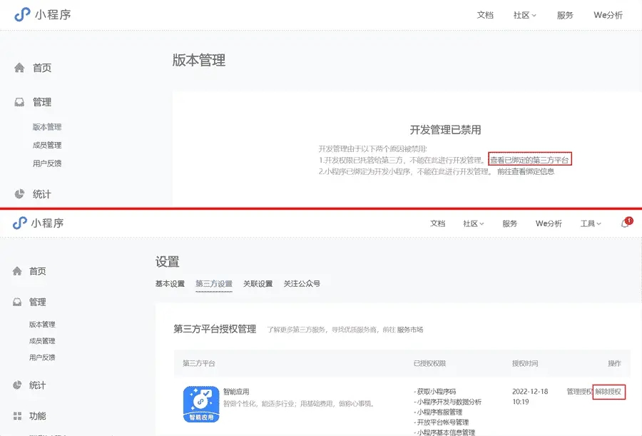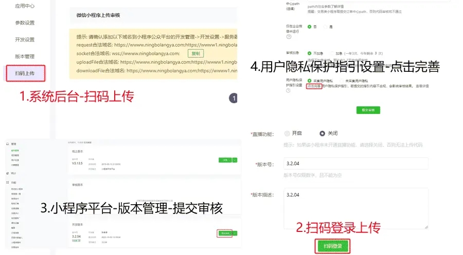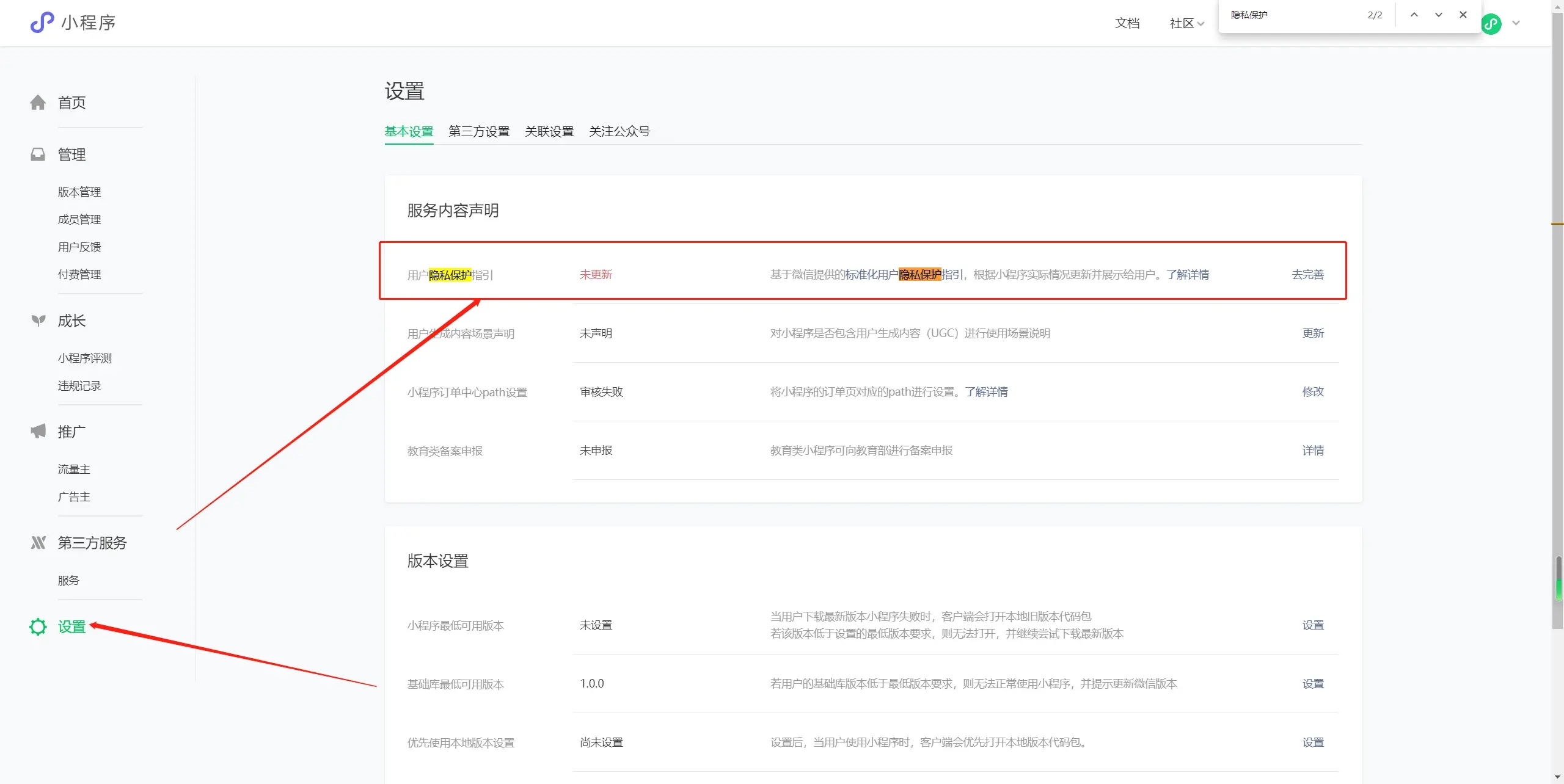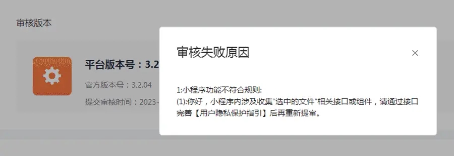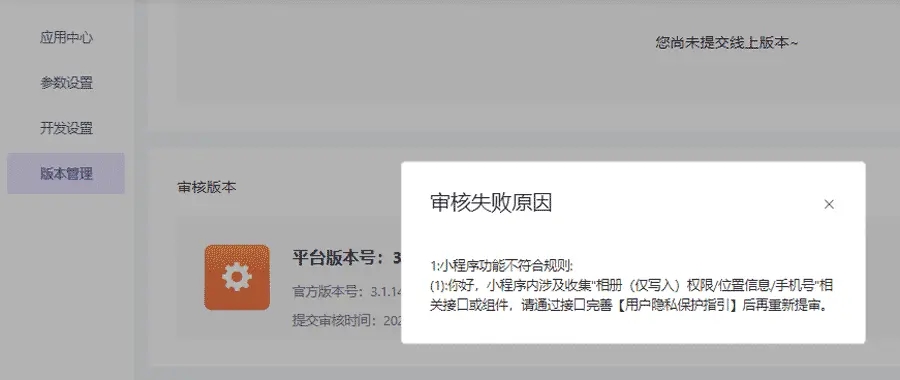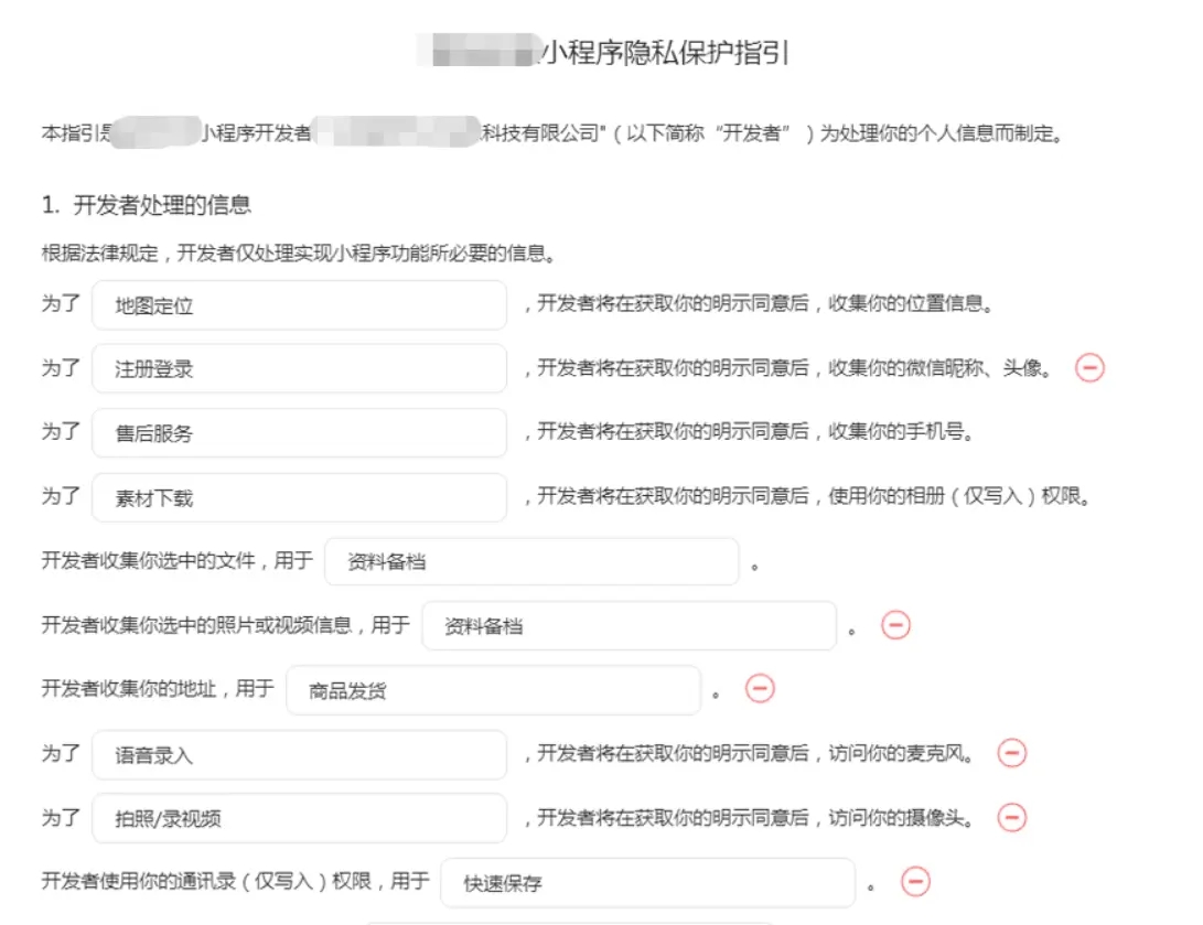 ## 审核驳回,隐私保护指引配置 ### 一键授权对接第三方开放平台时提示“隐私保护协议权限不足”,原因:用户隐私保护指引缺少相关接口和组件   #### 解决方法:小程序平台,完善用户隐私保护指引 方法1:小程序平台-设置-基本设置-功能设置-服务内容声明-用户隐私保护指引设置(增加信息类型) (若没有指引设置入口,请见方法2)  方法2:转为手动提审时更新完善,步骤如下 1)解绑第三方开放平台,小程序平台-版本管理-查看已绑定的第三方平台-停止授权<span style="color: red">(推荐)  应用-微信小程序-设置-参数设置-一键取消第三方授权  2)系统后台-扫码上传前端-小程序平台-版本管理-提交审核-用户隐私保护指引设置  手动添加隐私保护指引样板,1比1复刻(增加信息类型)  为了地图定位,开发者将在获取你的明示同意后,收集你的位置信息。 为了注册登录,开发者将在获取你的明示同意后,收集你的微信昵称、头像。 为了售后服务,开发者将在获取你的明示同意后,收集你的手机号。 为了素材下载,开发者将在获取你的明示同意后,使用你的相册(仅写入)权限。 为了发货收货,开发者将在获取你的明示同意后,收集你的位置信息。 为了语音录入,开发者将在获取你的明示同意后,访问你的麦克风。 为了拍照/录视频,开发者将在获取你的明示同意后,访问你的摄像头。 开发者收集你选中的文件,用于资料备档。 开发者收集你选中的照片和视频信息,用于资料备档。 开发者收集你的地址,用于商品发货。 开发者使用你选中的通讯录(仅写入)权限,用于快速保存。 开发者获取你选择的位置信息,用于发货/上门。 开发者读取你的剪切板,用于订单编号复制。