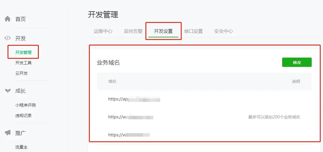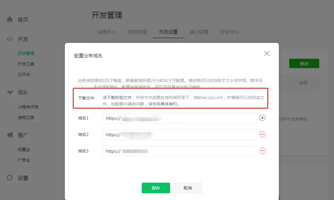 ### 注意事项 -小程序账户必须为已认证帐号(否则没有业务域名输入栏); -跳转的外部链接的域名以及此站点下所有涉及到的域名都要配置ssl,即可以用https打开站点; -跳转的外部链接的域名以及此站点下所有涉及到的域名都要添加到这个小程序后台的业务域名中; -跳转网页页面必须为全站https,包括css、js、js代码(域名统计代码); ### 系统后台配置 -系统后台跳转外部网页配置:功能-网页;比如通过 "按钮组、单个按钮" 等功能配置跳转网页功能  ### 小程序后台配置 -公众平台小程序后台:开发 - 开发管理 - 开发设置 - 业务域名,配置需要跳转的外部网页的域名  ### 业务域名配置 -业务域名必须配置SSL证书; #### 全端云根目录public-配置业务域名需下载校验文件,下载的校验文件上传到业务域名所在的站点根目录,并确保可以访问该文件,全端云根目录public