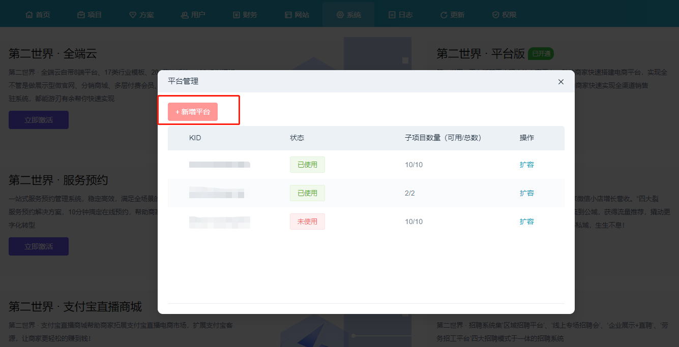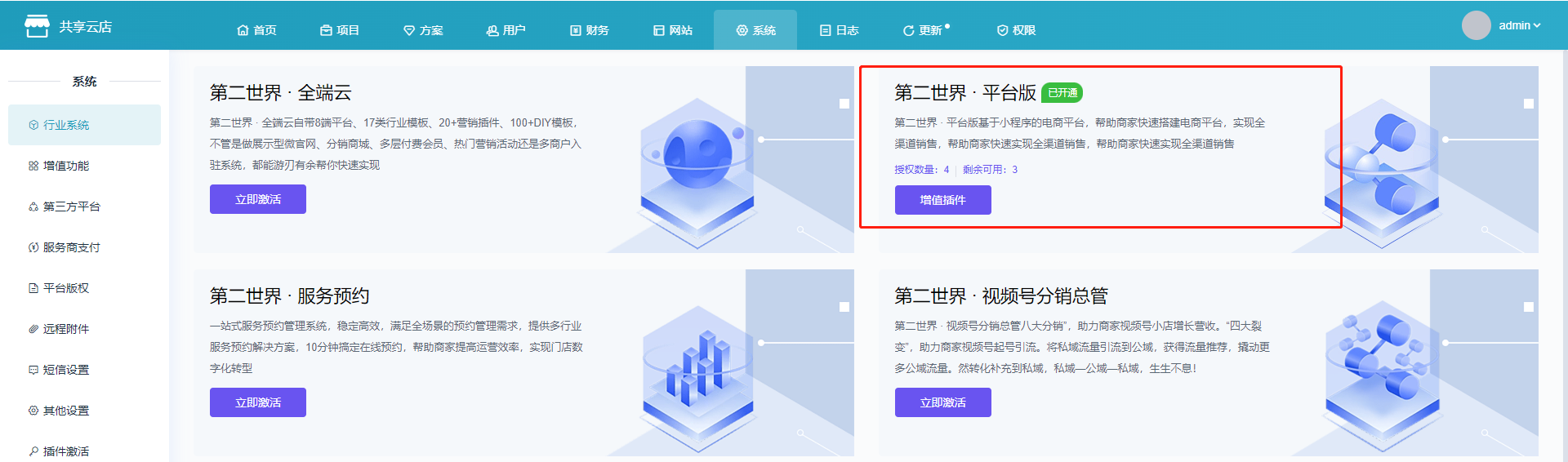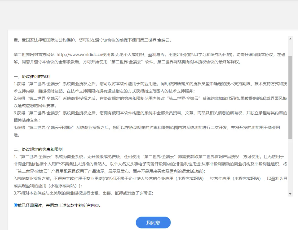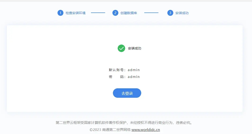 ## 安装教程 ### <span style="color: red">【注意事项】:ionCube扩展跟全端云系统冲突,php7.2不可安装ionCube扩展,若php7.2安装需卸载,可将ionCube扩展安装至其他php版本; ### 一、系统环境 1、系统仅支持安装php7.2; 2、数据库:建议Mysql5.7及以上; 3、redis; ### 二、配置php7.2的扩展 安装fileinfo、redis、bz2、gmp扩展,建议安装opcache扩展 ### 三、新建站点 1、创建站点:配置域名、php版本7.2、数据库创建  <br>2、在浏览器输入域名,页面提示站点创建成功  ### 四、下载安装包 1、点击站点根目录,进入站点目录文件夹,删除新建站点默认已有的文件   <br>2、上传或者下载项目安装包 方法1: 如果项目包已下载到本地,通过本地上传项目安装包  方法2:宝塔中直接远程下载 安装包远程下载路径:https://cdn.worldidc.cn/worldidc_cloud/worldidc_cloud332025011701.zip  3、解压安装包  ### 五、配置站点 1、 配置运行目录,选择“/public”  2、伪静态配置 Nginx伪静态配置,选择:thinkphp   3、 配置域名SSL证书(域名的SSL证书必须配置)  ### 六、PHP扩展安装:fileinfo、redis、gmp、bz2   ### 七、安装流程:开始安装系统 1、进入安装页面 完成以上步骤,在浏览器输入安装路径:http://域名  (1)按照提示,点击"我同意" 2、开始安装 未安装swoole插件,参考如下配置(配置Swoole Loader,直接复制,无需修改)    #### 【注意事项】 1、如果环境检查有提示扩展未安装,请安装下方说明配置扩展; 2、确认第二步中的 swoole_license 是否配置; #### swoole配置语句(直接从上图中复制): extension=项目站点目录/public/swoole_loader72.so swoole_license_files=项目站点目录/public/swoole-compiler.license   3、数据库参数+Redis参数配置 在宝塔中找到对应的数据库信息,填写完整,点击安装 #### 【注意事项】如果提示"安装失败",请确认数据库信息是否正确,重新操作或联系售后   4、点击进入平台,填入共享云店激活秘钥; 共享云店系统登录默认账号密码 http://域名 账号:admin 密码:admin     6、 如果批量开通授权插件,可将授权文件Newproduct.php上传到如下目录(授权文件在交付邮件中或联系售后) 上传路径:项目站点/application/index/controller  ### <span style="color: red">【注意事项】安装完成后,一定要更新系统,否则无法正常使用!