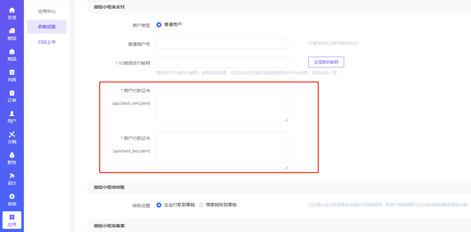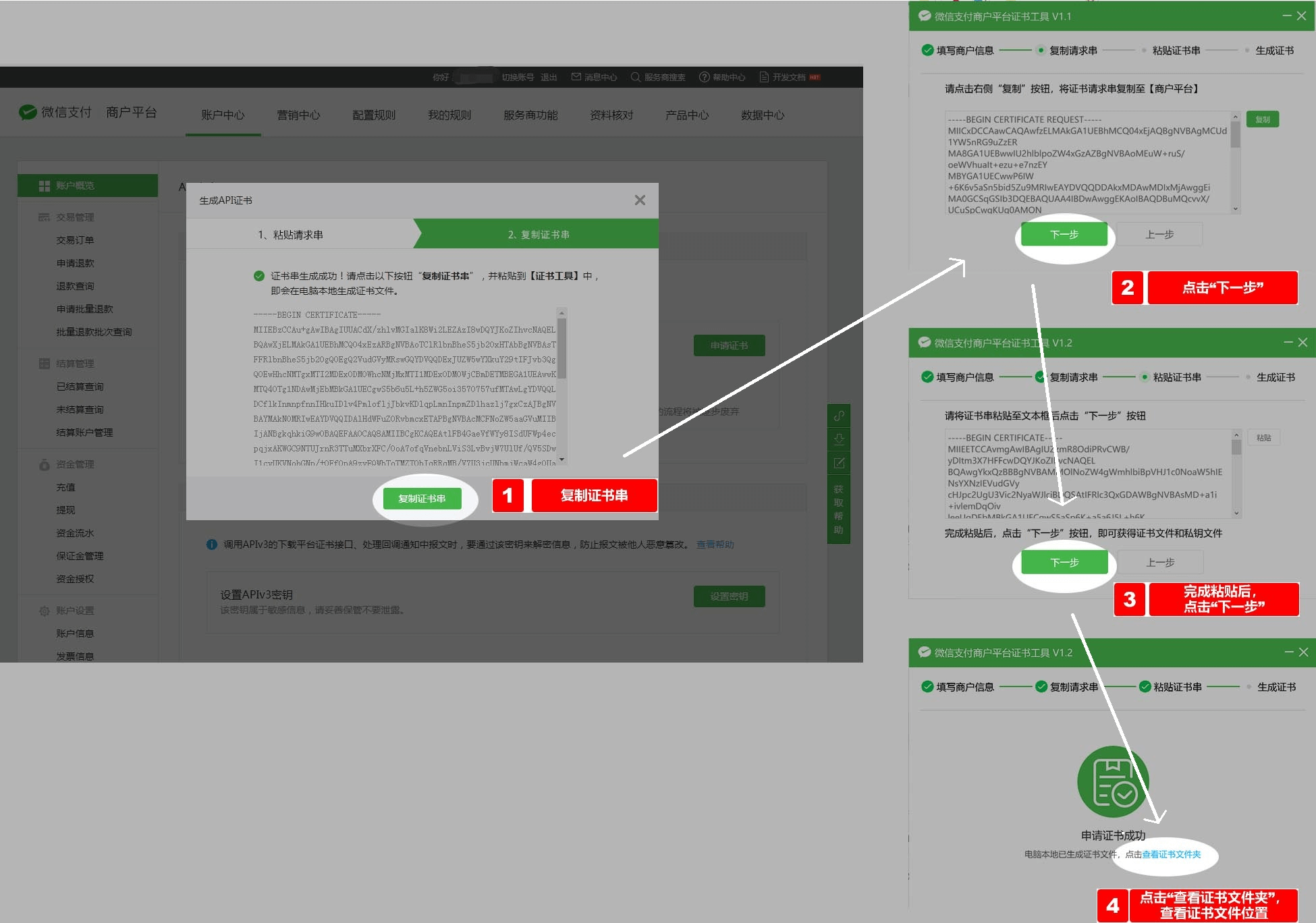 ### 1、微信支付商户后台:账户中心-API安全-申请API证书(如需绑定安全联系人,可自行前往添加)   ### 2、点击"下载证书工具"到本地,点击"申请证书"   ### 3、填写"商户号"和"商户名称",点"下一步" 3、填写"商户号"和"商户名称",点"下一步"  ### 4、"微信支付商户平台证书工具"生成的秘钥,复制到商户后台,粘贴请求串,然后点"下一步"   ### 5、生成证书串,然后"复制证书串"到"微信支付商户平台证书工具",点"下一步",即"申请证书成功",然后下载证书到本地  ### 6、授权成功的"微信支付API证书"下载到本地   ### 7、证书可用"txt"文本格式打开,复制证书字符串到系统后台