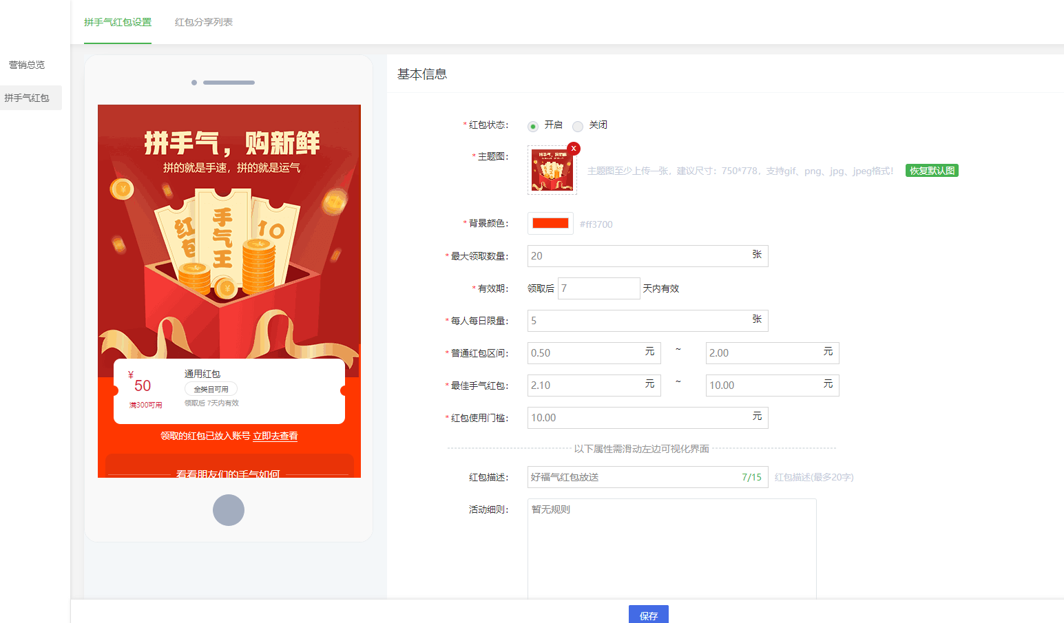 ### 拼手气红包 `插件位置:营销->拼手气红包` - ### 1.插件介绍 - 🚨1、拼手气红包,是用户在支付完订单之后生成一个拼手气红包,转发红包 ### 2.核心功能 - 裂变式营销工具 ### 2.使用流程 ```mindmap # 模块流程 ### 1.创建红包 #### 重点1:创建拼手气红包 #### 重点2:普通红包领取区间 #### 重点3:最佳手气领取区间要大于普通红包设置的数字 ### 4.如何生成拼手气红包 #### 重点1:线上支付 #### 重点2:支付成功后跳转页面会有拼手气红包点击转发到群 ``` ### 4.常见问题 - 无 ### 5.计算逻辑 - 无 ### 6.界面展示
