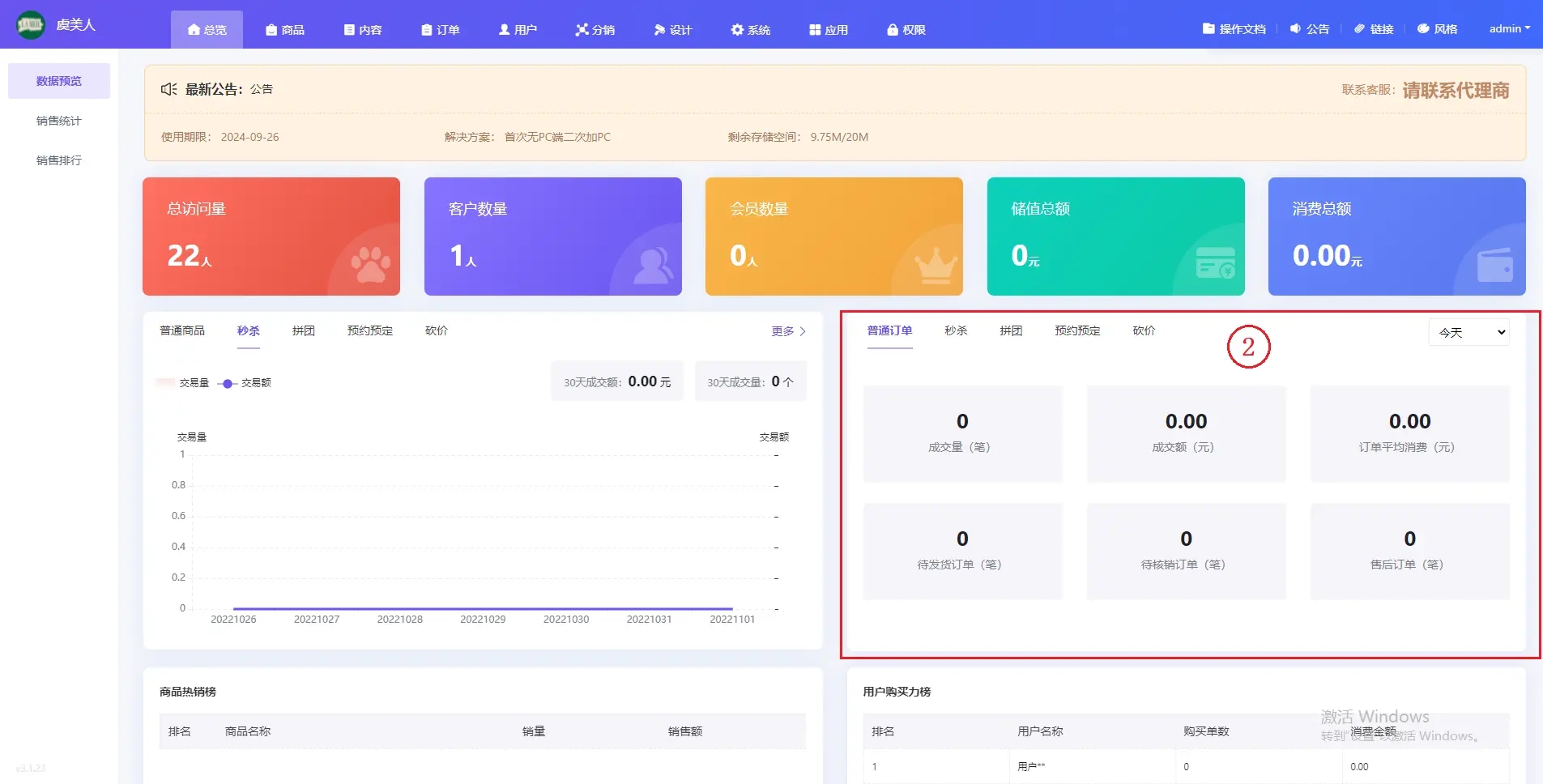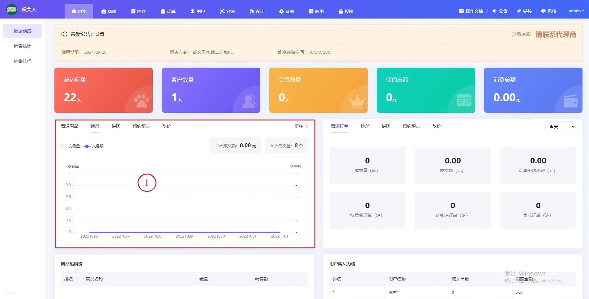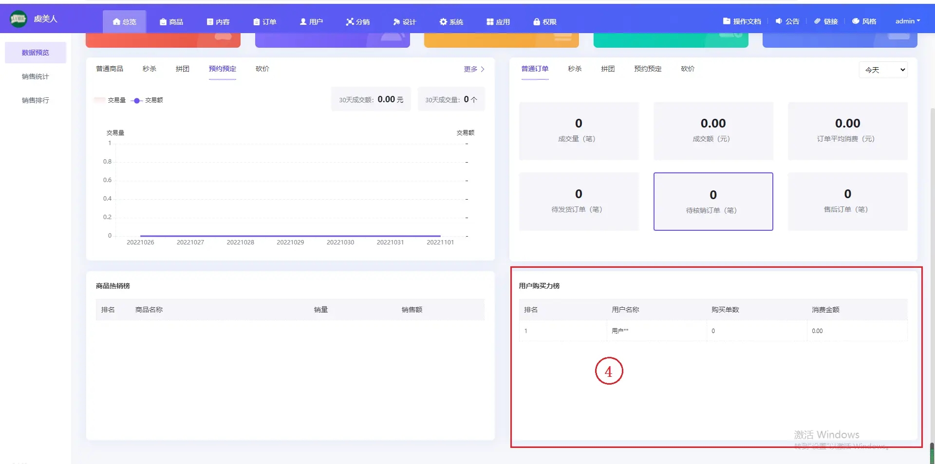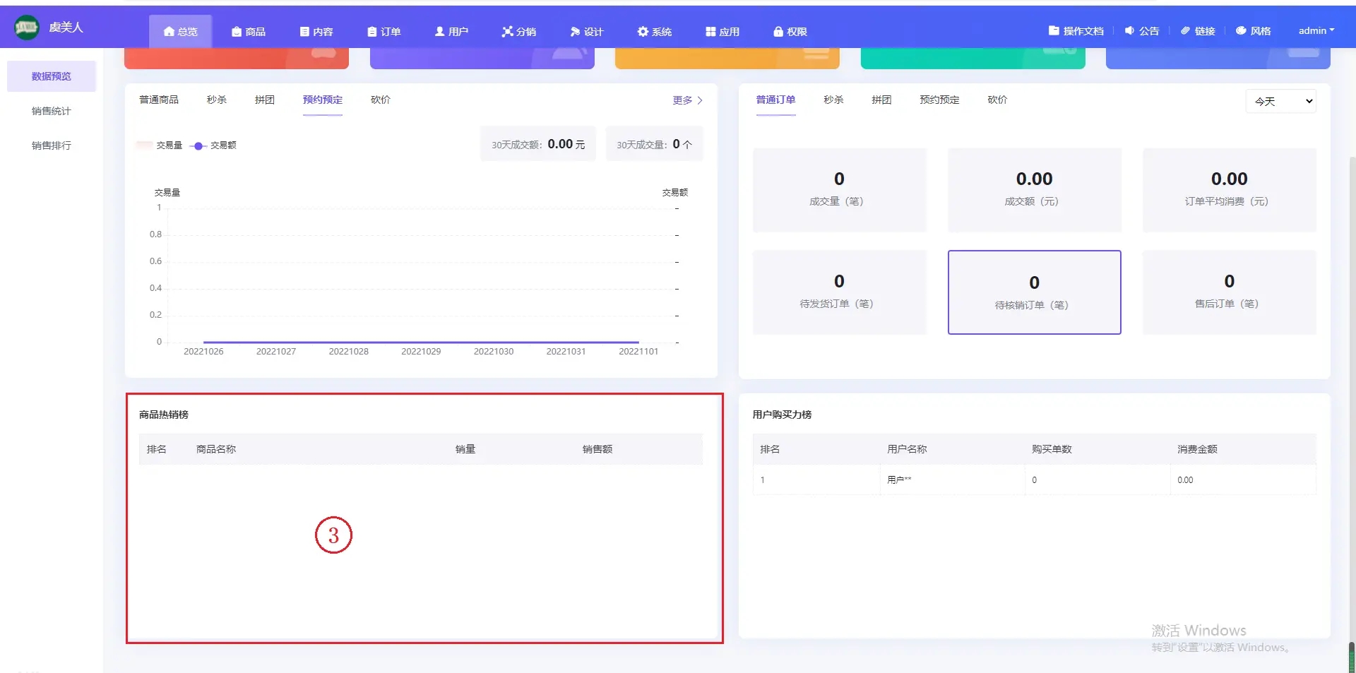 ### 数据总览包含:总访问量、客户数量、会员数量、储值总额、消费总额; ①柱形图和波形图:普通商品、秒杀、拼团、预约预订、砍价商品的一周(周一至周日)交易量和交易额;  ②今天、昨天、最近七天(今天开始过去七天)、最近30天(今天开始过去30天)里 "普通商品、秒杀、拼团、预约预订、砍价"商品的成交量、成交额、订单平均消费、待发货订单、待核销订单、售后订单数;  ③商品热销榜:只针对普通商品;  ④用户购买力榜:针对全部商品;