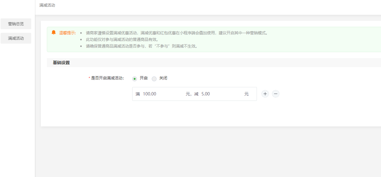 ### 满额立减 `插件位置:营销->满额立减` - ### 1.插件介绍 - 🚨会员购买商品支付达到额度立减X元 ### 2.核心功能 - 满立减活动一定是可以刺激消费者的购买欲望,从而提升平台的销售额,并且在消费者购物时,不满足立减的条件,客户会添加其他合适的商品,从而提升商品销售率和平台最大化利润。 ### 2.使用流程 ```mindmap # 模块流程 ### 1.创建满额立减 #### 重点1:开启满额活动 #### 重点2:设置金额立减 #### 重点3:可创建多个满额立减条件 ### 2.添加商品 #### 重点1:编辑商品选择参与满额立减 ### 4.订单管理 #### 重点1:商品之后参与满额立减活动支付的时候才会优惠 ``` ### 4.常见问题 - 无 ### 5.计算逻辑 - 无 ### 6.界面展示