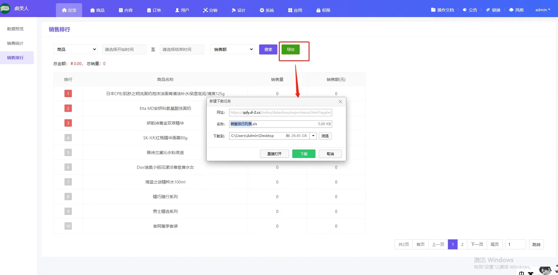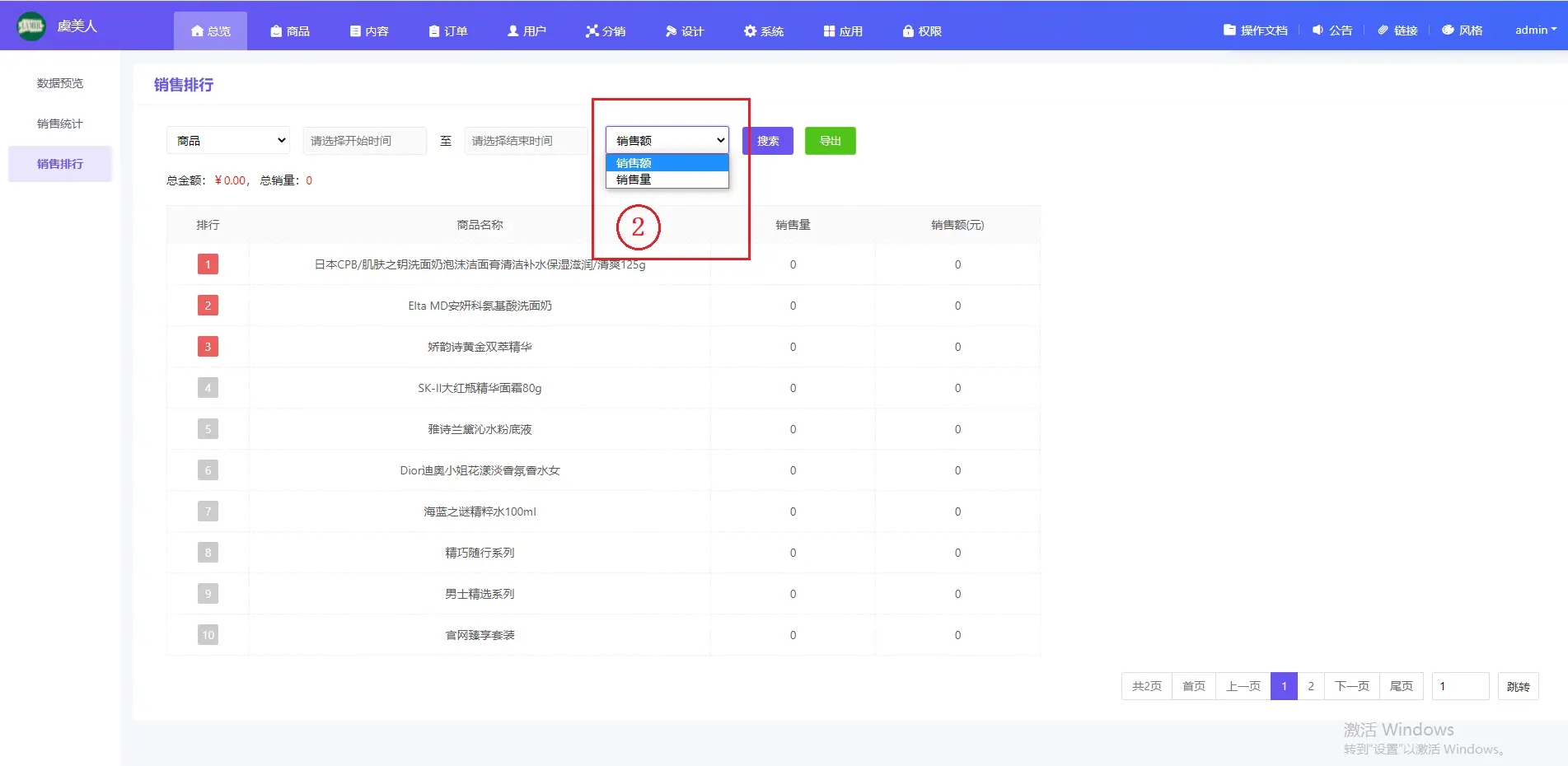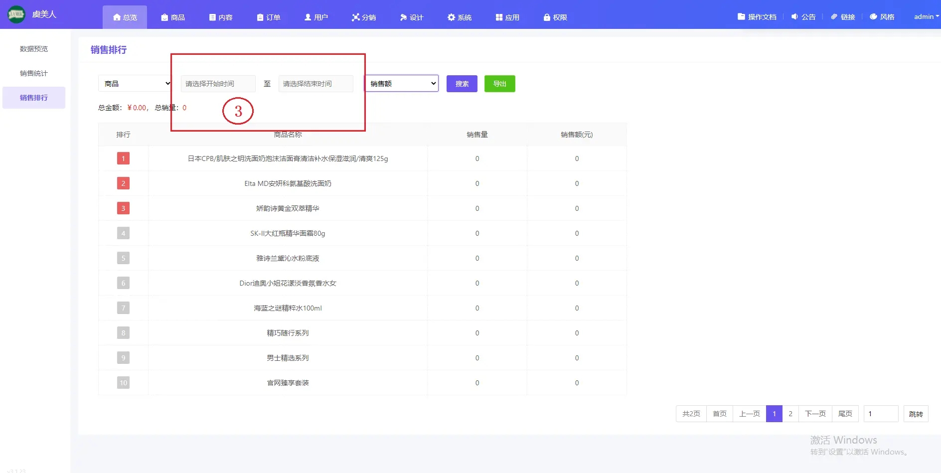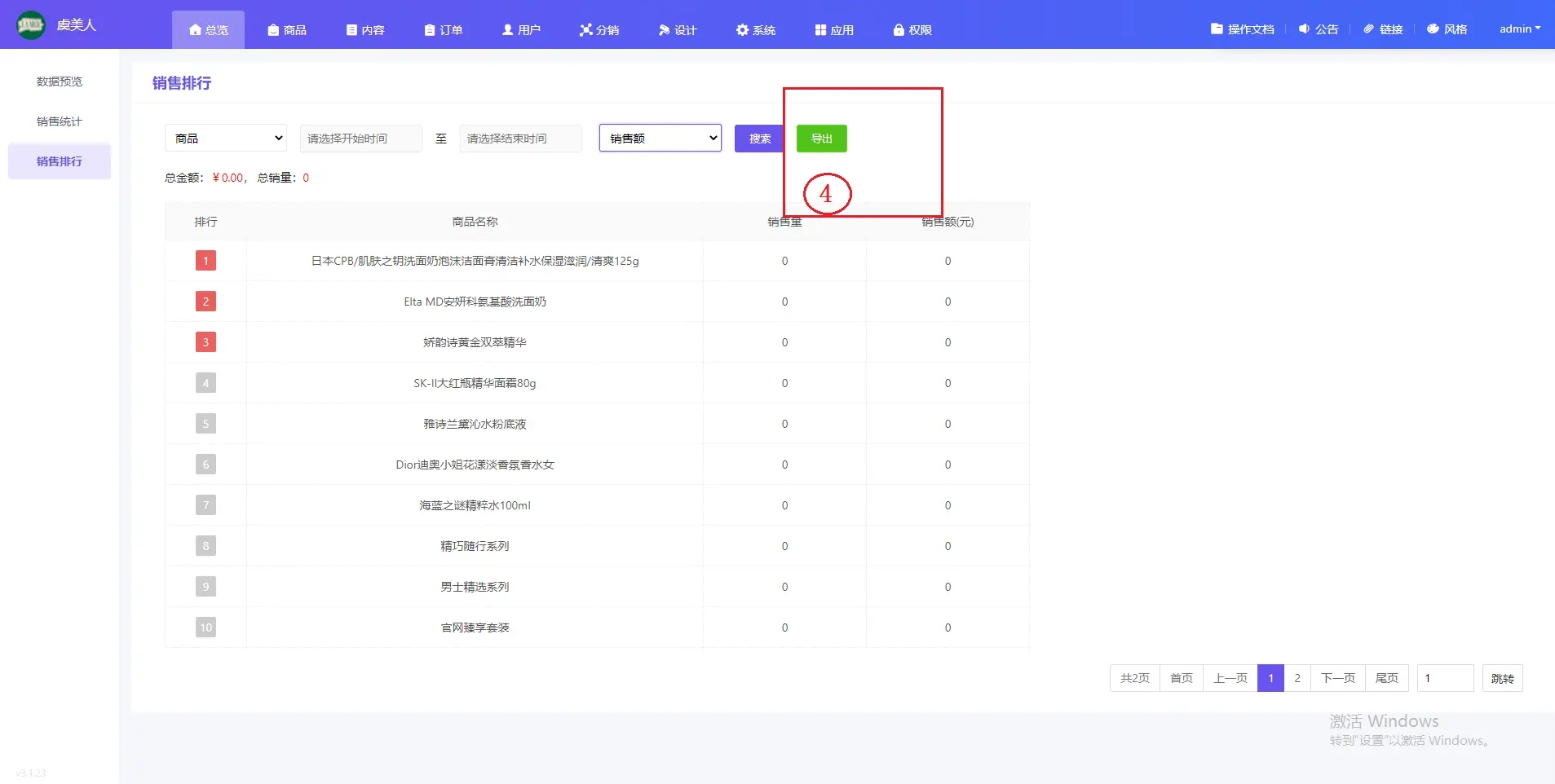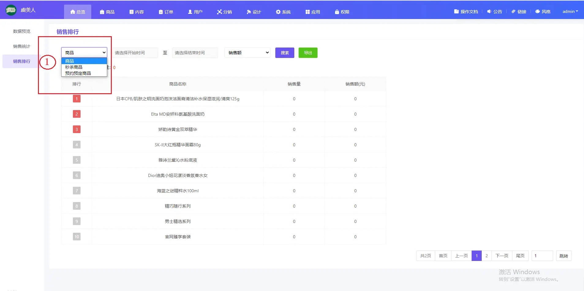 ### 销量排行支持通过:商品类型(普通商品、预约预订、秒杀)、订单开始和截止日期、销售数据(销售额、销售量)查询; ①商品类型(普通商品、预约预订、秒杀)  ②销售数据(销售额、销售量)  ③订单开始和截止日期  ④销量排行支持将查询结果导出excel表格
