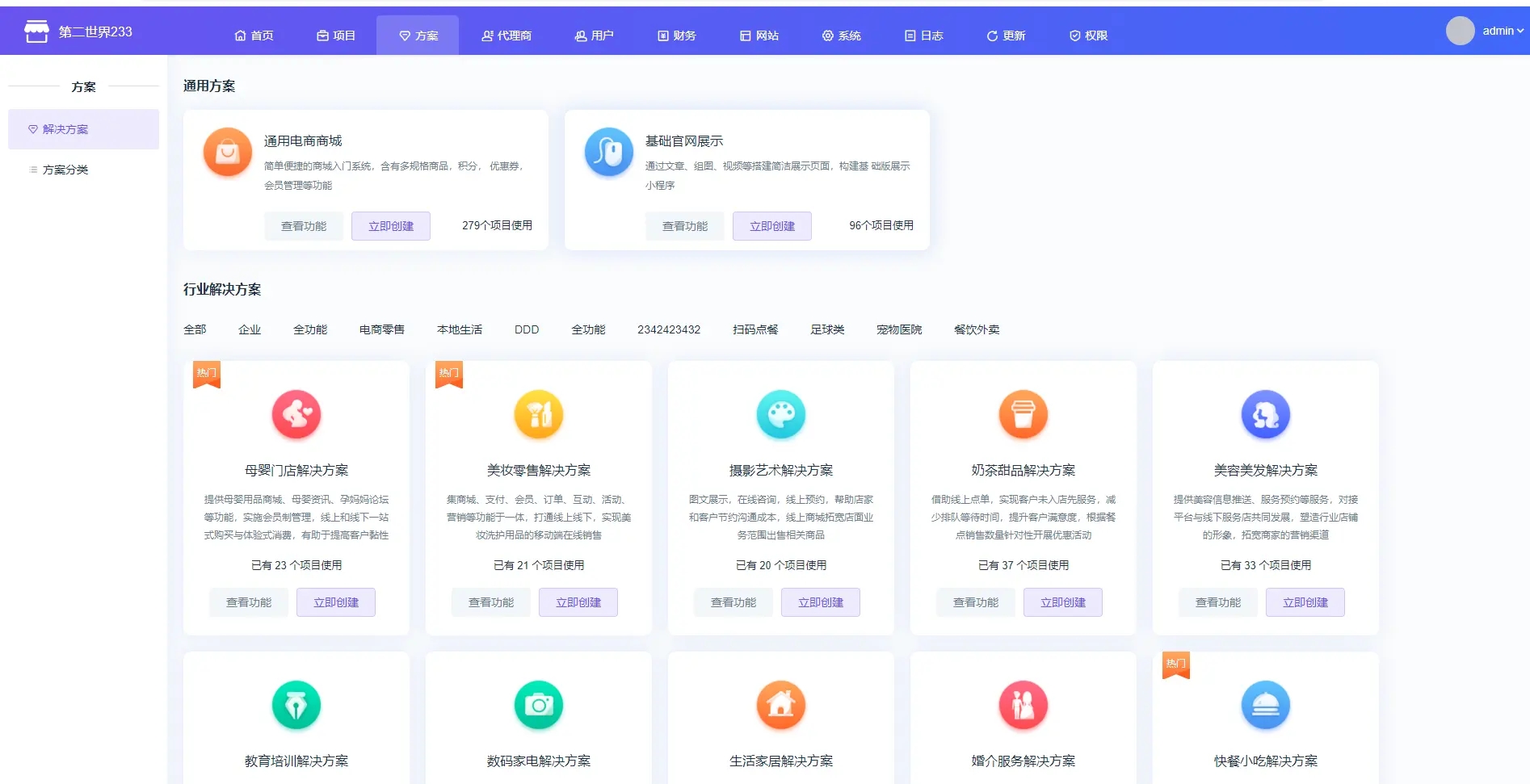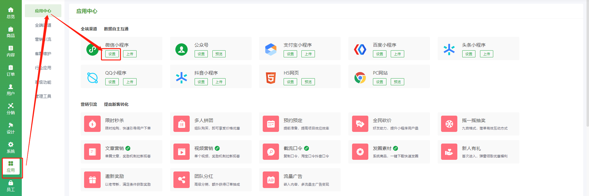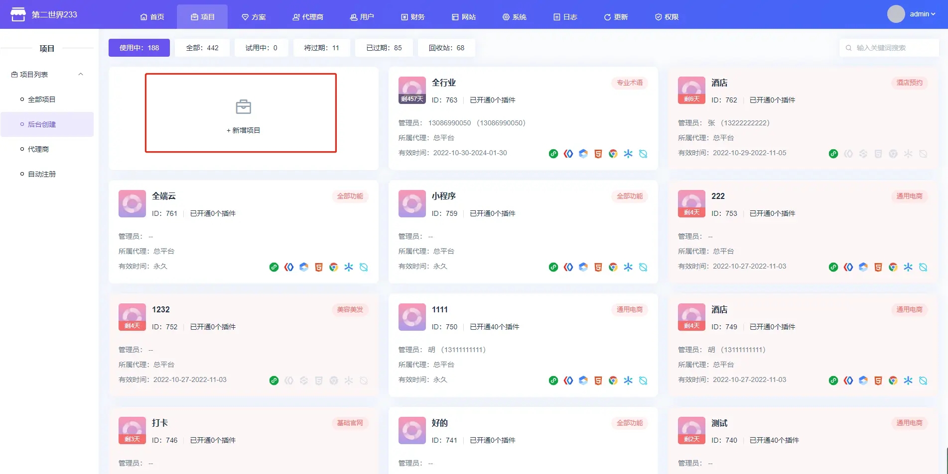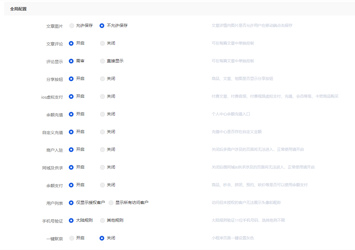 ## **项目实施流程** ### 一、创建项目 #### 【后台创建】仅展示通过系统后台(即:总管理账号)创建的项目;创建项目时选择已有的方案,则复用所选择的方案里已有的权限功能  #### 如何创建项目? #### 1、新建项目  **2、选择项目需要对应的方案,所选的方案也就是项目对应的功能**   **①开通时长:项目可使用的有效期** **②绑定管理员** 选择管理员:选择系统内已有用户作为管理员; 新增管理员:新建管理员的账号密码。 **③版权管理** 平台设置:即全局设置,该项目根据全局设置的版权显示; 单独设置:该项目单独设置版权,不受平台版权影响。   ### <span style="color: red">**④注册设置是必填项,一旦选择保存后则不支持修改,选择之前请认证查看提示,慎重选择**! ⑤选择平台,取决于选择的方案里给的权限 ⑥购买增值功能,取决于选择的方案里给的权限 ### 二、发布上线小程序项目内设置 #### 1、系统基础设置 1)信息设置  2)短信设置 -系统设置:使用总平台配置的短信参数以及短信数量  -单独设置:项目内配置自己的独立短信,支持阿里云和腾讯云短信  3)腾讯地图:配置腾讯地图后小程序内才能获取用户位置  4)全局配置(小程序发布提审之前建议将全局配置内能够关闭的选项都先关闭,待小程序审核通过后再开启)  #### 2、项目内内容添加(商城类的前期只需添加商品,展示类的前期可以只添加文章组图) 1)商品 -首先添加商品分类   -其次添加商品  2)内容 -添加文章需先行添加分类后再进行添加文章   -添加组图需先行添加分类后再进行添加组图   ### 三、小程序页面装修 <span style="color: red">建议可以先使用系统自带模版,等小程序上线成功后,再重新调整小程序首页设计、底部菜单栏和个人中心页面  ### 四、小程序应用设置 应用-微信小程序小程序设置页面,配置小程序参数  #### -小程序参数配置  #### -小程序微信支付配置  ### 五、小程序发布上线 打开应用-小程序上传页面,点击扫码登录,上传小程序版本; 上传版本成功后,打开微信公众平台,扫码登录小程序,在版本管理中提交版本审核,审核通过,小程序即可正式上线