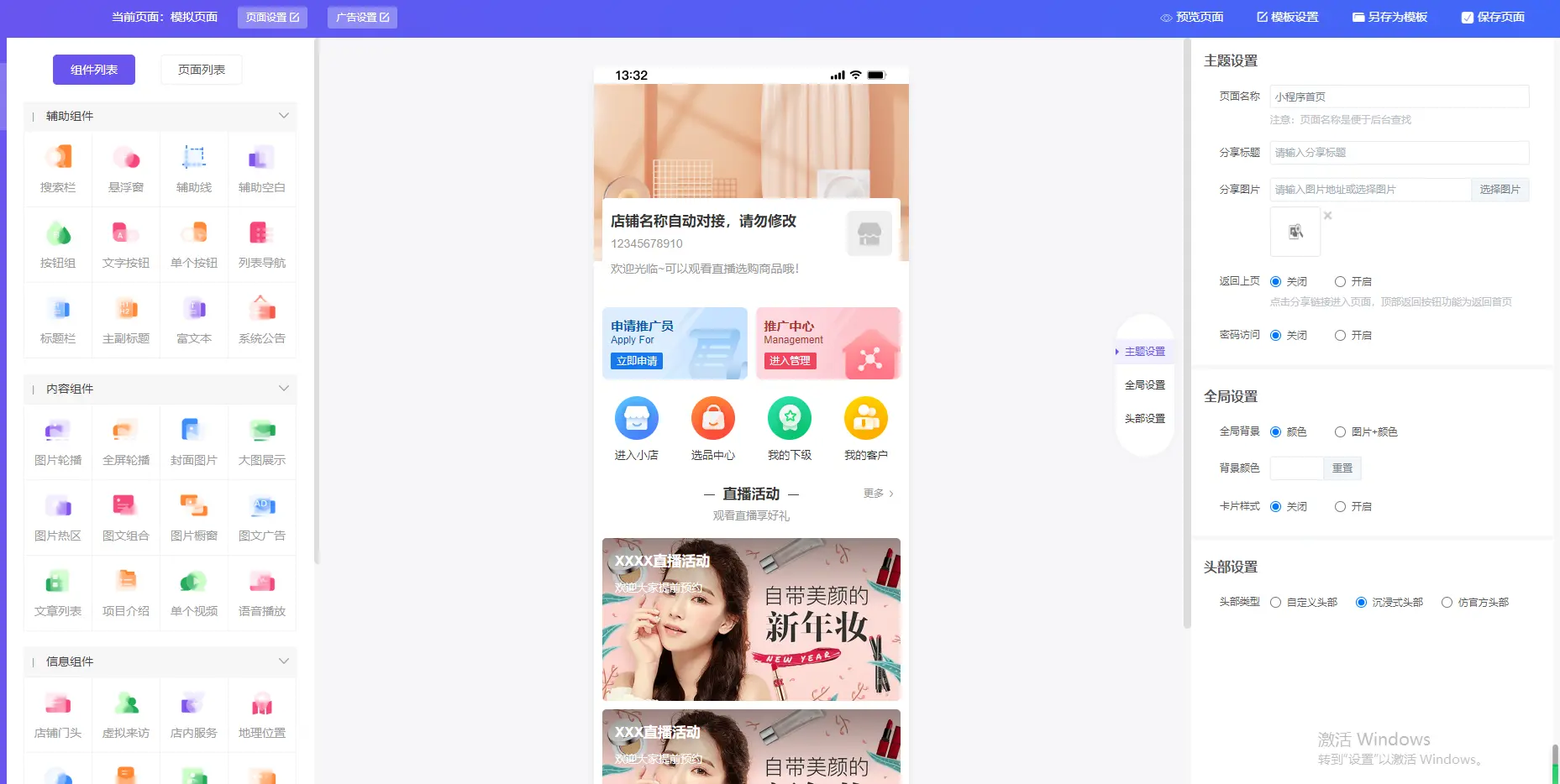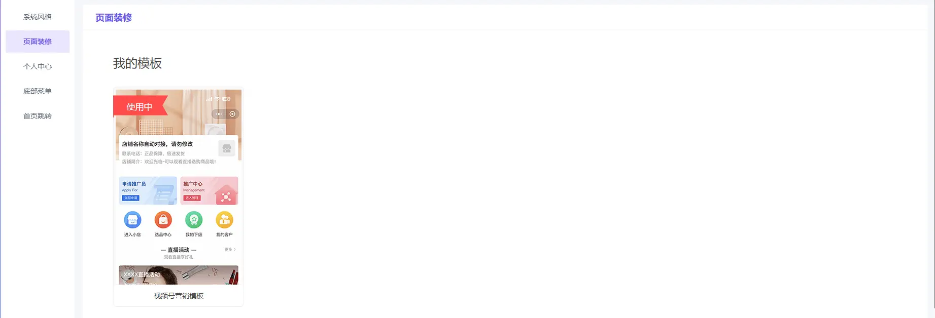 ### DIY布局页面主要用于小程序页面创建,如果自己不会设计,建议套用系统模板,每个方案会启用方案默认自带模板  #### 编辑模版,进入DIY页面,自行从左侧组件列表中选择需要的木块进行DIY设计编辑模版,进入DIY页面,自行从左侧组件列表中选择需要的木块进行DIY设计   模块: 开屏广告、弹窗广告、背景音乐 图文展示:大图展示、图文广告、图片轮播、富文本、组图模块、图片橱窗、图文组、文章列表 根据不同样式需求选择适合的展示模块,例如图片轮播适合banner图;如需要单页滑动效果可选用图文组…… 标题:标题2、标题栏 题2样式多样有主副标题,满足样式需求;标题栏可添加跳转链接。 按钮:按钮组、文字按钮、单个按钮、选项卡 商品、插件:秒杀模块、多商户模块、多商户列表、产品模块、拼团模块 商品最好不要使用不对应的模块,比如多规格商品使用秒杀模块,可能导致显示错误。 布局:辅助线、辅助空白 营销:公告+营销模块+万能表单 公告可以读取文章,也可以手动填写; 优惠券、万能表单都是从系统—营销中的对应部分读取/选取内容; 订单轮播从订单列表读取内容; 短视频:一个DIY单页面里同时只能存在一个短视频模块,短视频模块无法与其他组件共存 两种样式,一种为瀑布流列表,一种为全屏短视频可上下滑动 …… 其他:网页容器(单个DIY页面仅能存在这一个模块)