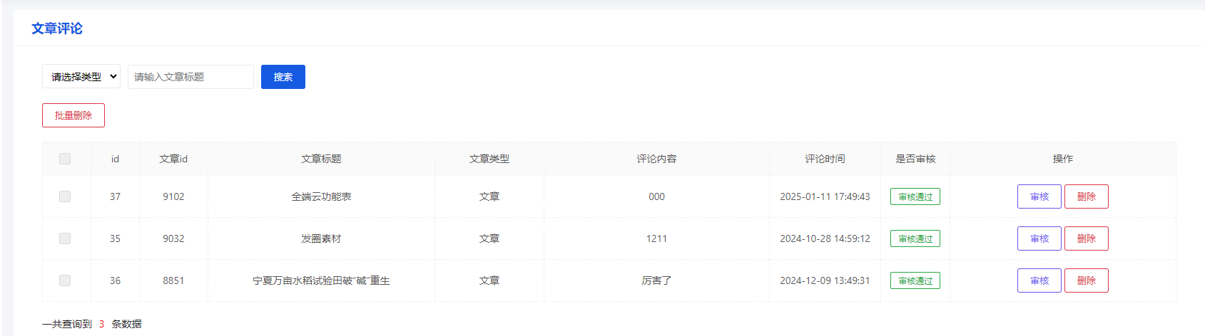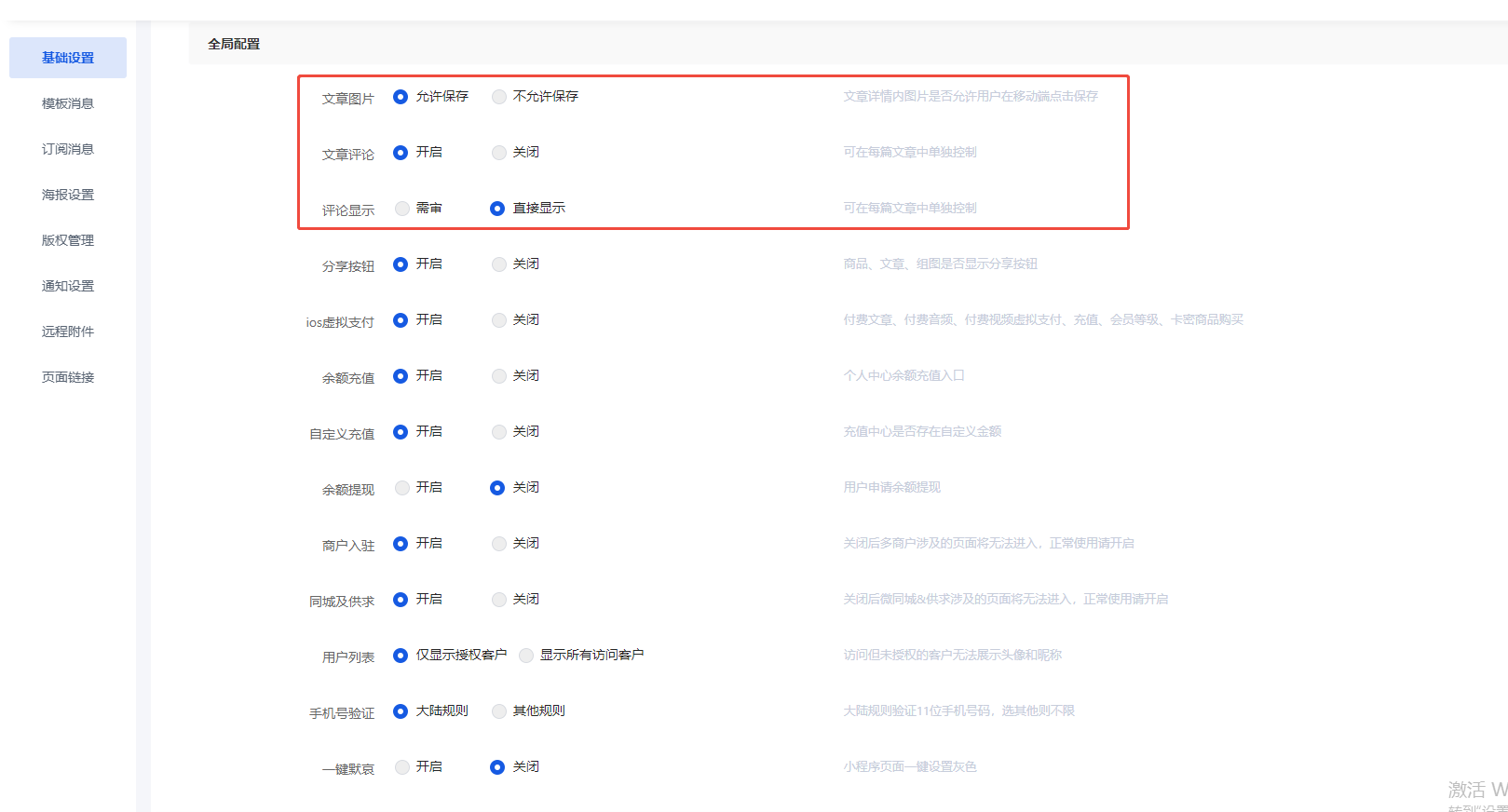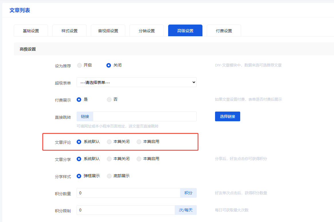 ### 文章评论全局设置 系统-基础设置-全局配置:文章评论+文章评论审核  ### 文章评论单独设置 内容——文章列表——高级设置——本篇文章评论 系统默认:使用全局设置 本篇关闭/本篇启用:本篇文章单独设置  ### 文章评论列表 当全局设置的"文章评论"和"文章评论审核"开启,文章支持评论,且评论需审核