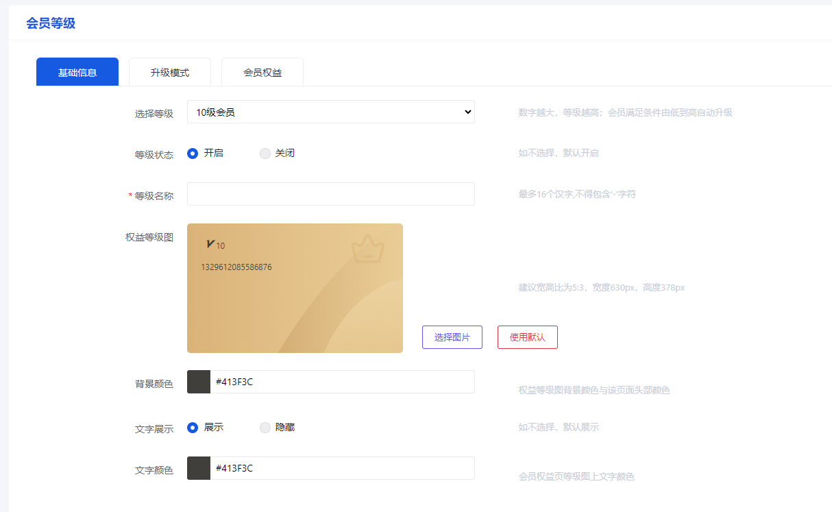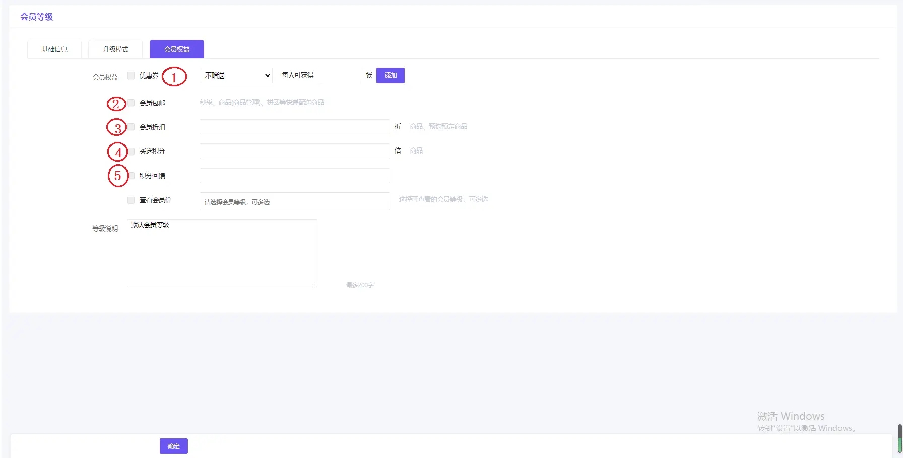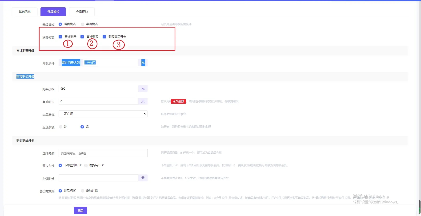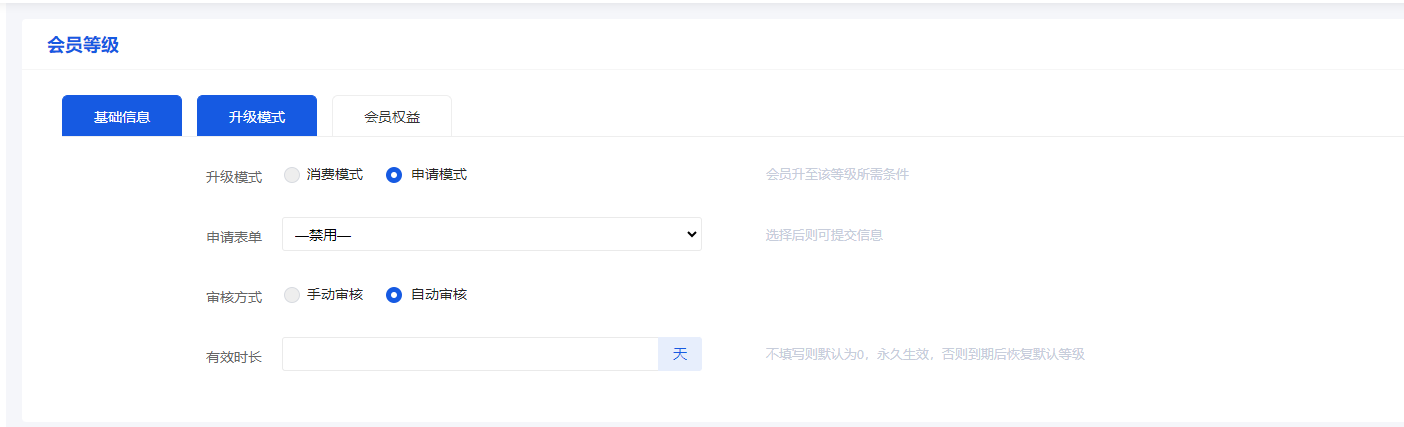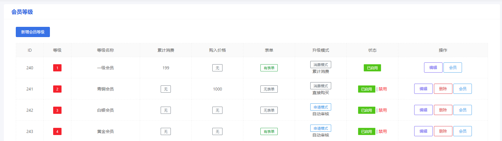 ### 【功能介绍】 会员等级支持“消费升级”和“申请升级”双线模式,共有“累计消费升级模式”、“直接购买模式”、“购买商品开卡模式”和“会员申请模式”4种升级方式;  ### 新增会员 #### 基础信息  #### 升级模式 (1)消费模式 ①累计消费:达到设定金额自动升级(等级消费递增,高等级不能低于低等级) ②直接购买:用户直接购买等级所需金额 ③购买商品开卡:购买指定商品(单个或多个)成为会员,用户购买指定商品之一后成为对应会员等级,会员等级页面点击购买指定商品将会跳转对应商品列表选择购买,若在商城中直接购买指定商品也可成为对应会员  (2)申请模式 ①审核:后台审核达到对应等级 ②表单:填写表单,后台免审达到对应等级 可以使用系统默认表单或者自定义表单(应用—通用表单中添加的表单); 可以设置信息收集表单,会员点击立即购买/立即开通跳转填写表单进行信息采集,在累消升级的情况下不生效  ### 【会员权益】 ①优惠券 从优惠券列表中选择,限制每人获取数量;达到相应等级是进入个人中心,弹窗提示自动领取; 注:仅支持设置为“系统发放”的优惠券; ②会员包邮 高于满减包邮和其他包邮设置; ③会员折扣 预约预定商品和多规格商品生效;会员等级页面的会员折扣为默认设置;单独商品设置可在商品页单独进行设置; ④买送积分 买送积分商品,会员可根据设置获取相应倍数积分 ⑤积分回馈 达到该等级进入个人中心自动赠送