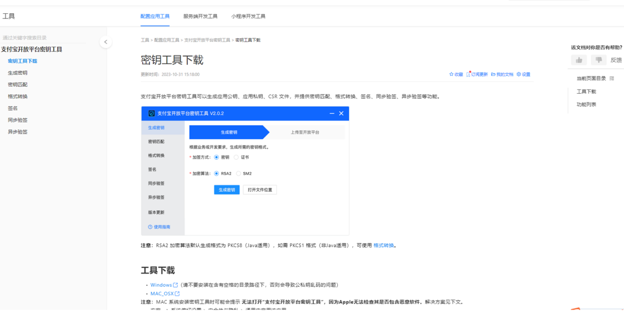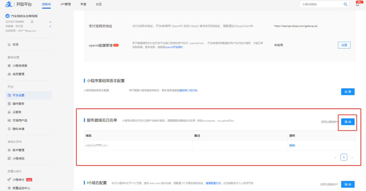 ### 支付宝小程序支付配置 1. 下载支付宝密钥工具链接地址:<https://opendocs.alipay.com/isv/02kipk>  2. 登录支付宝开发平台链接地址: <https://opendocs.alipay.com/mini/introduce/register> 添加服务器白名单  3. 开通JSAPI支付链接:<https://opendocs.alipay.com/mini/05x9kt?pathHash=f7f56742>   并且需要关联小程序  4. 开发设置获取密钥和证书   JSAPI 支付是指商家在支付宝APP中,通过调用支付宝提供的JSAPI接口,调起支付宝收银台完成收款的一款支付产品。 **注意:** 1. 目前开放的支付场景为小程序,指用户在商家的支付宝小程序里,可通过下单购买的方式完成付款。 2. 支付宝小程序内不能通过拉起 H5 页面做 JSAPI 支付。  ### 申请条件 1. 支持的账号类型:经过认证的支付宝个人账号或支付宝企业账号。 2. 开通申请提交资料: (1)目前支持小程序交易场景,需填写已创建的小程序 APPID。 (2)若以支付宝个人账号申请,可需提供您的营业执照,若审核通过可获取更高收款额度。 注意:若您产品开通时提交的小程序APPID未上架,开通完成后您的收款额度将受到限制(单笔收款 ≤ 2000元,单日收款 ≤ 20000元)。请在合约生效后的30天内完成上架,否则会影响正常收款。