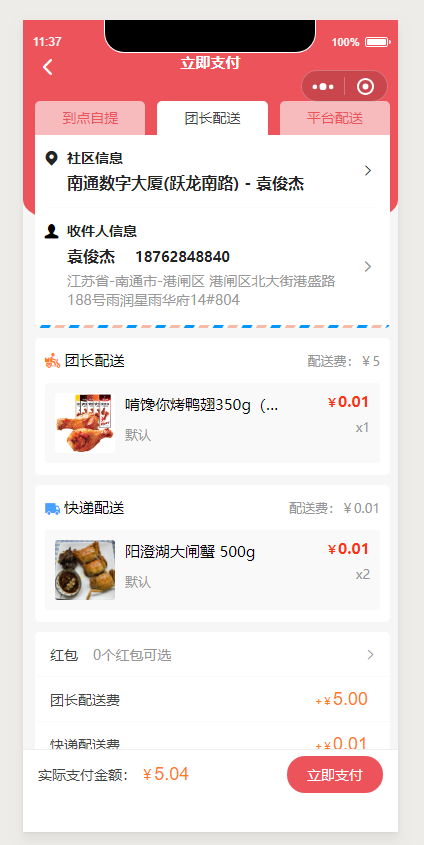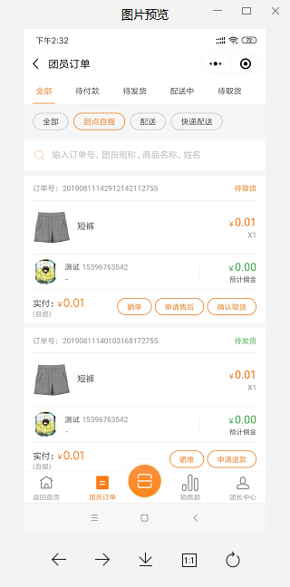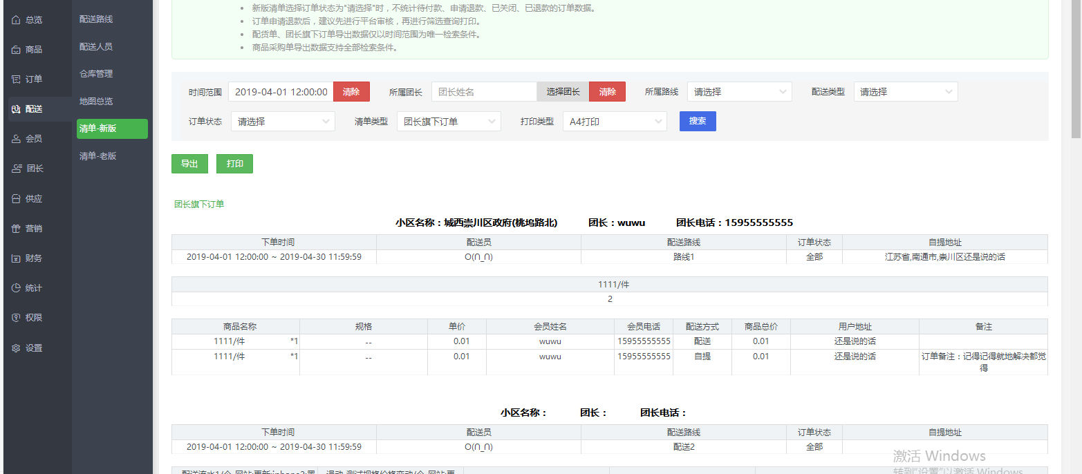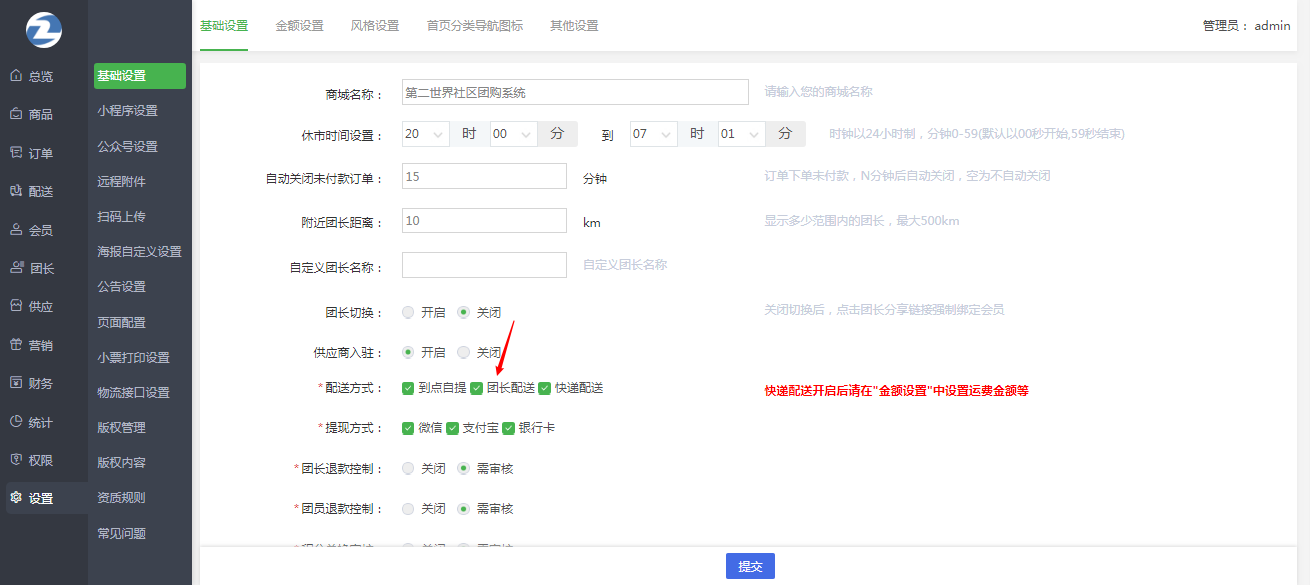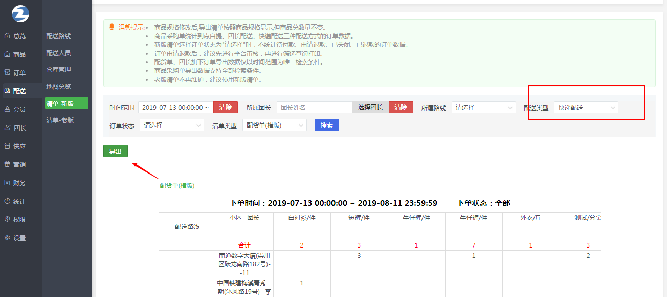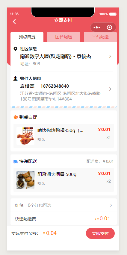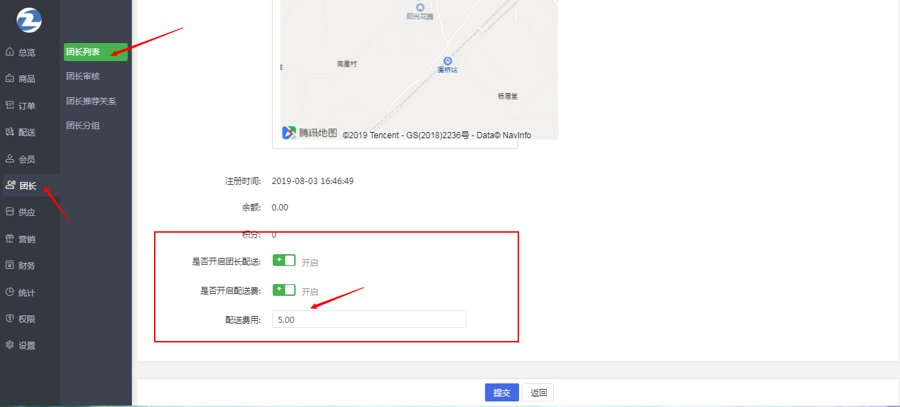 ## 1、自提 #### 设置-基础设置:开启自提  #### 选择自提进行购买  #### 自提方式,消费者到团长自提点取货(无需团长配送费!) ## 2、团长配送 #### 设置-基础设置:开启团长配送(团长配送需要额外的团长配送费,配送费是付给团长的,完成订单算团长的佣金,可提现!)  #### 选择团长配送进行购买  #### 设置团长配送费(默认都是5元)  ## 3、团长配送流程 #### 平台一件发货后,团长收货、确认收货  #### 确认收货  #### 发送通知,通知团员取货(需要开启队列)  #### 查看到点自提订单  #### 查看团长配送订单  #### 确认团员收货  #### 扫码核销  #### 消费者出示提货二维码  #### 如果团长中心的二维码不能取货,可以使用微信自带的三一扫 ## 4、配送 #### 添加人员  #### 添加仓库  #### 添加配送路线  #### 地图总览  ## 5、清单 #### 选择筛选条件(三种类型清单-配货单、团长旗下订单、商品采购单)  #### 打印订单  #### 配货单:团长的配货详情 #### 商品采购单:采购商品 #### 团长旗下订单:给团长配送用的清单 #### 快递订单导出