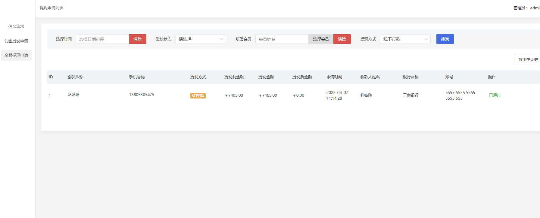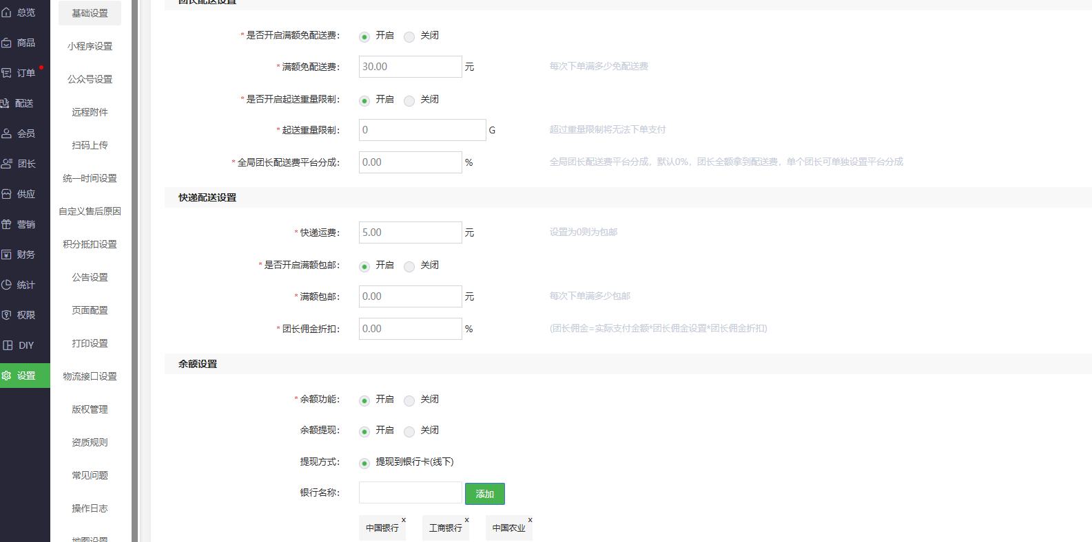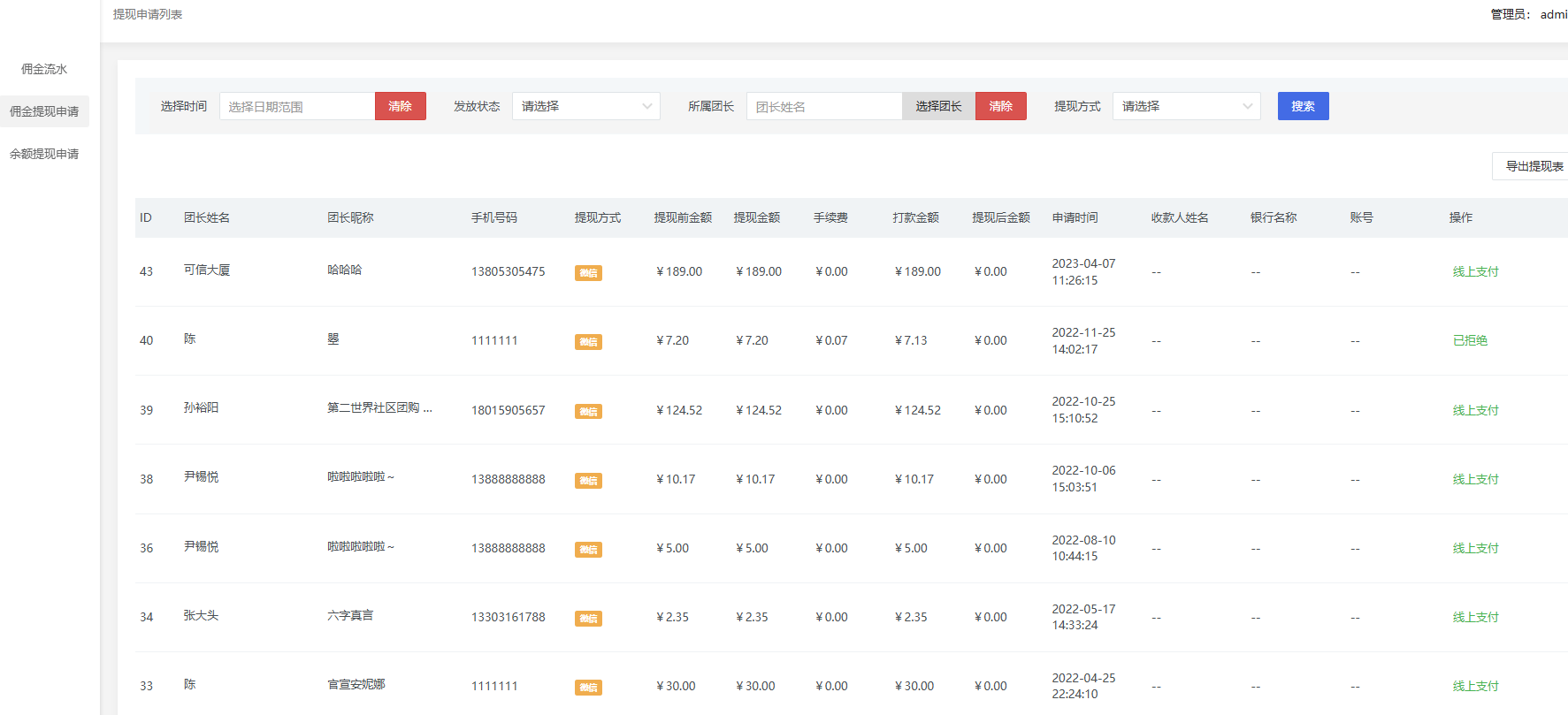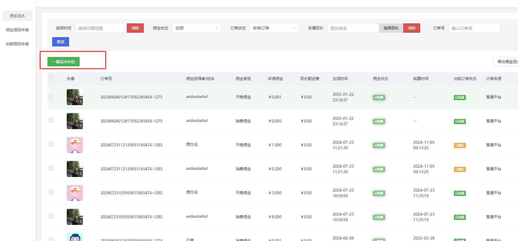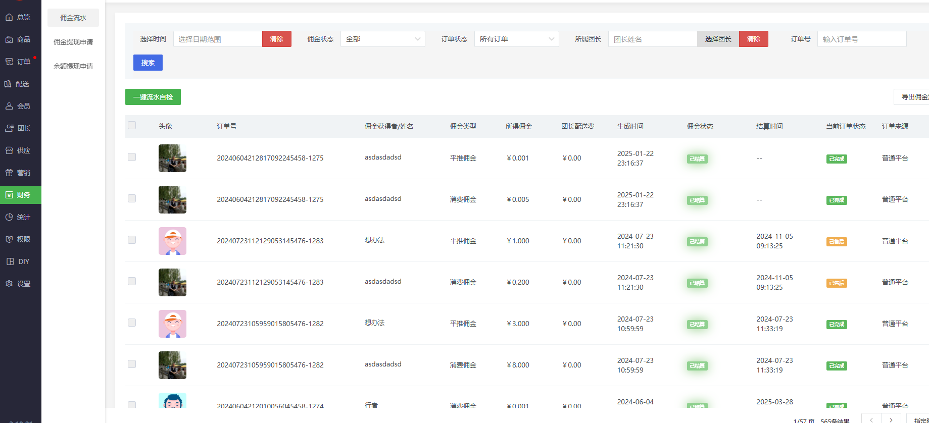 ## 1、佣金流水 通过时间、佣金状态、订单状态、订单号或者团长检索到对应的流水信息。  #### 注:佣金结算可提现条件,需要满足两点,1、订单完成,2、超过订单申请售后限制天数。如果条件满足,订单还是未结算可以通过点击一键流水自检来结算订单状态。  ## 2、佣金提现申请列表 #### 团长通过小程序端团长中心向平台发起提现申请,后台审核。  ## 3、余额提现  ##### 功能开关对应设置-金额设置-余额设置。