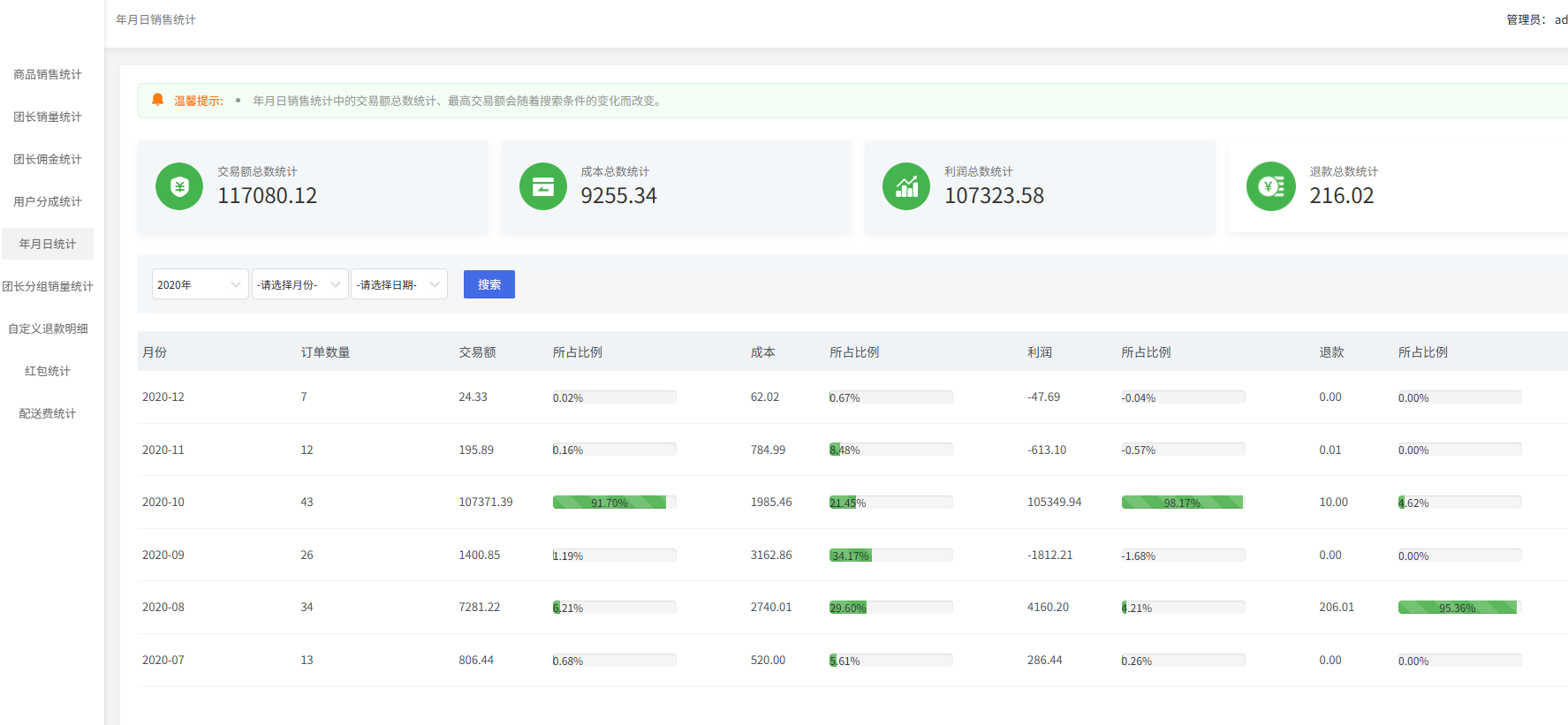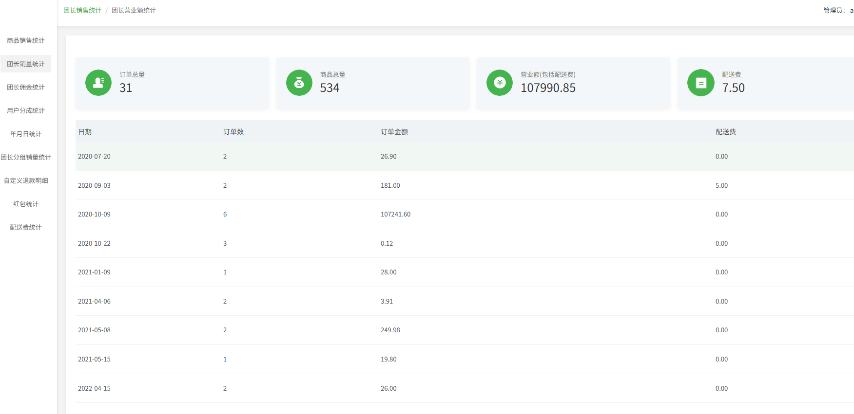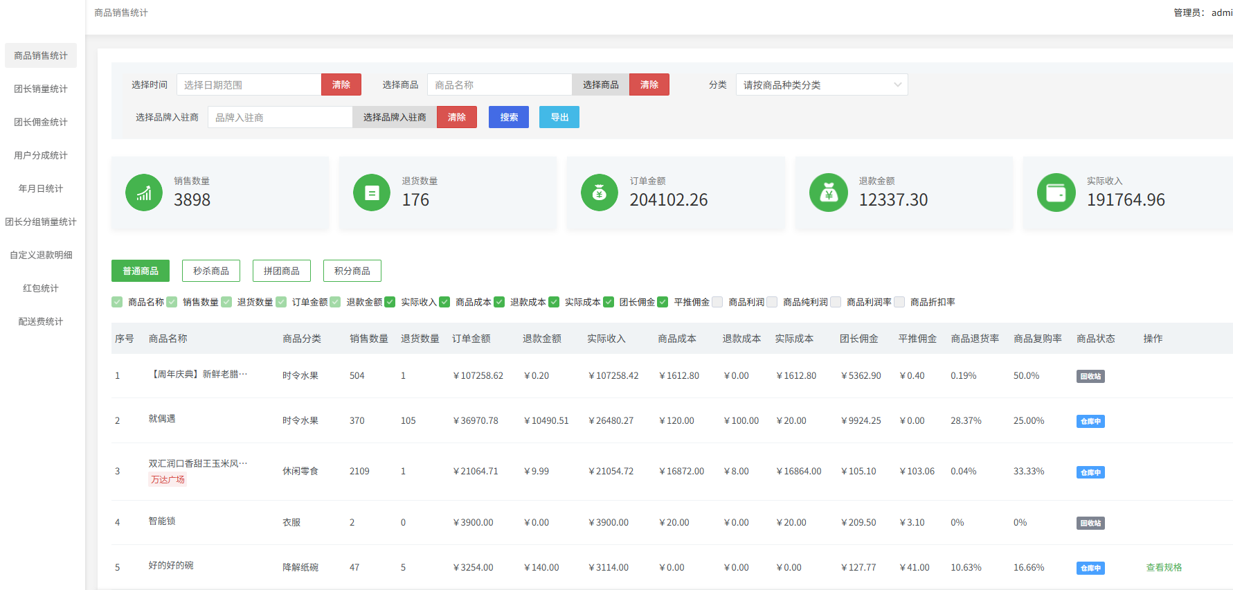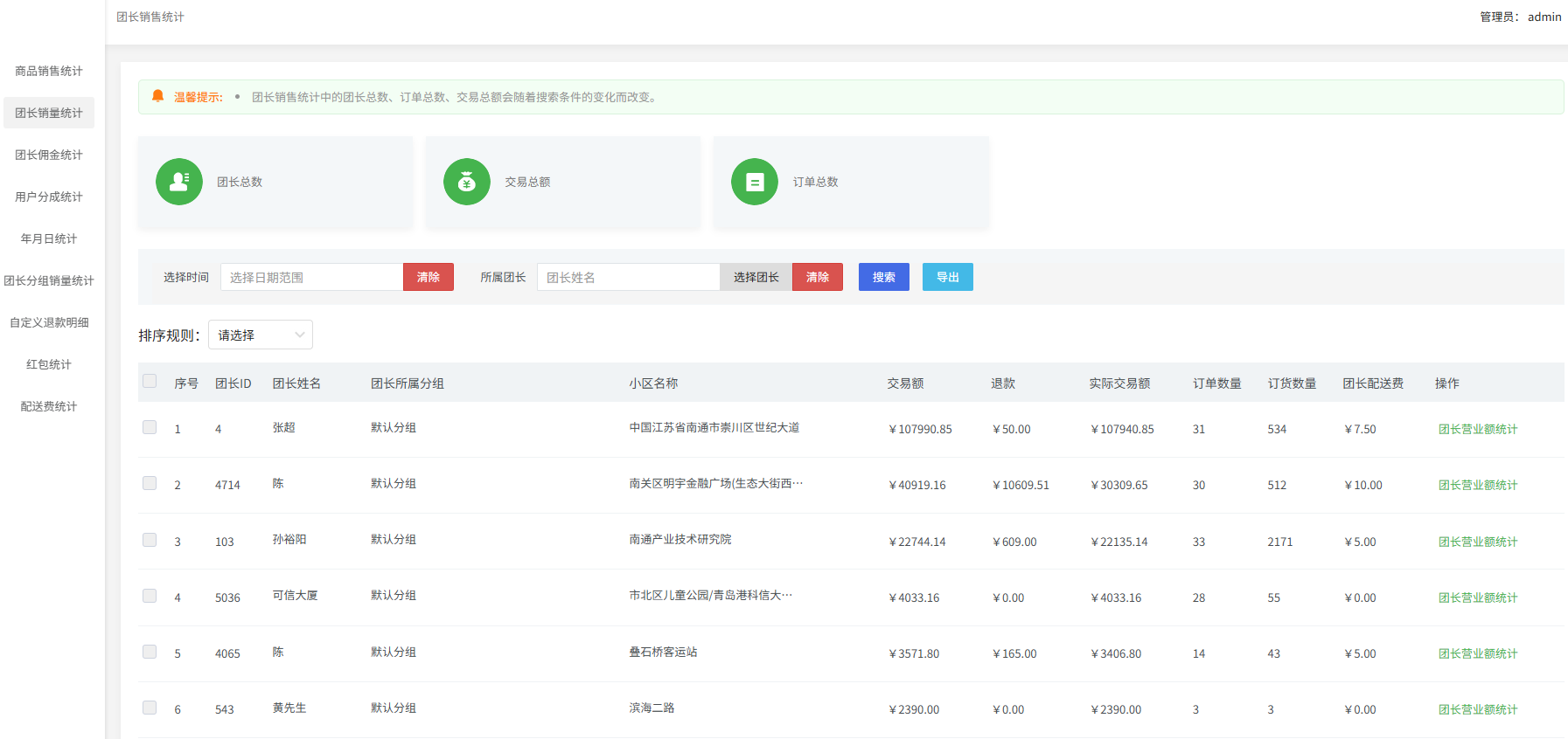## 商品销量统计功能 #### - 商品销量统计分普通商品、秒杀商品、拼团商品、积分商品的统计 #### - 小程序端下单支付成功之后,系统就会根据下单选择的商品进行数量、金额的统计 #### - 统计内容:商品名称、商品分类、销售数量、退货数量、订单金额、退款金额、实际收入、实际收入、商品成本、退款成本、实际成本、商品利润、商品纯利润、商品利润率 #### - 如果是多规格的商品,会显示多规格的按钮,点击多规格进入根据不同的规格进行的商品销量统计    ## 团长销量统计功能 #### - 系统根据订单支付信息,再根据各个订单绑定的团长信息,进行分析统计。 #### - 统计内容:团长ID、团长姓名、团长所属分组、小区名称、交易额、退款、实际交易额、订单数量、订货数量、团长配送 #### - 点击团长营业额统计会统计各个时间的订单数量、订单金额、配送费等信息   ## 团长佣金统计 #### - 可以看到具体时间段的团长佣金数据  ## 用户数据统计 #### - 用户分成统计中的用户数量、总消费余额、总分成金额会随着搜索条件的变化而改变。  ## 年月日统计功能 - 可以根据年/月/日进行分时段的统计,统计内容:订单数量、交易额、成本、利润、退款等信息  ## 团长分组订单金额统计  ## 自定义退款明细 #### - 自定义退款明细只统计售后工单已经同意且存在退款误差的数据,申请中和已拒绝的售后工单不进行统计  ## 红包统计  ## 团长配送费统计 #### - 配送费统计中的交易额总数统计、最高交易额会随着搜索条件的变化而改变