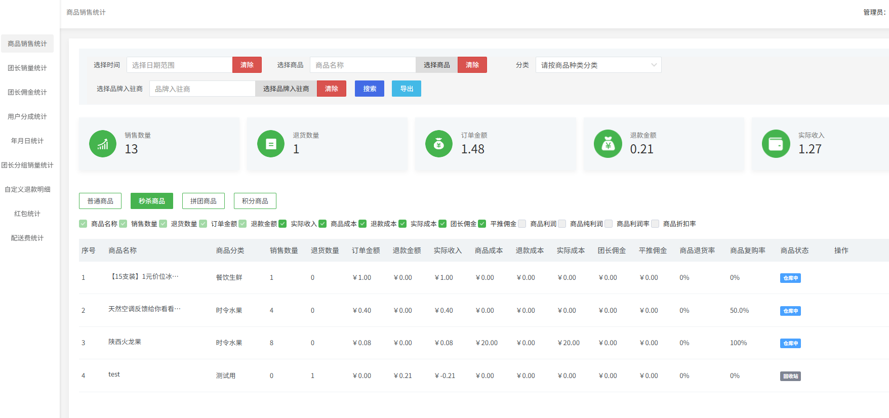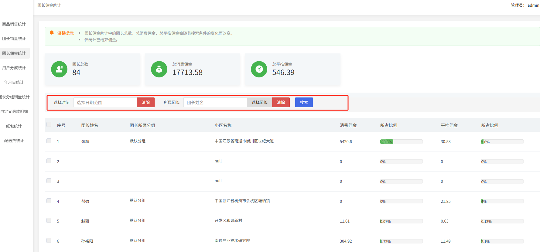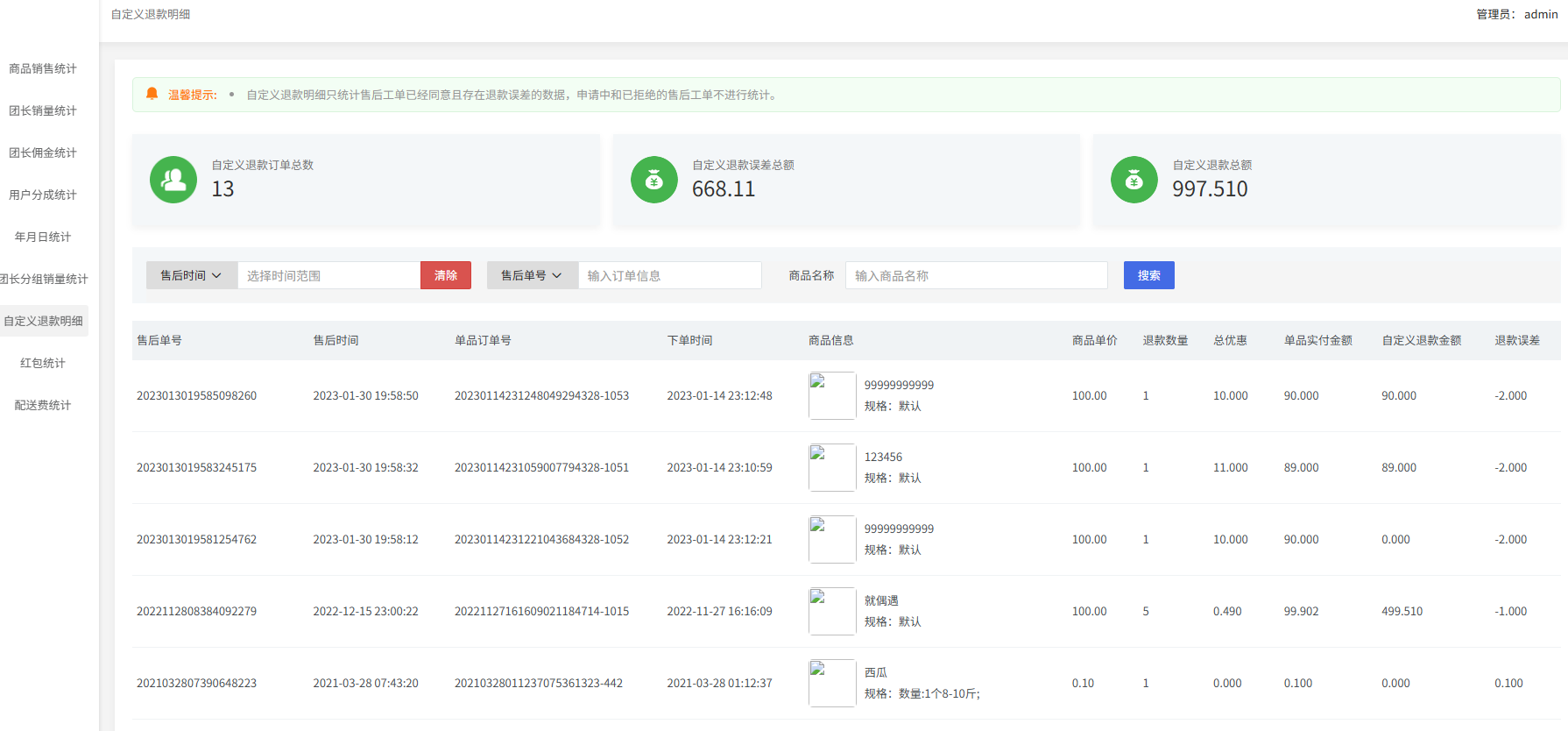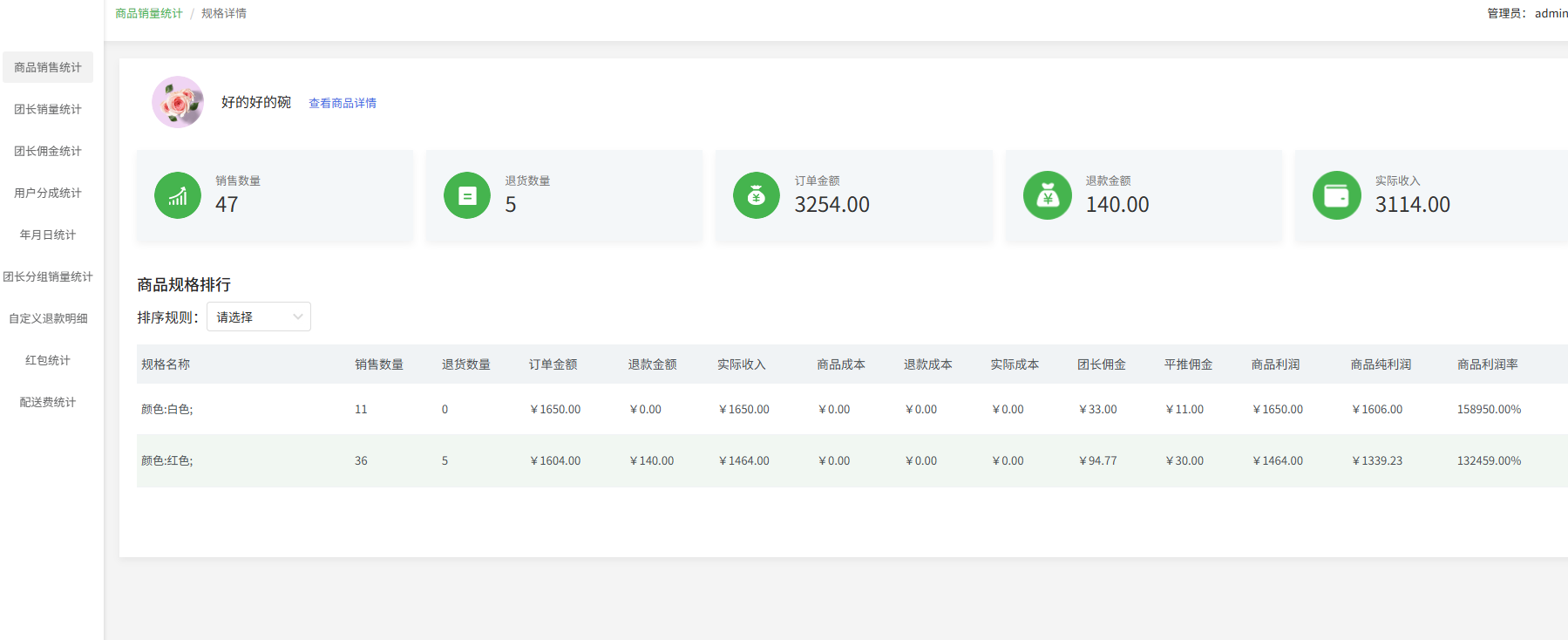 ## 商品销量统计功能 #### - 商品销量统计分普通商品、秒杀商品、拼团商品、积分商品的统计 #### - 小程序端下单支付成功之后,系统就会根据下单选择的商品进行数量、金额的统计 #### - 统计内容:商品名称、商品分类、销售数量、退货数量、订单金额、退款金额、实际收入、实际收入、商品成本、退款成本、实际成本、商品利润、商品纯利润、商品利润率 #### - 如果是多规格的商品,会显示多规格的按钮,点击多规格进入根据不同的规格进行的商品销量统计    ## 团长销量统计功能 #### - 系统根据订单支付信息,再根据各个订单绑定的团长信息,进行分析统计。 #### - 统计内容:团长ID、团长姓名、团长所属分组、小区名称、交易额、退款、实际交易额、订单数量、订货数量、团长配送 #### - 点击团长营业额统计会统计各个时间的订单数量、订单金额、配送费等信息   ## 团长佣金统计 #### - 可以看到具体时间段的团长佣金数据  ## 用户数据统计 #### - 用户分成统计中的用户数量、总消费余额、总分成金额会随着搜索条件的变化而改变。  ## 年月日统计功能 - 可以根据年/月/日进行分时段的统计,统计内容:订单数量、交易额、成本、利润、退款等信息  ## 团长分组订单金额统计  ## 自定义退款明细 #### - 自定义退款明细只统计售后工单已经同意且存在退款误差的数据,申请中和已拒绝的售后工单不进行统计  ## 红包统计  ## 团长配送费统计 #### - 配送费统计中的交易额总数统计、最高交易额会随着搜索条件的变化而改变