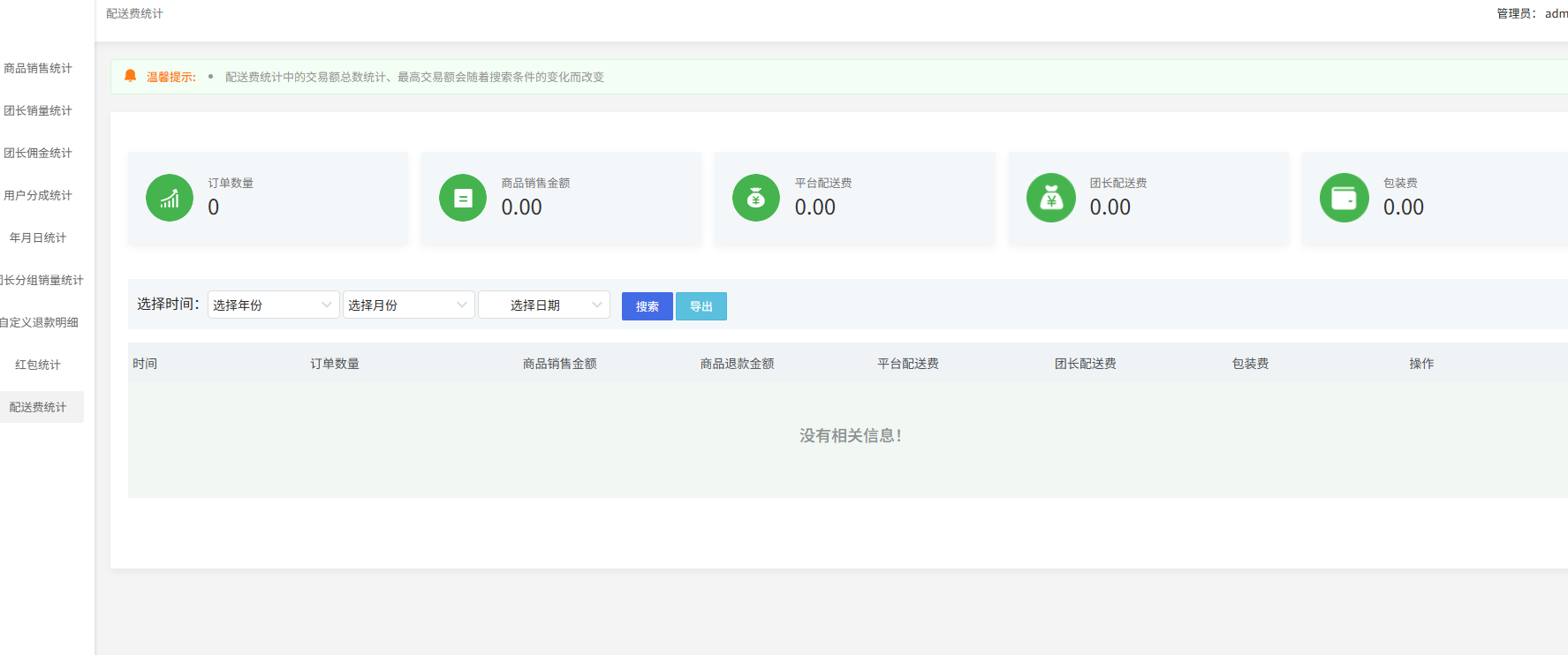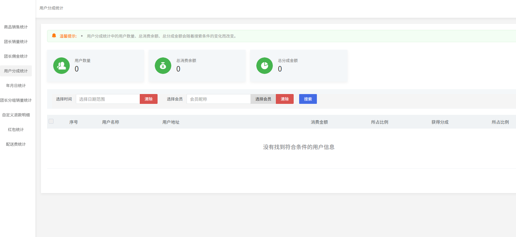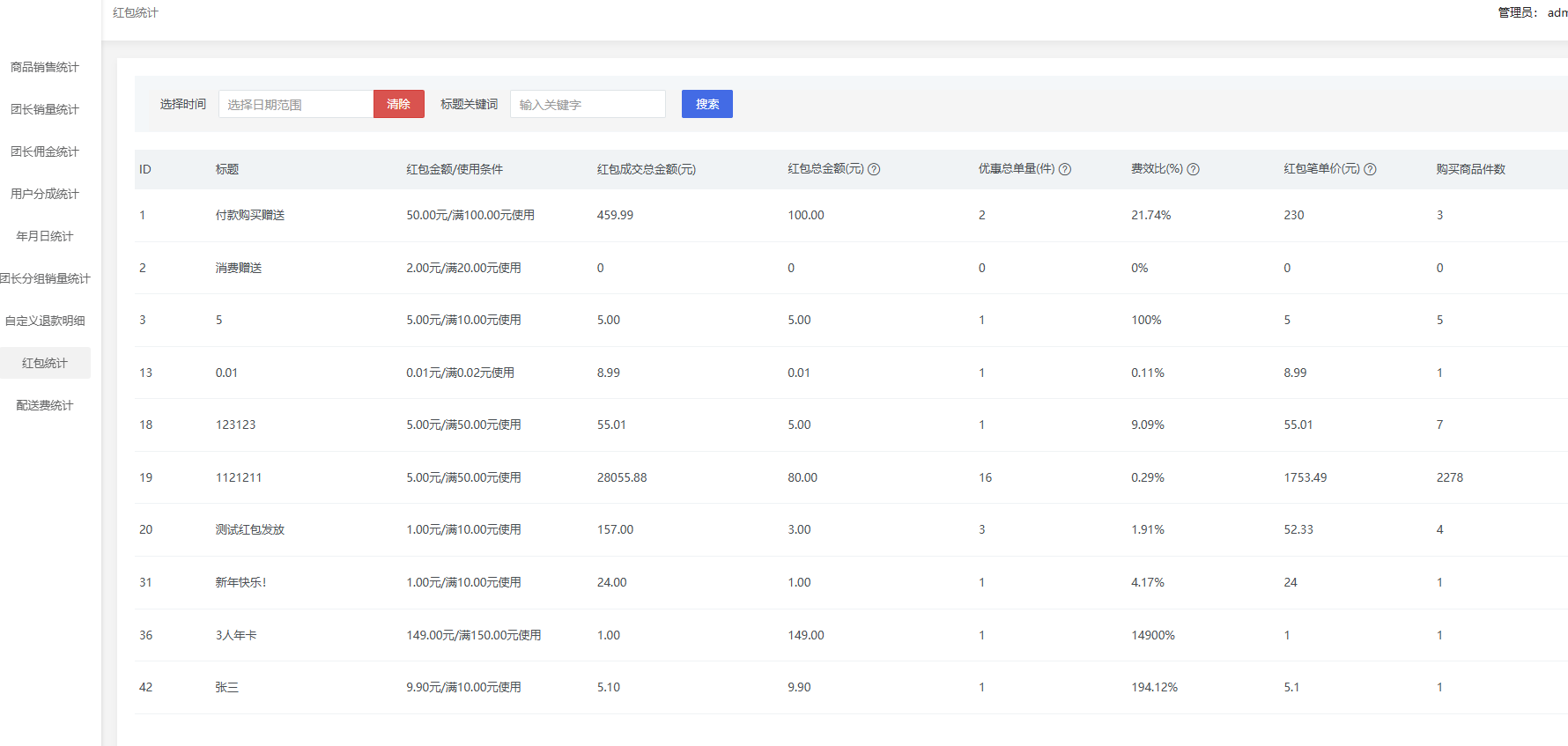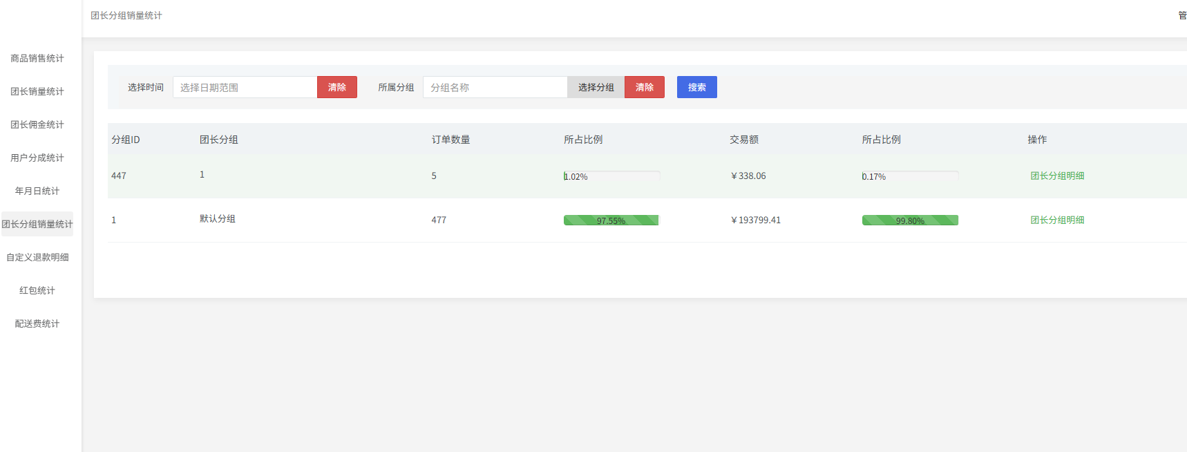 ## 商品销量统计功能 #### - 商品销量统计分普通商品、秒杀商品、拼团商品、积分商品的统计 #### - 小程序端下单支付成功之后,系统就会根据下单选择的商品进行数量、金额的统计 #### - 统计内容:商品名称、商品分类、销售数量、退货数量、订单金额、退款金额、实际收入、实际收入、商品成本、退款成本、实际成本、商品利润、商品纯利润、商品利润率 #### - 如果是多规格的商品,会显示多规格的按钮,点击多规格进入根据不同的规格进行的商品销量统计    ## 团长销量统计功能 #### - 系统根据订单支付信息,再根据各个订单绑定的团长信息,进行分析统计。 #### - 统计内容:团长ID、团长姓名、团长所属分组、小区名称、交易额、退款、实际交易额、订单数量、订货数量、团长配送 #### - 点击团长营业额统计会统计各个时间的订单数量、订单金额、配送费等信息   ## 团长佣金统计 #### - 可以看到具体时间段的团长佣金数据  ## 用户数据统计 #### - 用户分成统计中的用户数量、总消费余额、总分成金额会随着搜索条件的变化而改变。  ## 年月日统计功能 - 可以根据年/月/日进行分时段的统计,统计内容:订单数量、交易额、成本、利润、退款等信息  ## 团长分组订单金额统计  ## 自定义退款明细 #### - 自定义退款明细只统计售后工单已经同意且存在退款误差的数据,申请中和已拒绝的售后工单不进行统计  ## 红包统计  ## 团长配送费统计 #### - 配送费统计中的交易额总数统计、最高交易额会随着搜索条件的变化而改变