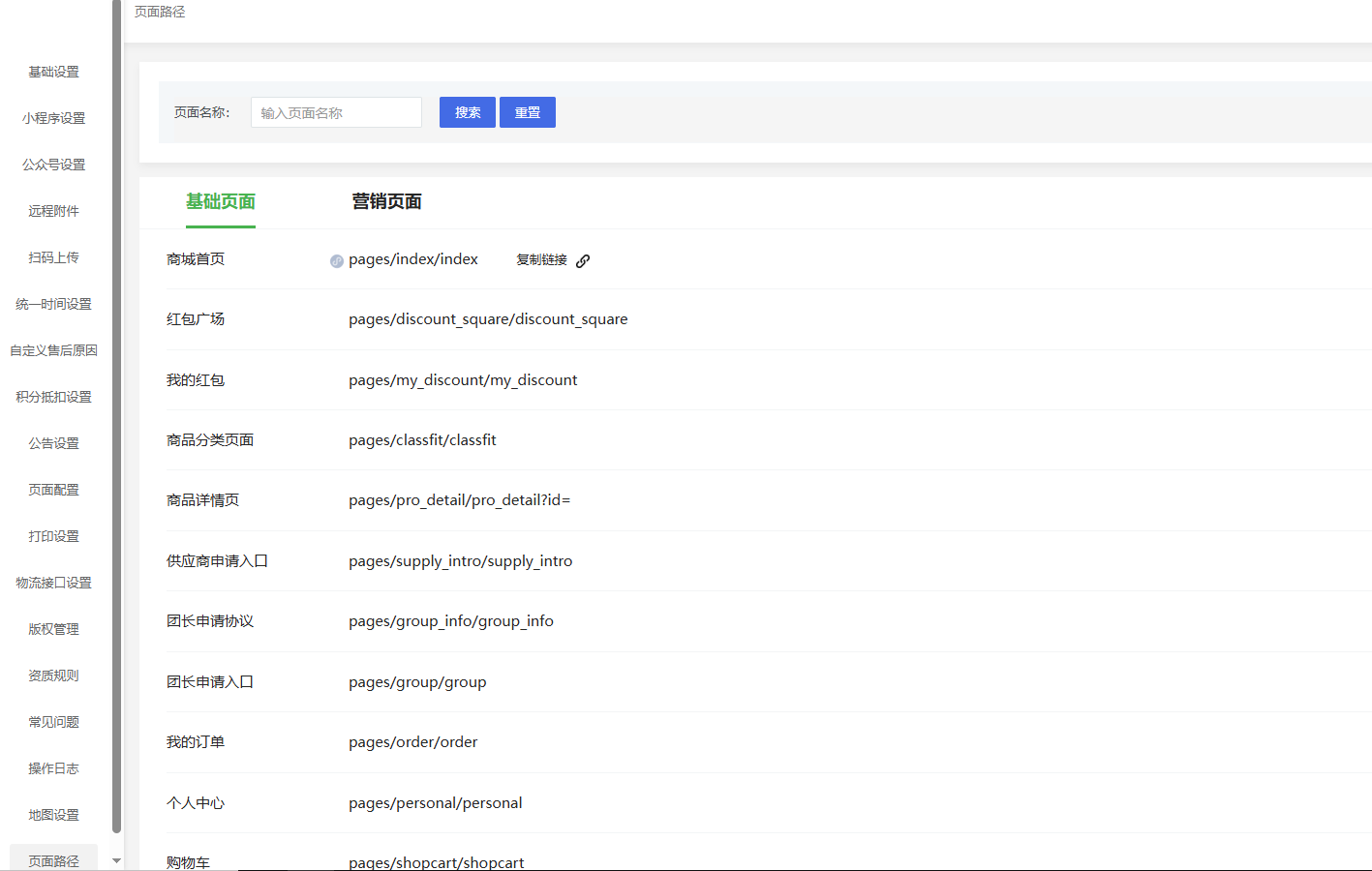 ### 页面路径  #### 小程序各个页面路径地址,如需自定义页面路径,不用链接选择器里面提供能功能跳转页,可以复制需跳转页的页面地址。