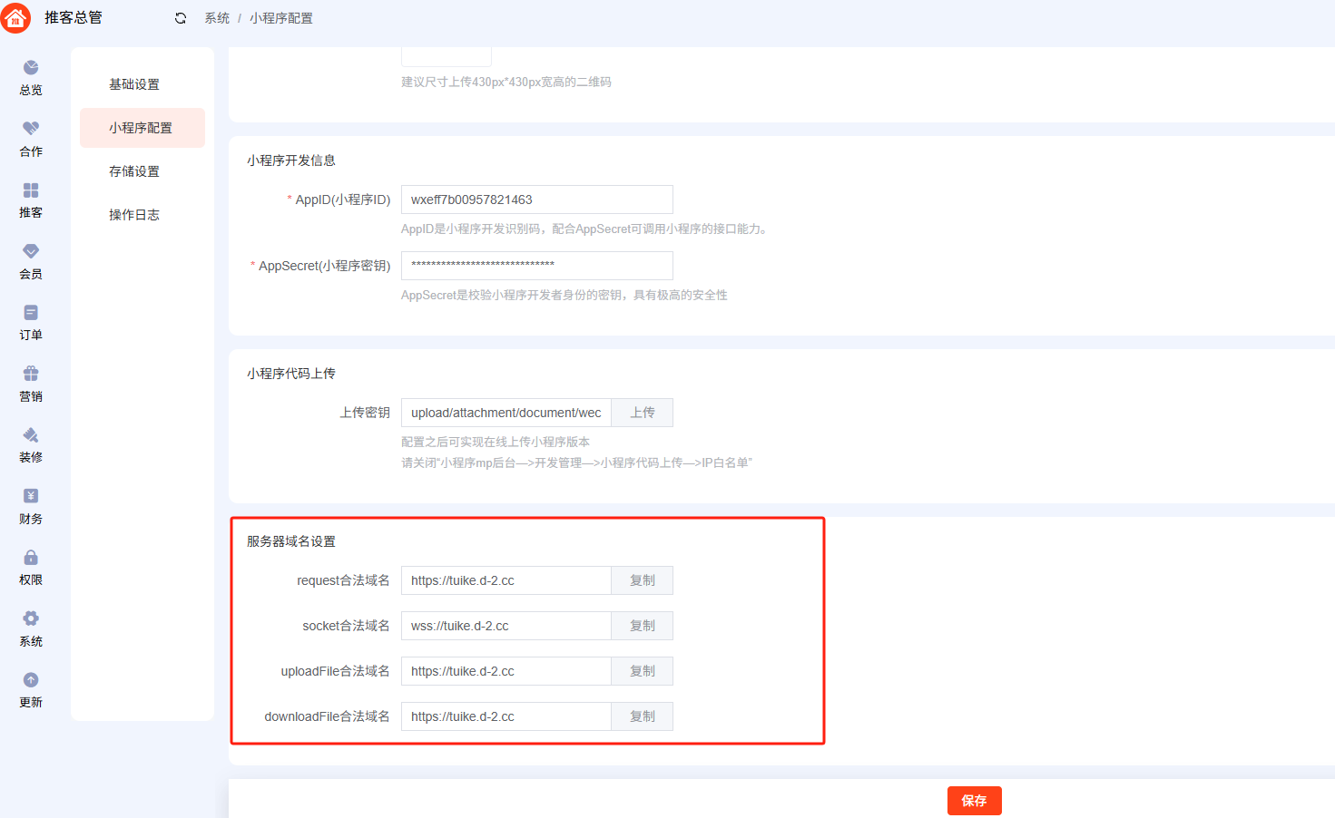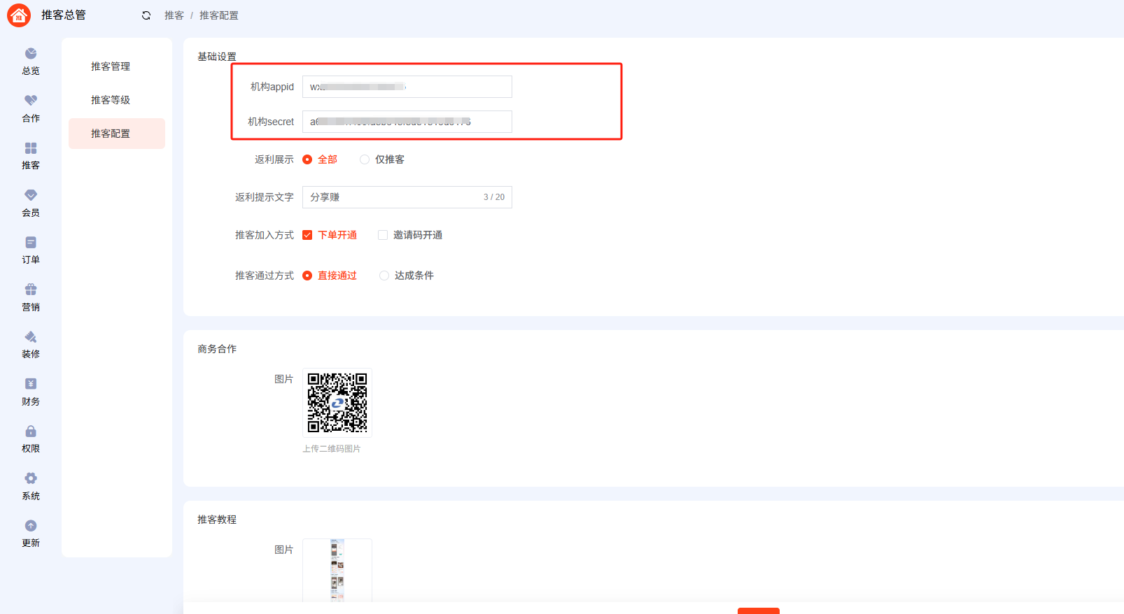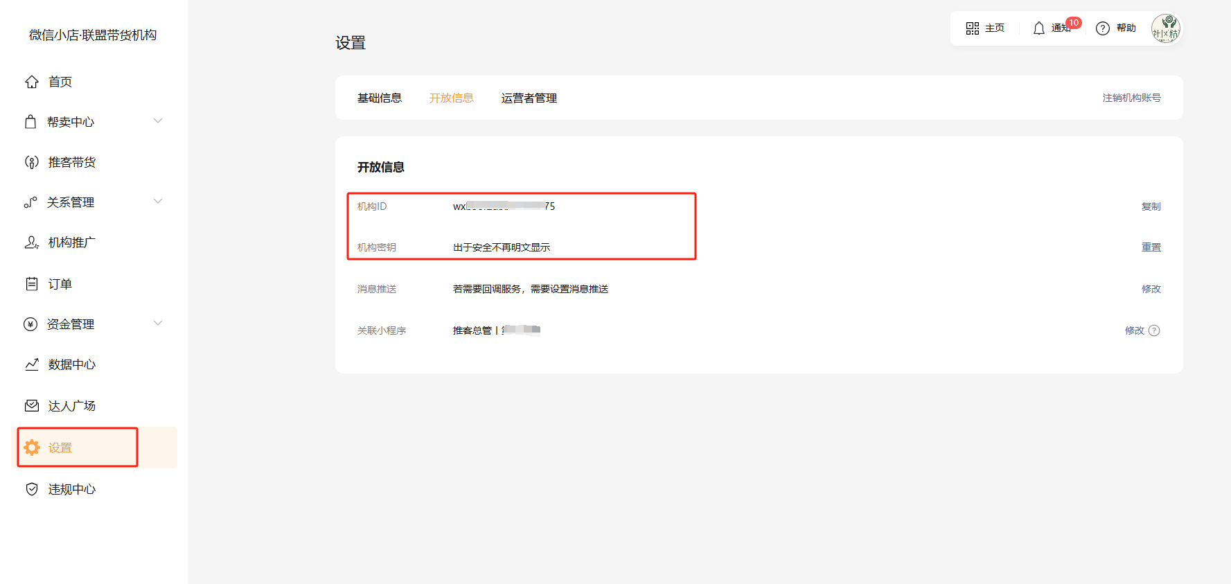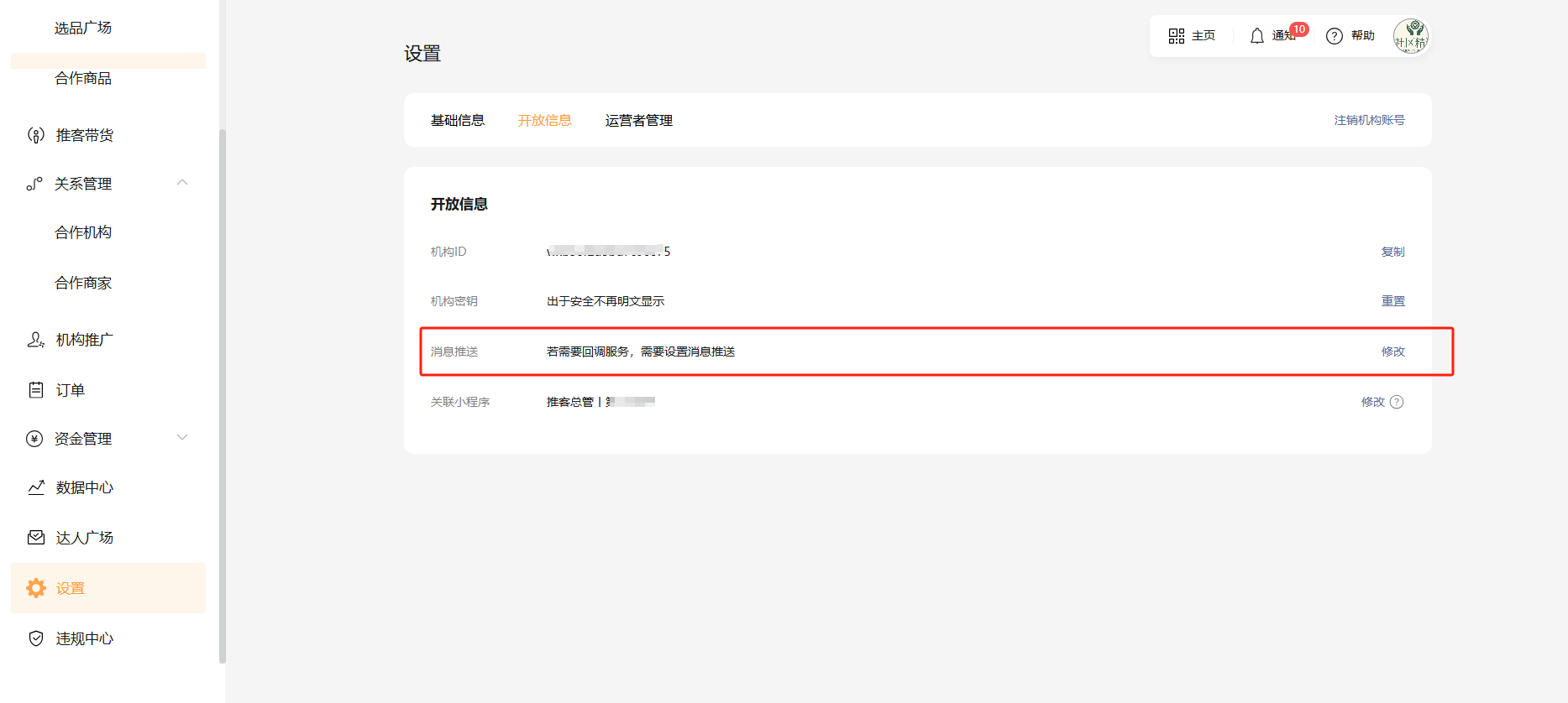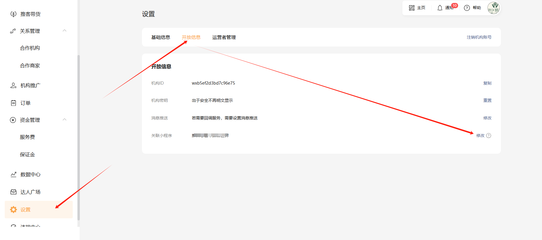 ## 推客对接配置 #### 联盟带货机构申请链接:https://channels.weixin.qq.com/ec-mcn/auth/login  #### 获取机构appid和机构secret   ### 设置消息推送  #### 回调地址:https://你的授权域名/adminapi/tuike/order/sync/100000 #### Token令牌test #### 消息密钥随机生成  ### 保证金交纳  ### 小程序配置 #### 1、appid和密钥 #### ==关于小程序的类目推荐:工具-效率 工具-办公类都可以不要选择商家自营==  #### 扫码登录小程序公众号后台:https://mp.weixin.qq.com/    #### 小程序代码上传获取密钥文件  ### 2、服务器域名配置  #### 按系统后台填写  ### 关联小程序 #### 带货机构后台  ==注:如果按上述都已经配置,但是小程序体验版打开白屏报错:推客已关闭,查看推客带货。==