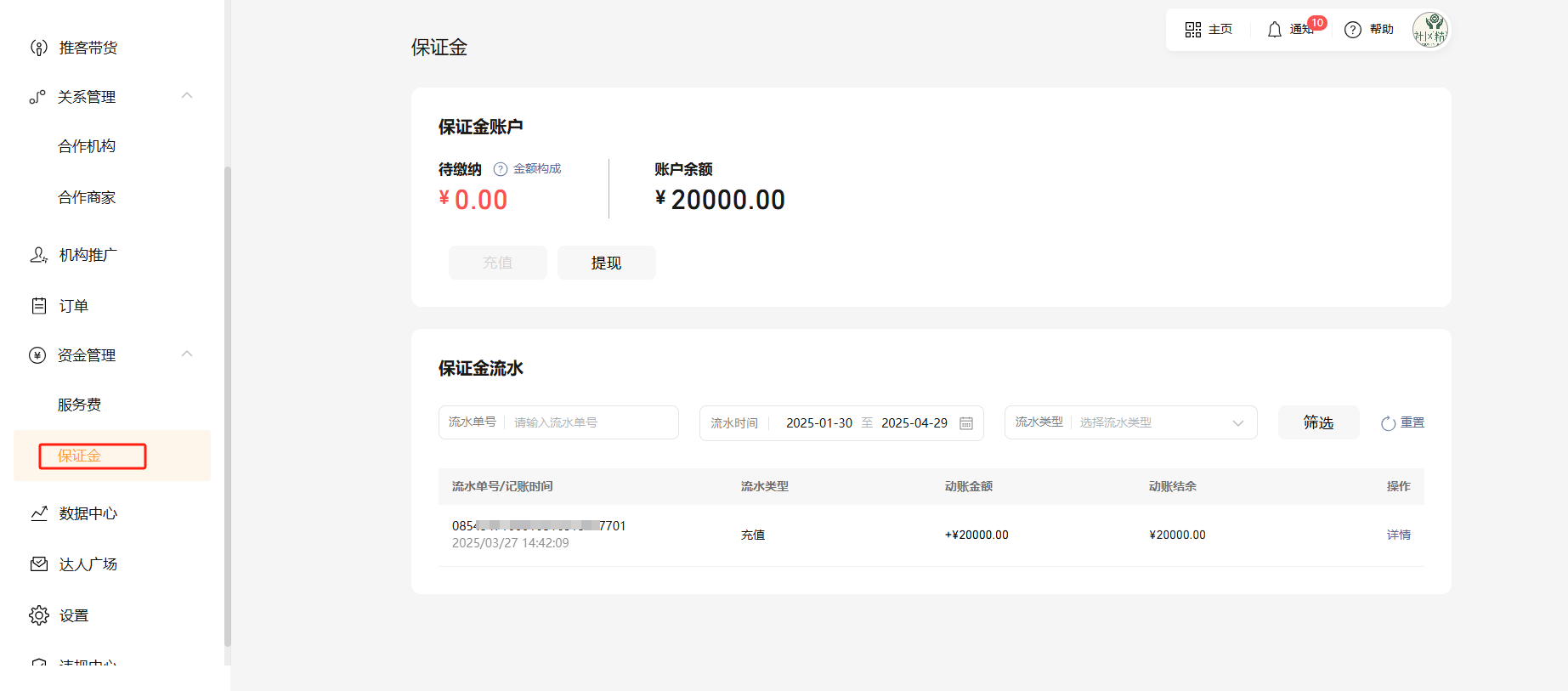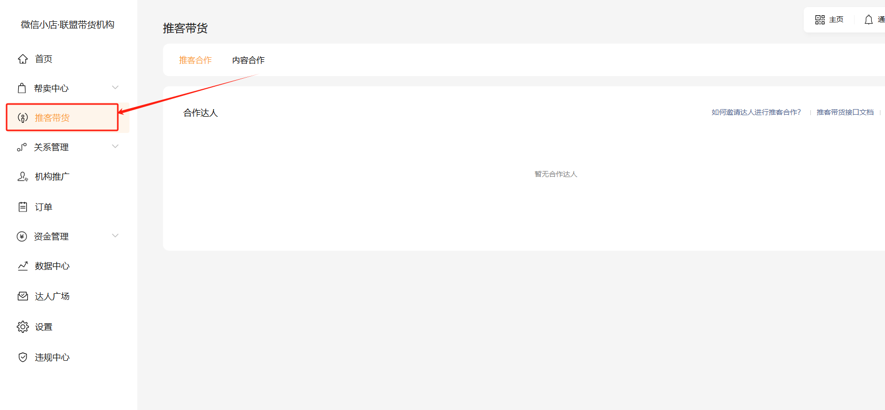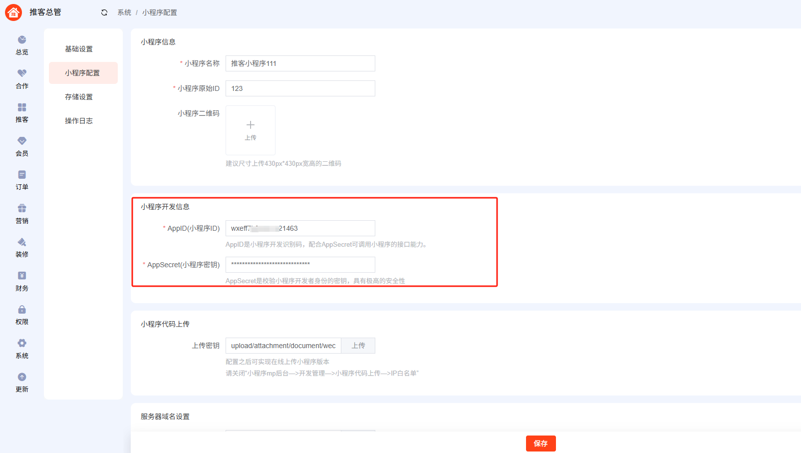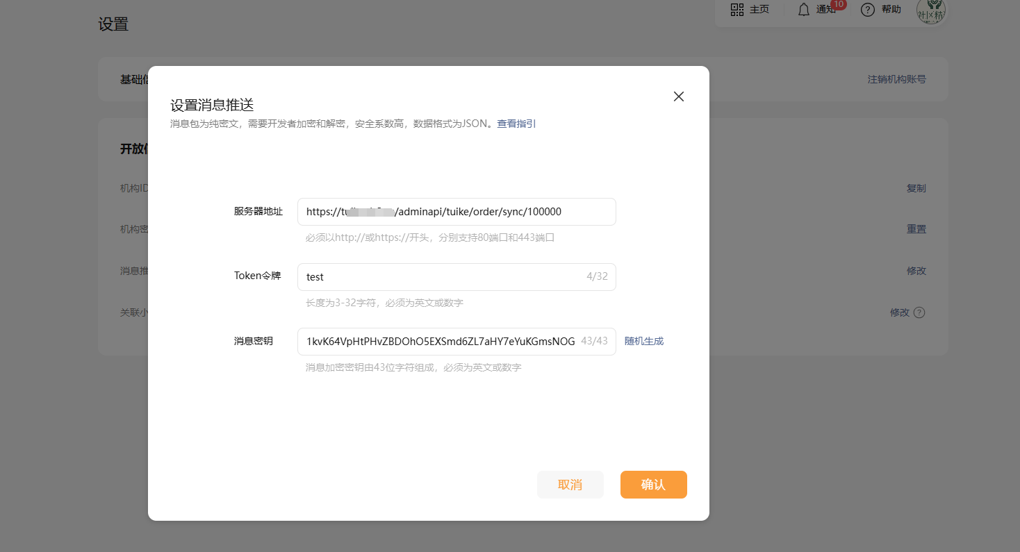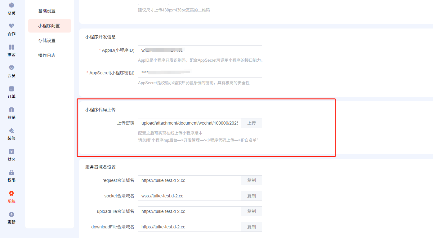 ## 推客对接配置 #### 联盟带货机构申请链接:https://channels.weixin.qq.com/ec-mcn/auth/login  #### 获取机构appid和机构secret   ### 设置消息推送  #### 回调地址:https://你的授权域名/adminapi/tuike/order/sync/100000 #### Token令牌test #### 消息密钥随机生成  ### 保证金交纳  ### 小程序配置 #### 1、appid和密钥 #### ==关于小程序的类目推荐:工具-效率 工具-办公类都可以不要选择商家自营==  #### 扫码登录小程序公众号后台:https://mp.weixin.qq.com/    #### 小程序代码上传获取密钥文件  ### 2、服务器域名配置  #### 按系统后台填写  ### 关联小程序 #### 带货机构后台  ==注:如果按上述都已经配置,但是小程序体验版打开白屏报错:推客已关闭,查看推客带货。==