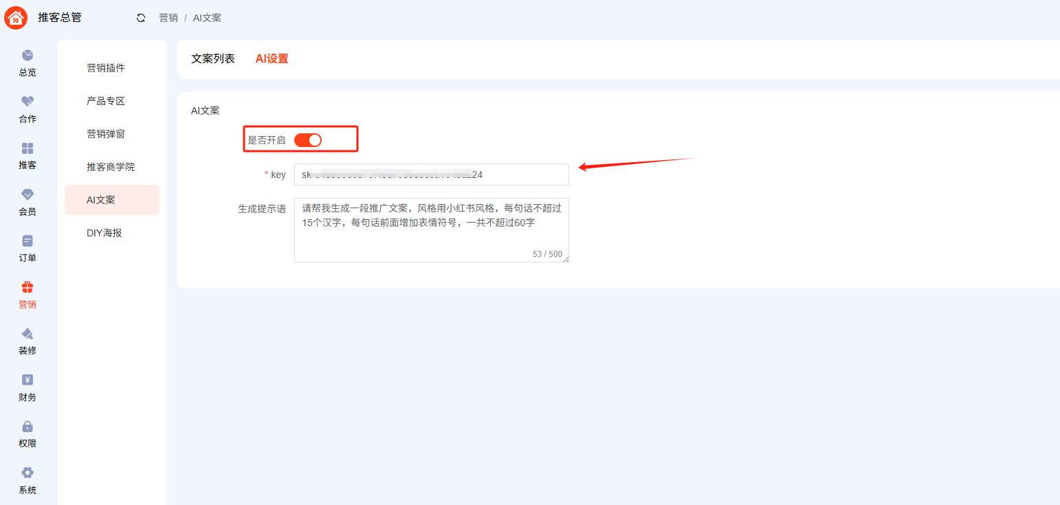 ### 1.登录deepseek官方网站:https://www.deepseek.com/  #### 复制API keys  ### 2.添加到推客系统后台  #### ==添加之后还需要开启产品中间页,才有AI文案推广==