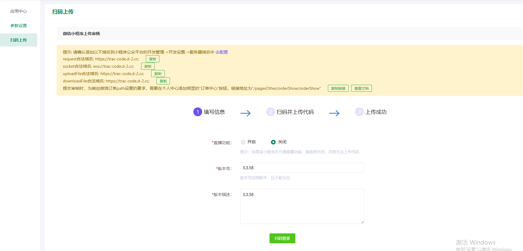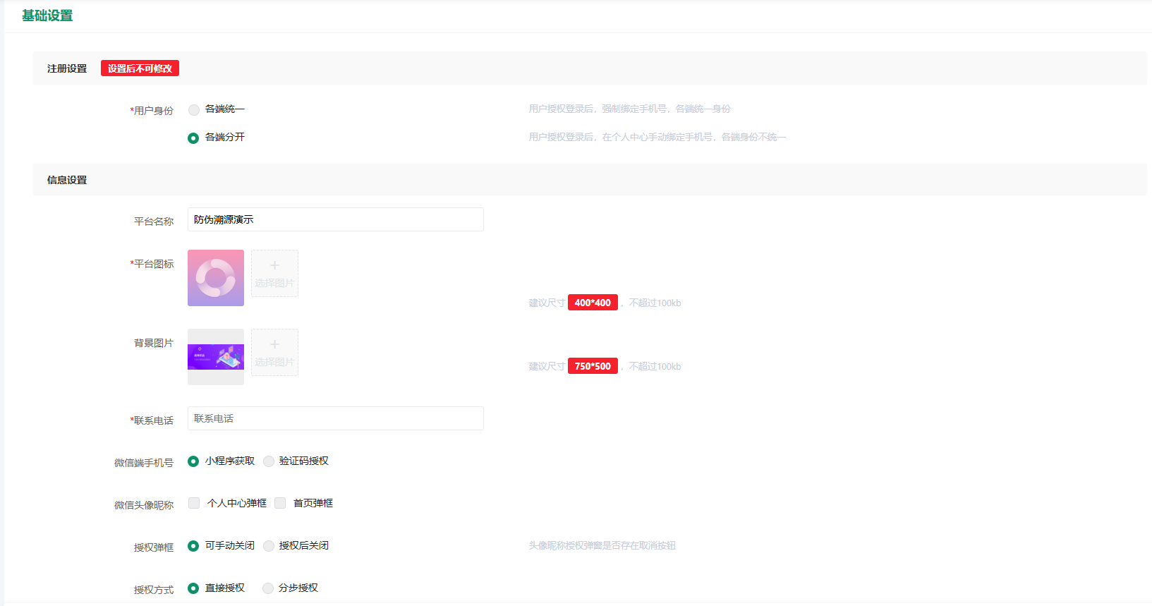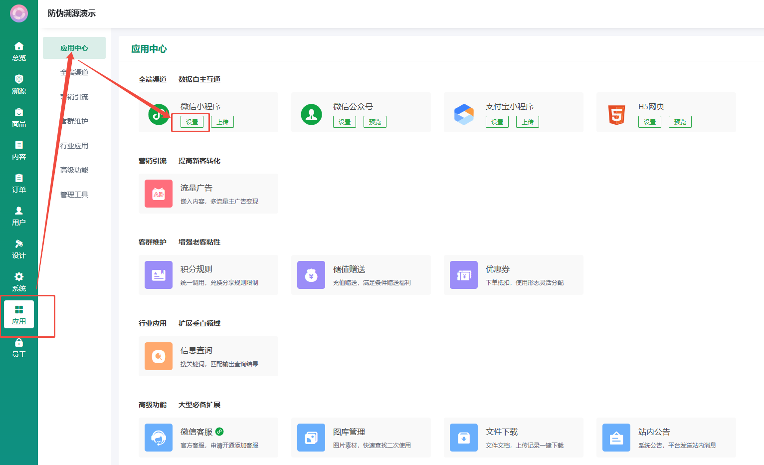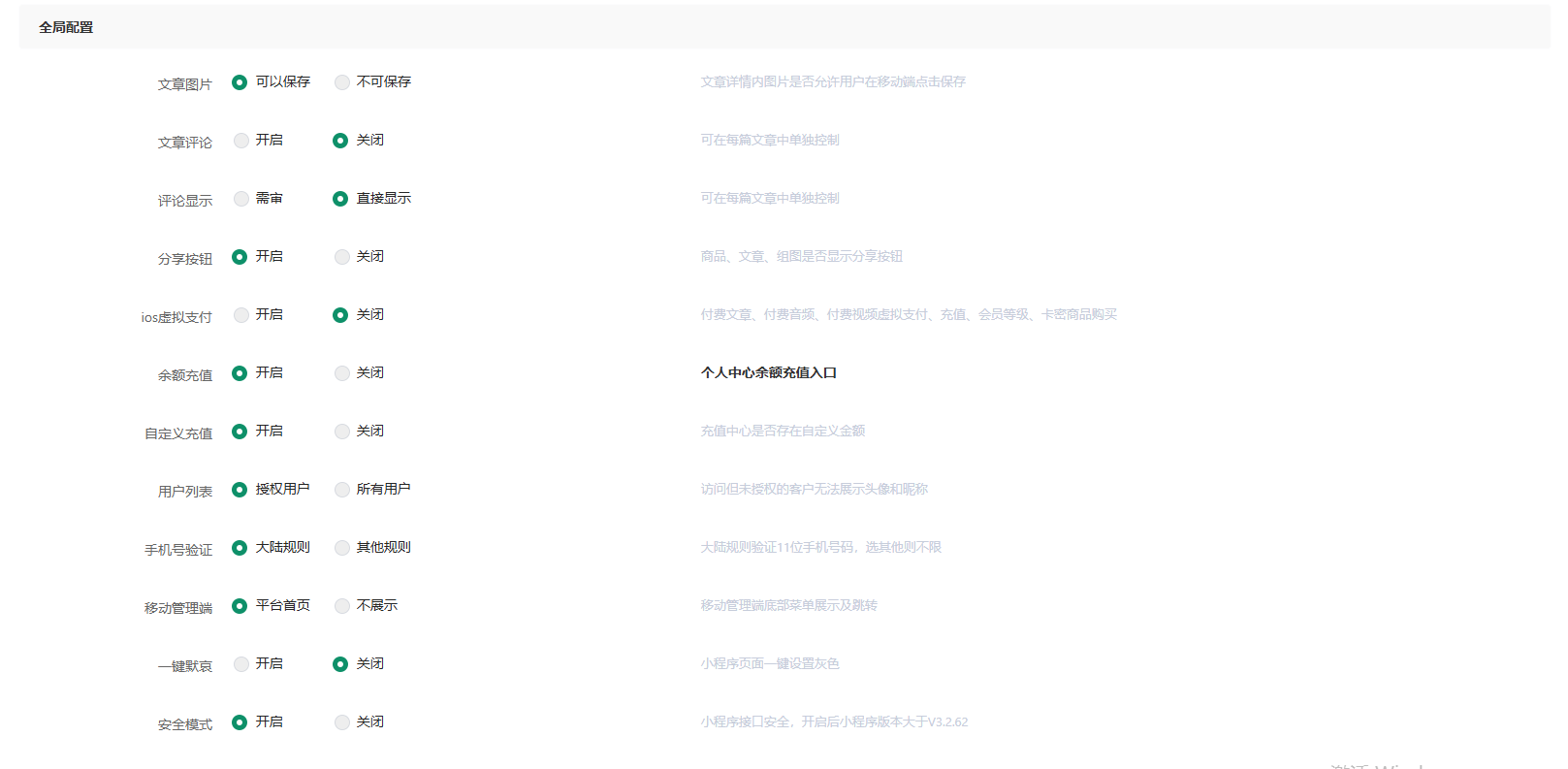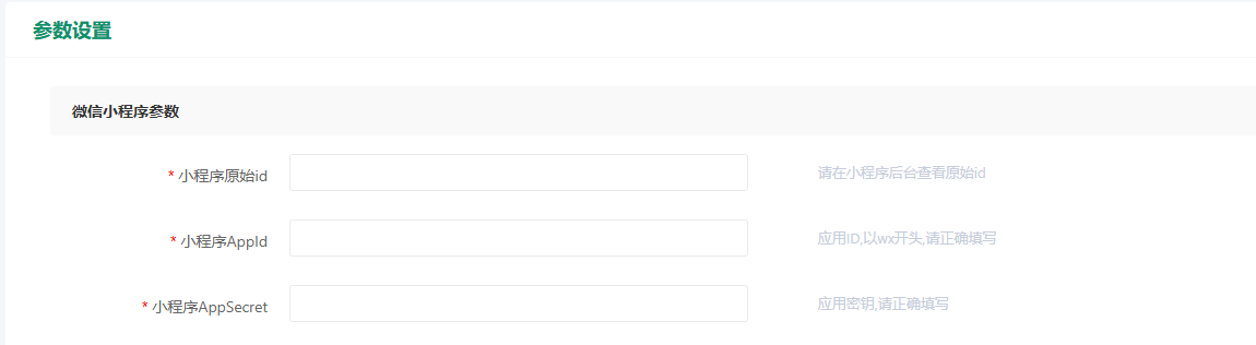 ### 1、系统基础设置 1)、信息设置  2)、短信设置 -系统设置:使用总平台配置的短信参数以及短信数量  -单独设置:项目内配置自己的独立短信,支持阿里云和腾讯云短信  3)、腾讯地图:配置腾讯地图后小程序内才能获取用户位置,点击自行申请跳转腾讯地图官网申请 <span style="color: red">注:微信公众平台,服务器域名(request合法域名)增加:apis.map.qq.com,否则无法定位   4)、全局配置(小程序发布提审之前建议将全局配置内能够关闭的选项都先关闭,待小程序审核通过后再开启)  ### 2、项目内内容添加(商城类的前期只需添加商品,展示类的前期可以只添加文章组图) 1)、商品 -首先添加商品分类   -其次添加商品  2)、内容 -添加文章需先行添加分类后再进行添加文章   ### 3、小程序页面装修 <span style="color: red">建议可以先使用系统自带模版,等小程序上线成功后,再重新调整小程序首页设计、底部菜单栏和个人中心页面  ### 4、小程序应用设置 应用-微信小程序小程序设置页面,配置小程序参数  #### -小程序参数配置  #### -小程序微信支付配置  ### 5、小程序发布上线 打开应用-小程序上传页面,点击扫码登录,上传小程序版本; 上传版本成功后,打开微信公众平台,扫码登录小程序,在版本管理中提交版本审核,审核通过,小程序即可正式上线