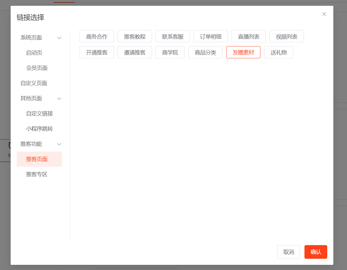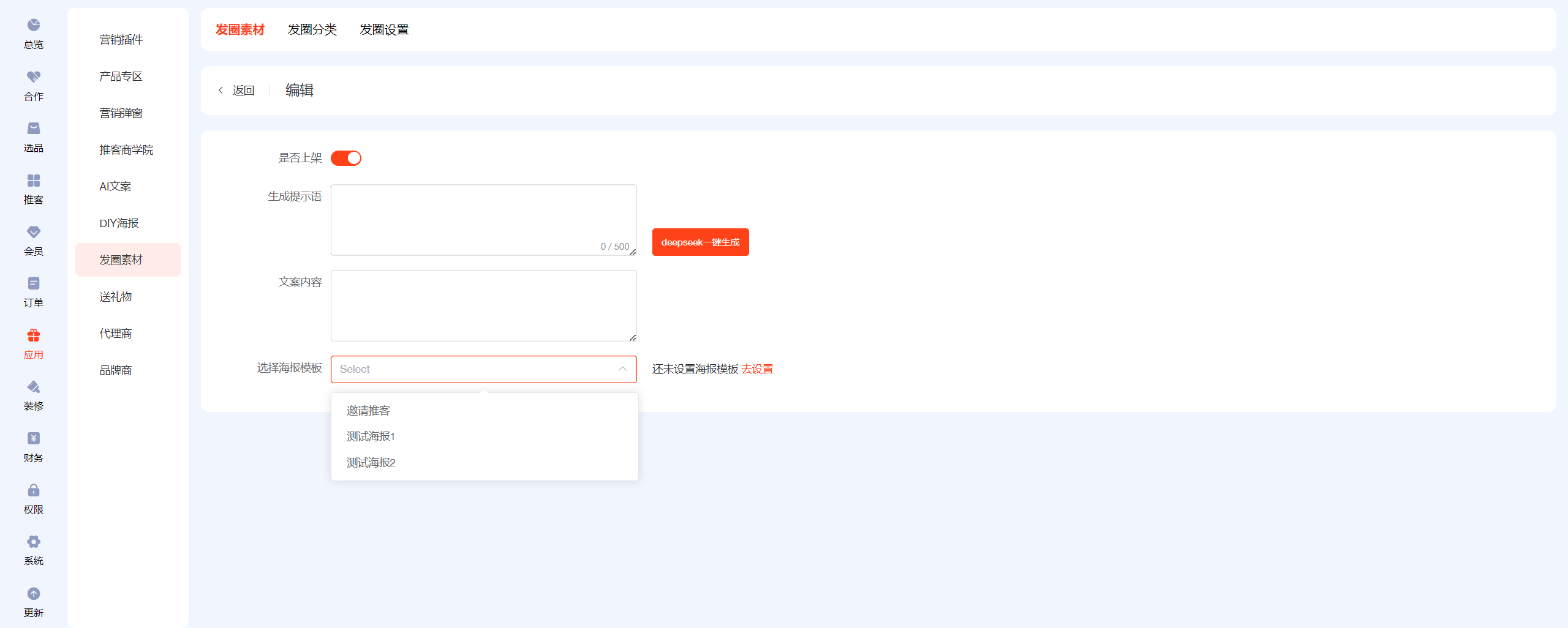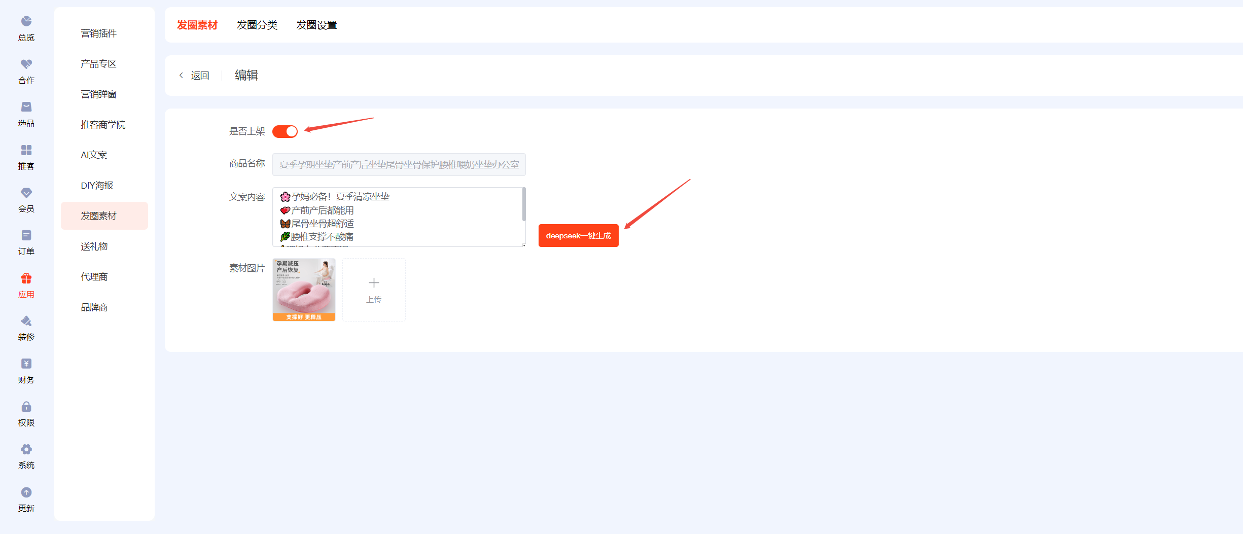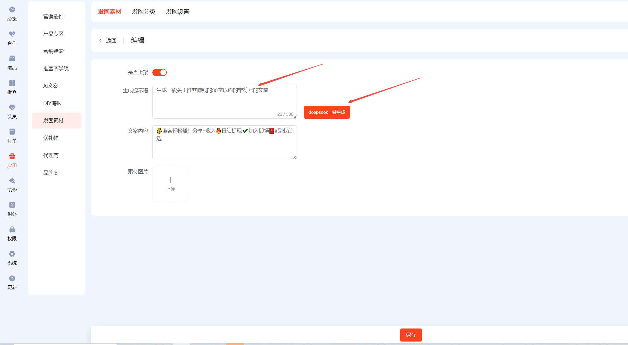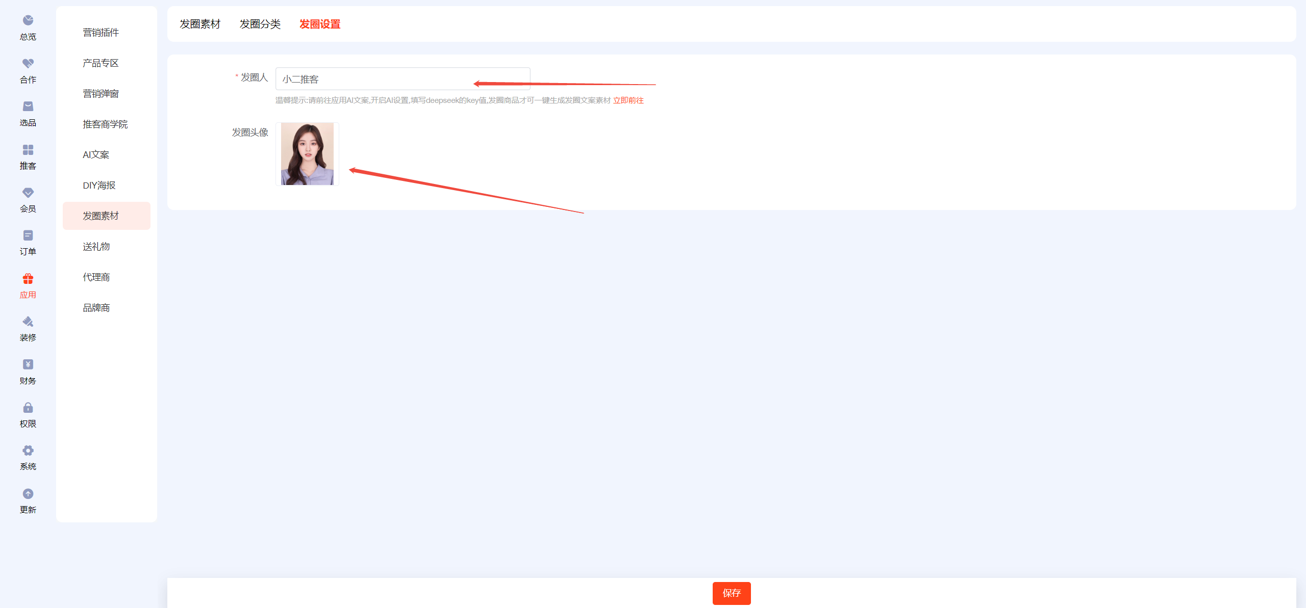 ## 一、前往AI文案,开启AI设置,填写deepseek的key值 ## 二、设置【发圈设置】 先去小程序公众后台添加服务器域名 https://wst.wxapp.tc.qq.com https://store.mp.video.tencent-cloud.com 本次更新小程序公众后台需添加到服务器域名中 小程序后台登录链接:https://mp.weixin.qq.com/   填写发圈人昵称,上传发圈头像  ## 三、发圈素材分三类:商品发圈素材、宣发素材、锁粉素材 ## 四、商品发圈素材:文案+图片+商品链接(商品链接可帮助推客锁粉) 选择添加发圈商品  添加到列表后,进入编辑  开启上架,点击deepseek一键生成,保存  ## 五、宣发素材:文案+图片 添加素材,自己自定义生成提示语,用AI生成推广文案,自定义上传图片  ## 六、锁粉素材:文案+海报(海报中的二维码可帮助推客锁粉) 在DIY海报应用中,新建海报,选择海报类型为【推客邀请海报】  锁粉素材中新建素材,填写生成提示语生成文案,选择海报模板(可多选)  ## 七、发圈分类 每日爆品推荐、宣发素材、锁粉素材为固定发圈分类,不可更改且不能排序 新建的自定义发圈分类,为商品分类   ## 八、如何链接 1、可在装修--底部导航--新增【发圈】菜单,选择链接【发圈素材】 2、可在装修中,图文导航的按钮链接到【发圈素材】